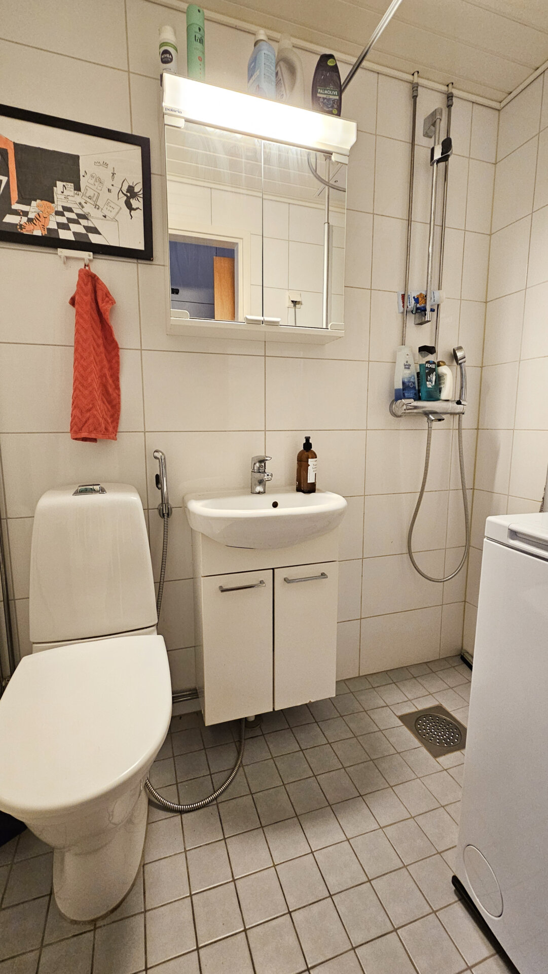 - Varusteet: Pesukoneliitäntä, wc-istuin, suihku, peilikaappi, kylpyhuonekaapisto