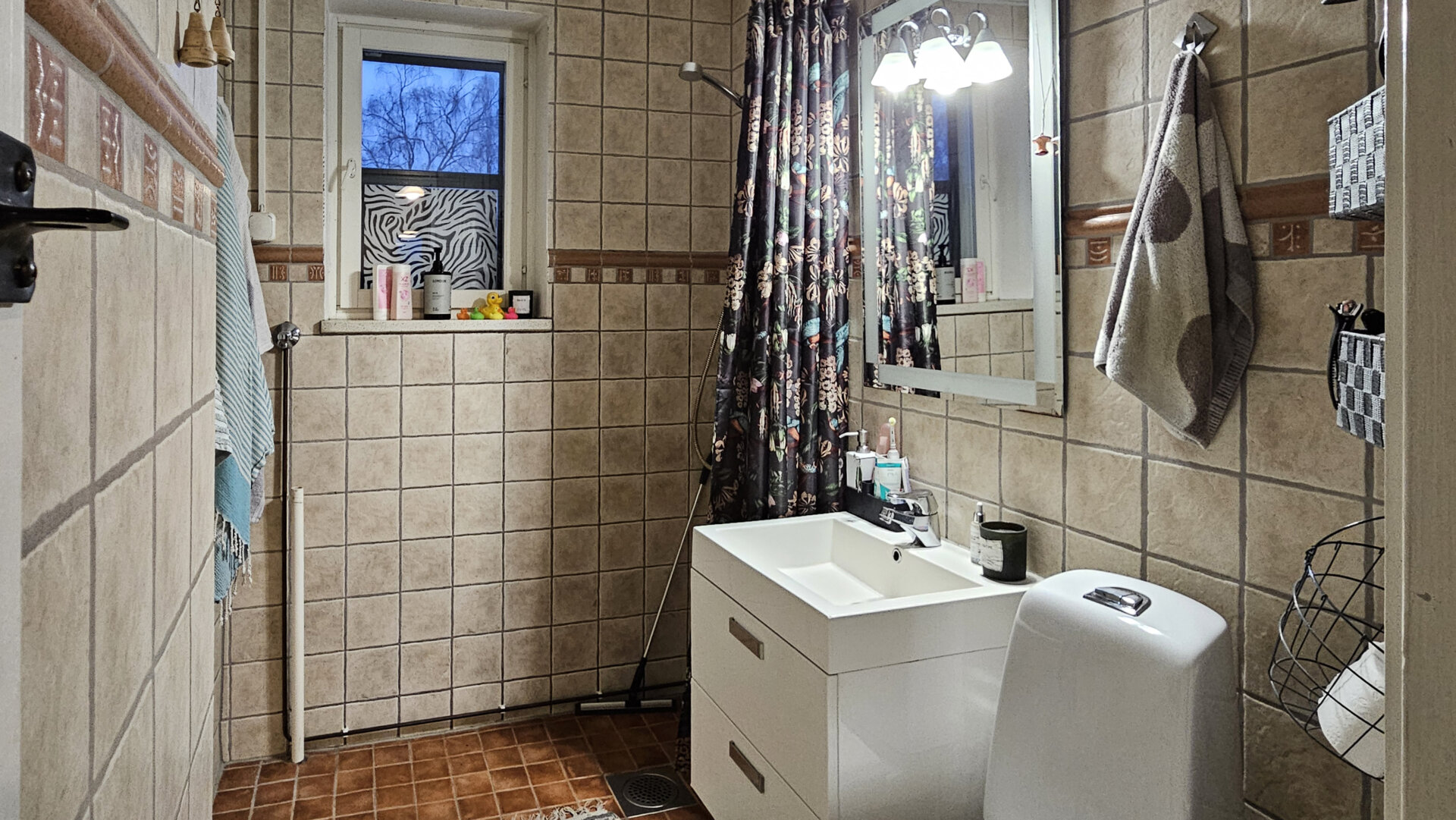 - Varusteet: Pesukoneliitäntä, suihku, peili, kylpyhuonekaapisto
