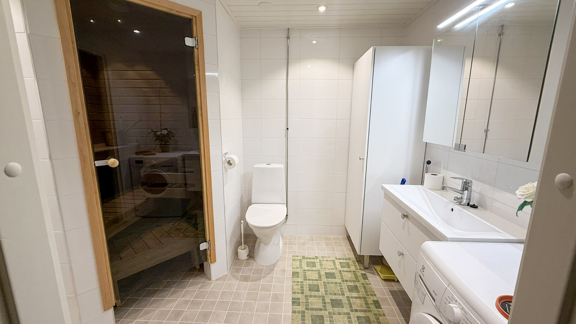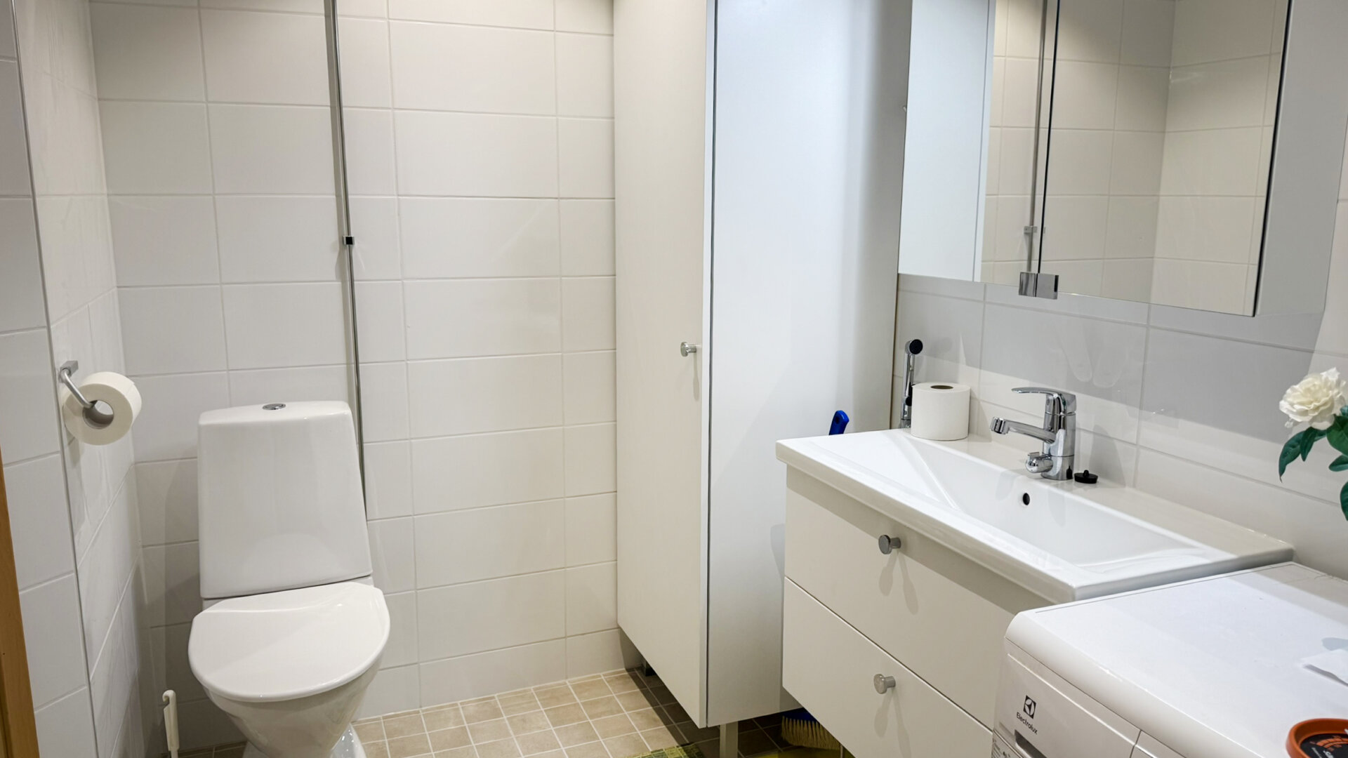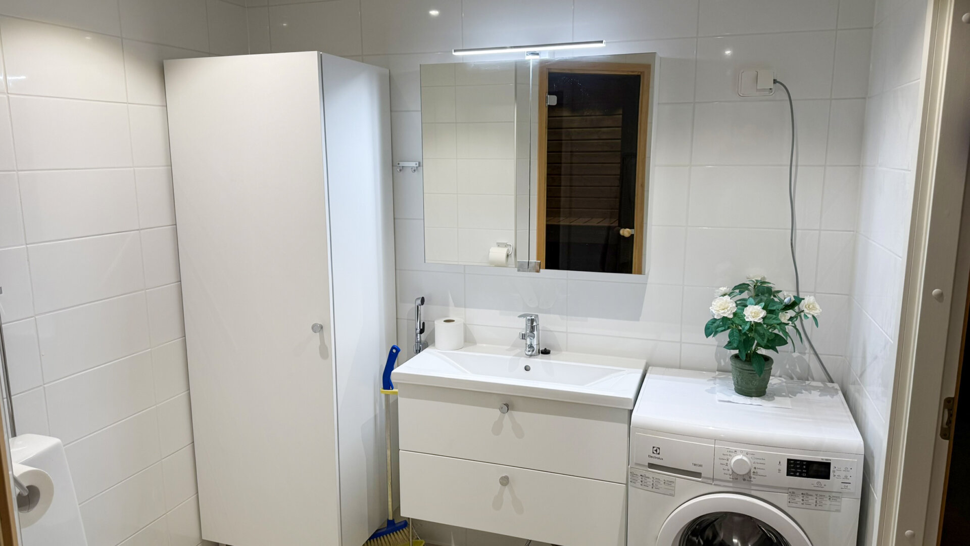- Varusteet: Pesukoneliitäntä, lattialämmitys, wc-istuin, suihku, peilikaappi, kylpyhuonekaapisto