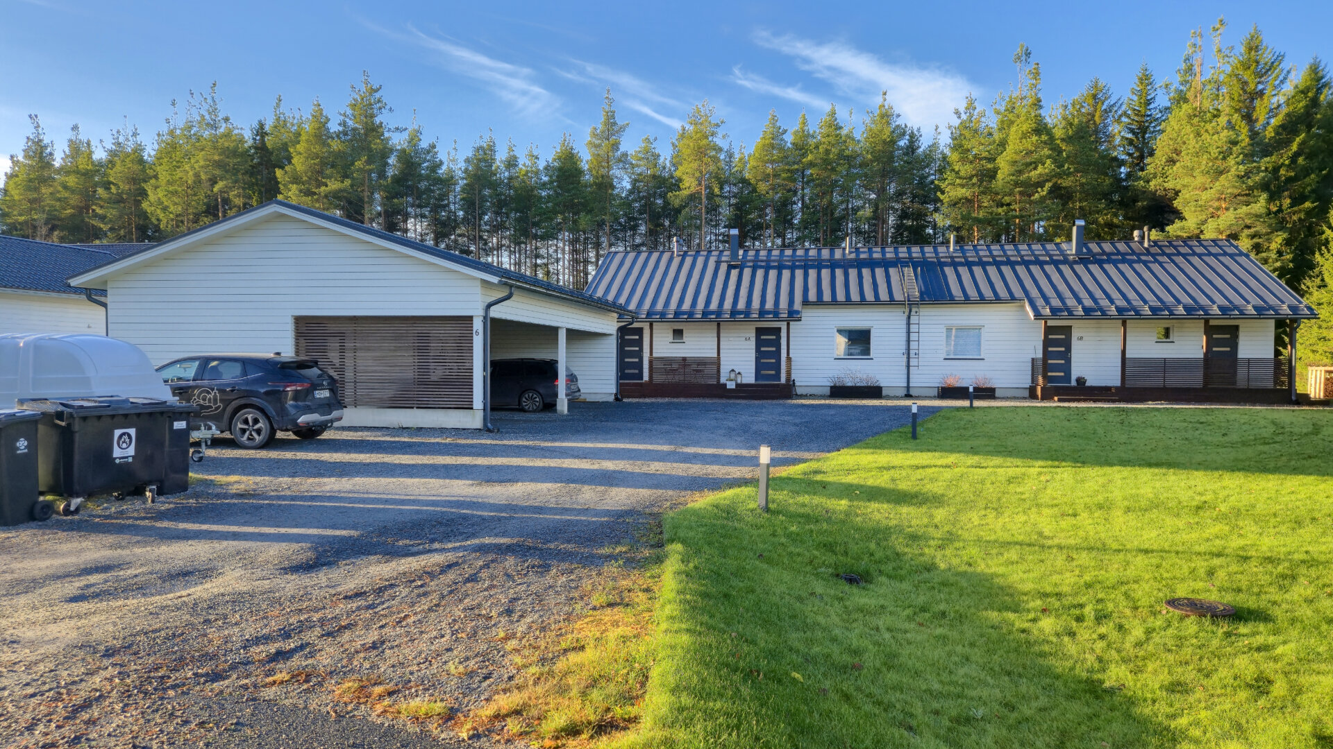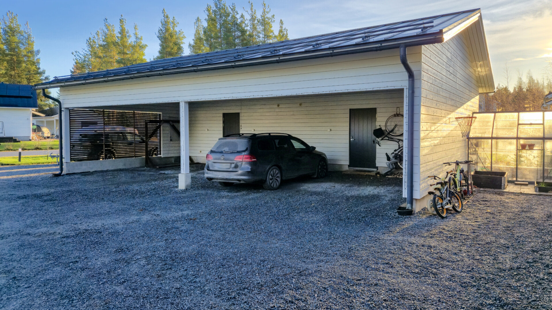Asunnon vieressä on erillinen autokatos, jossa on tilaa yhteensä neljälle autolle (kaksi per huoneisto) sekä suuri varasto, noin 14,3 m².