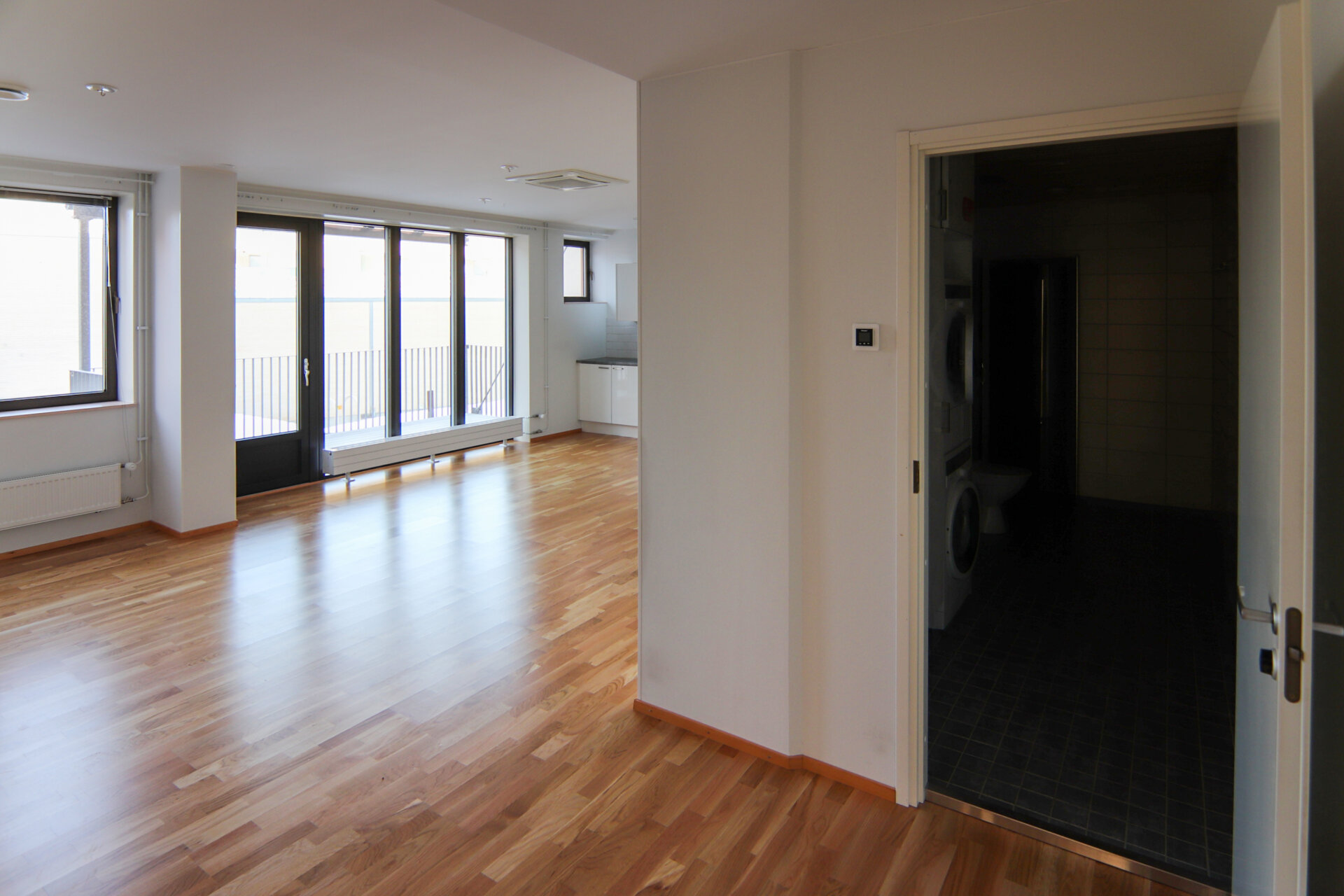 • Varusteet: Suihkuseinä, pesukone, kuivausrumpu, pesukoneliitäntä, wc-istuin, suihku, peili, kiinteät valaisimet