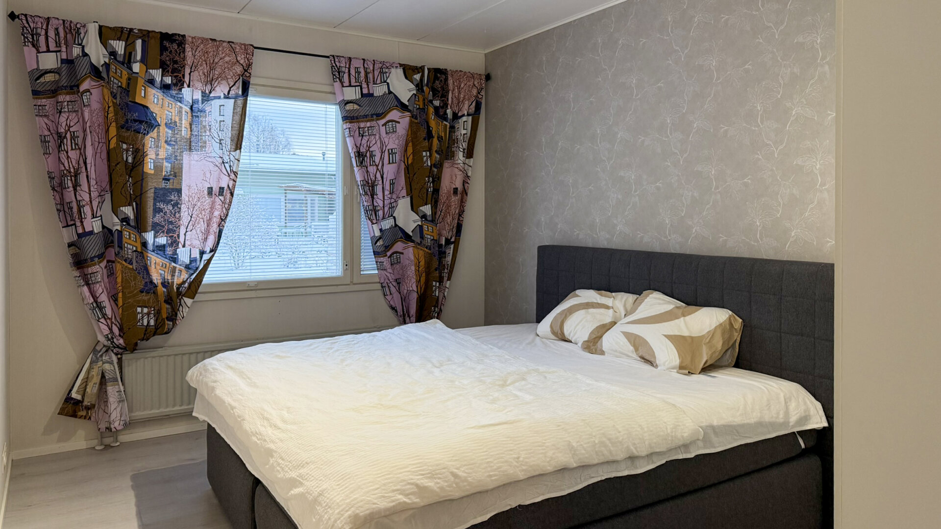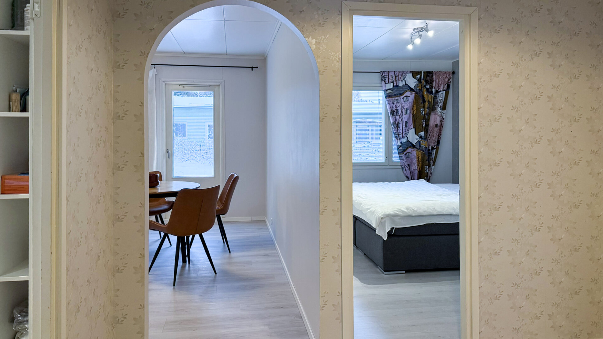 Bostaden har två sovrum och ett rymligt vardagsrum, varifrån man kommer ut till terrassen och bakgården. Köket har blivit renoverat 2018 och i badrummet har man förnyat inredningen år 2021 och hösten 2025 har ytrenoveringar utförts med bla delvist förnyade golvbeläggningarna.