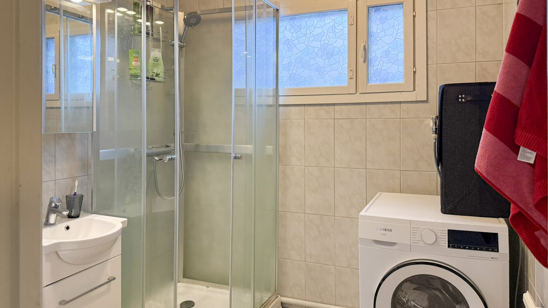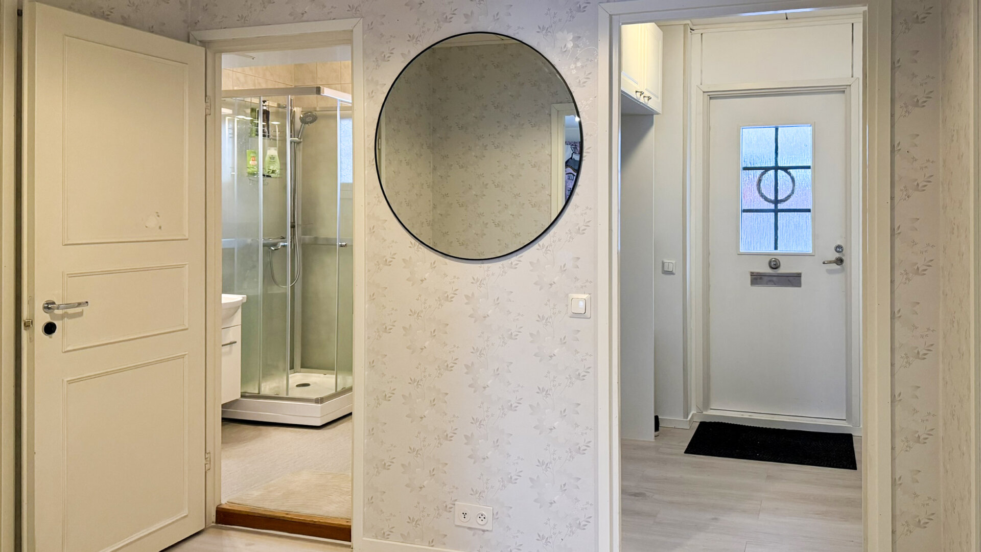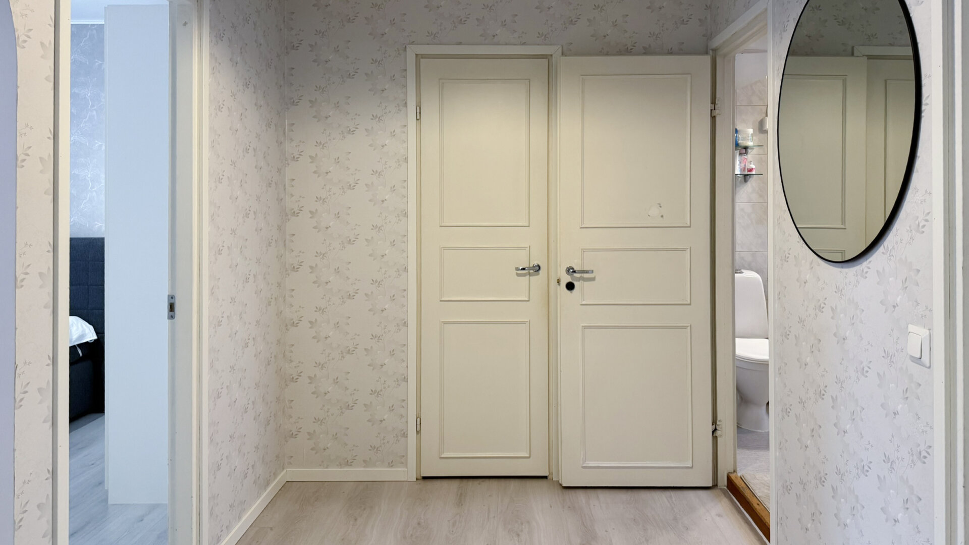• Varusteet: Suihkukaappi, pesukoneliitäntä, wc-istuin, peilikaappi, kiinteät valaisimet, kylpyhuonekaapisto