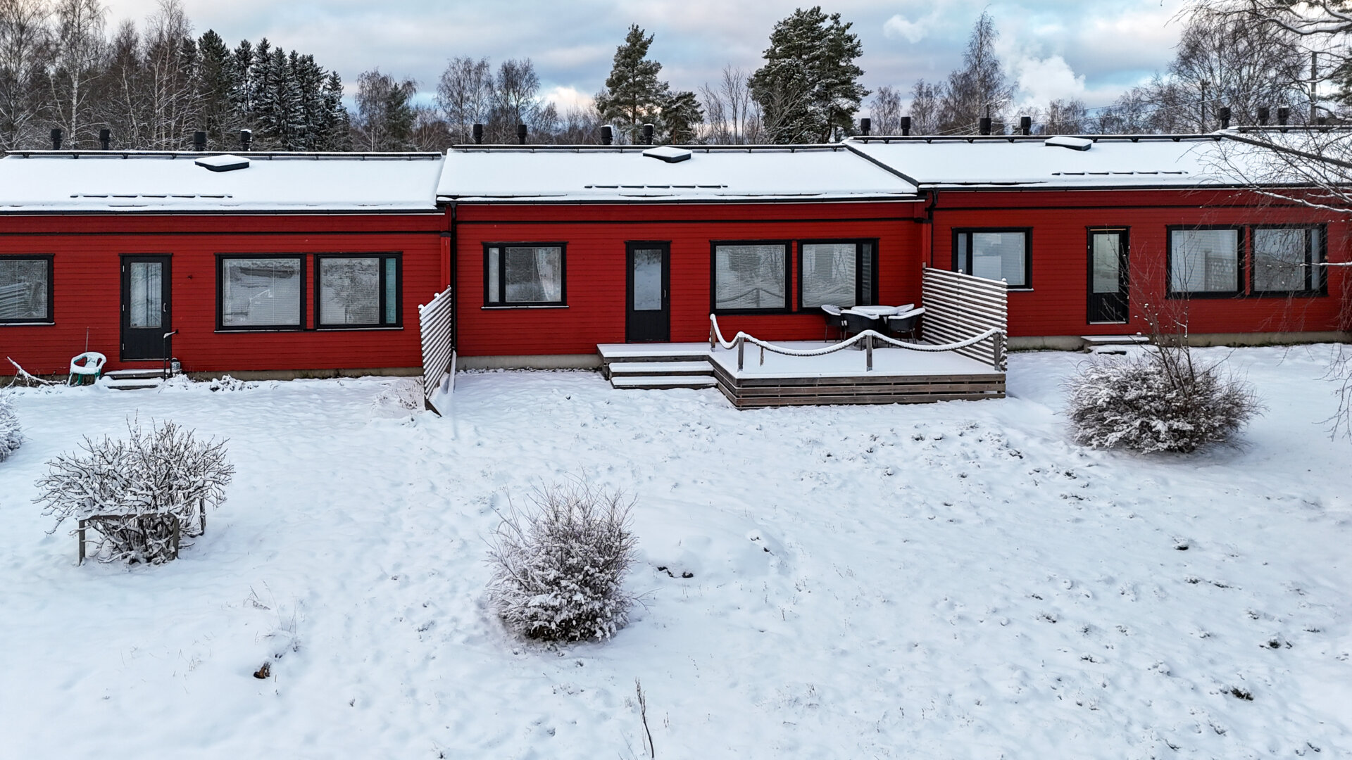 - Etupuolen terassi luoteeseen päin, takaterassi kaakkoon päin.