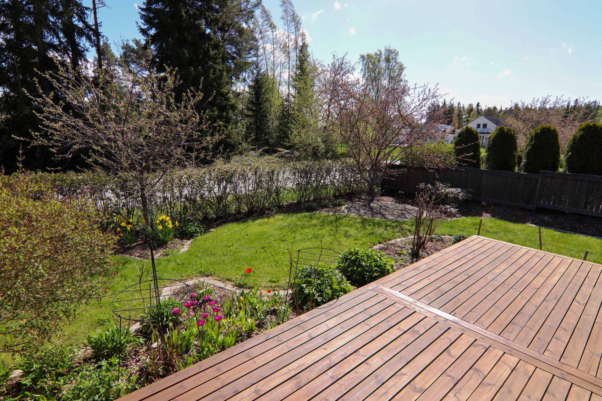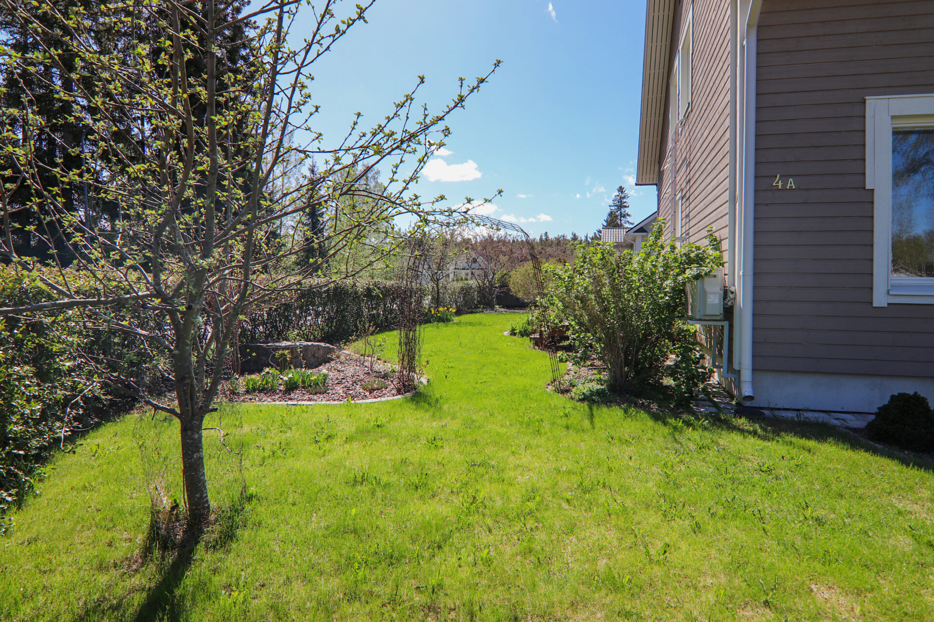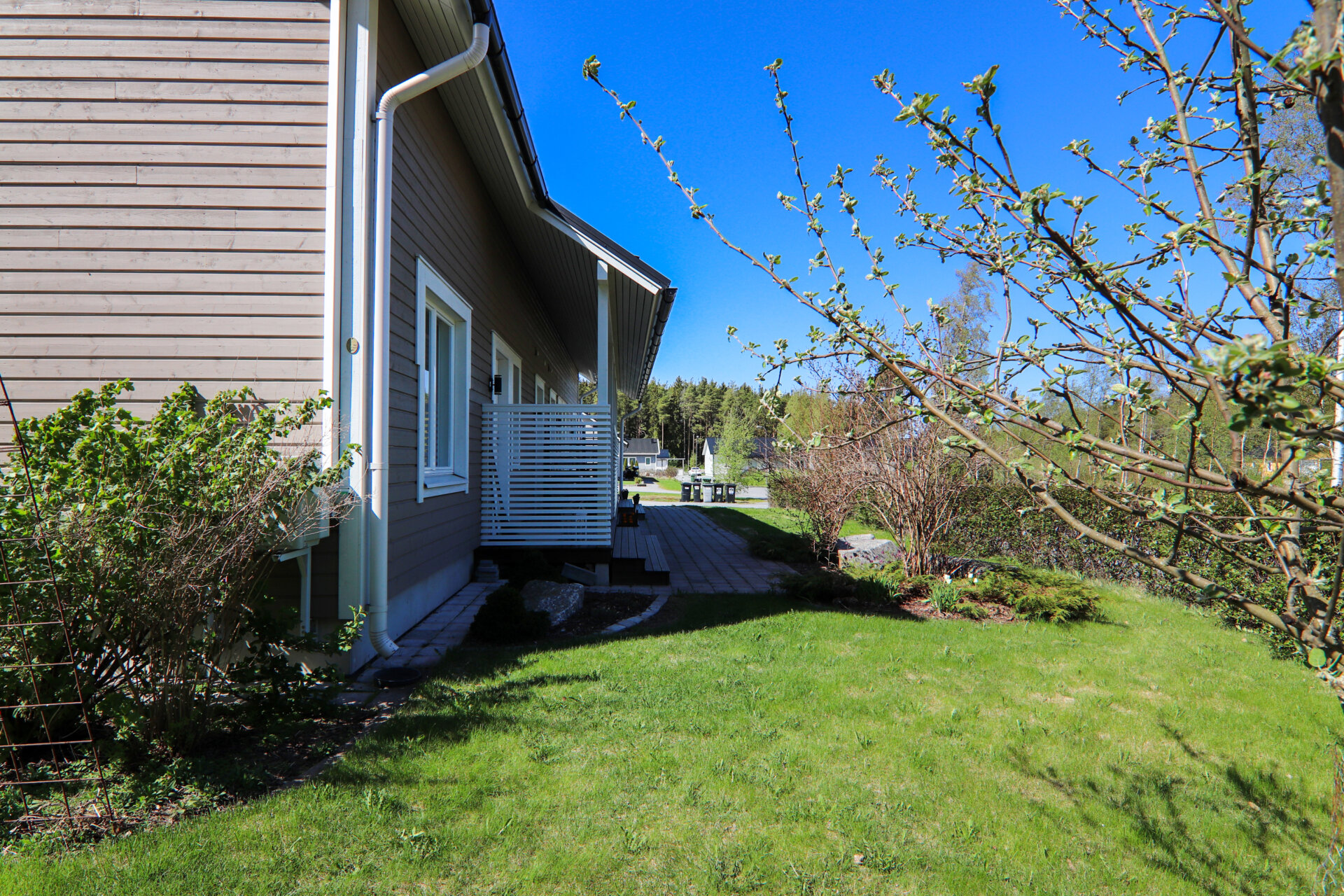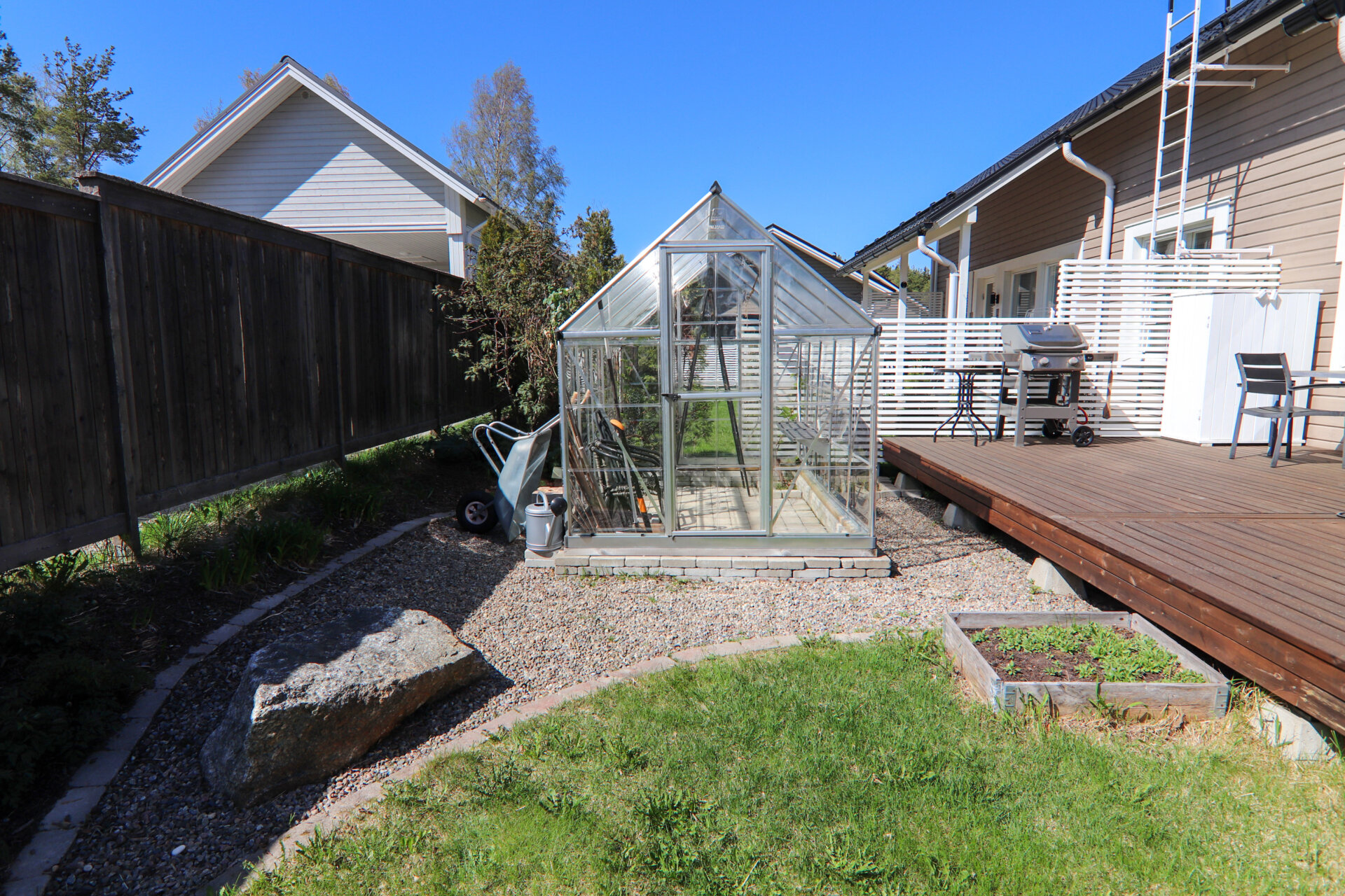 Pihalla on kaunis ja huolella suunniteltu Sundin puutarhan toteuttama puutarha, aurinkoinen noin 63 m² terassi sekä kasvihuone viljelyharrastajalle. Säilytystilaa on runsaasti kahdessa varastossa, joista toinen sijaitsee asunnon yhteydessä ja toinen autokatoksen yhteydessä.