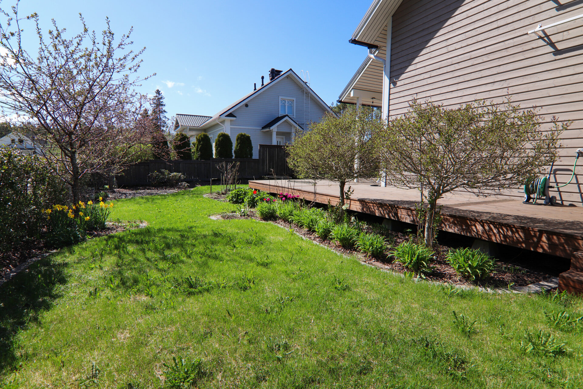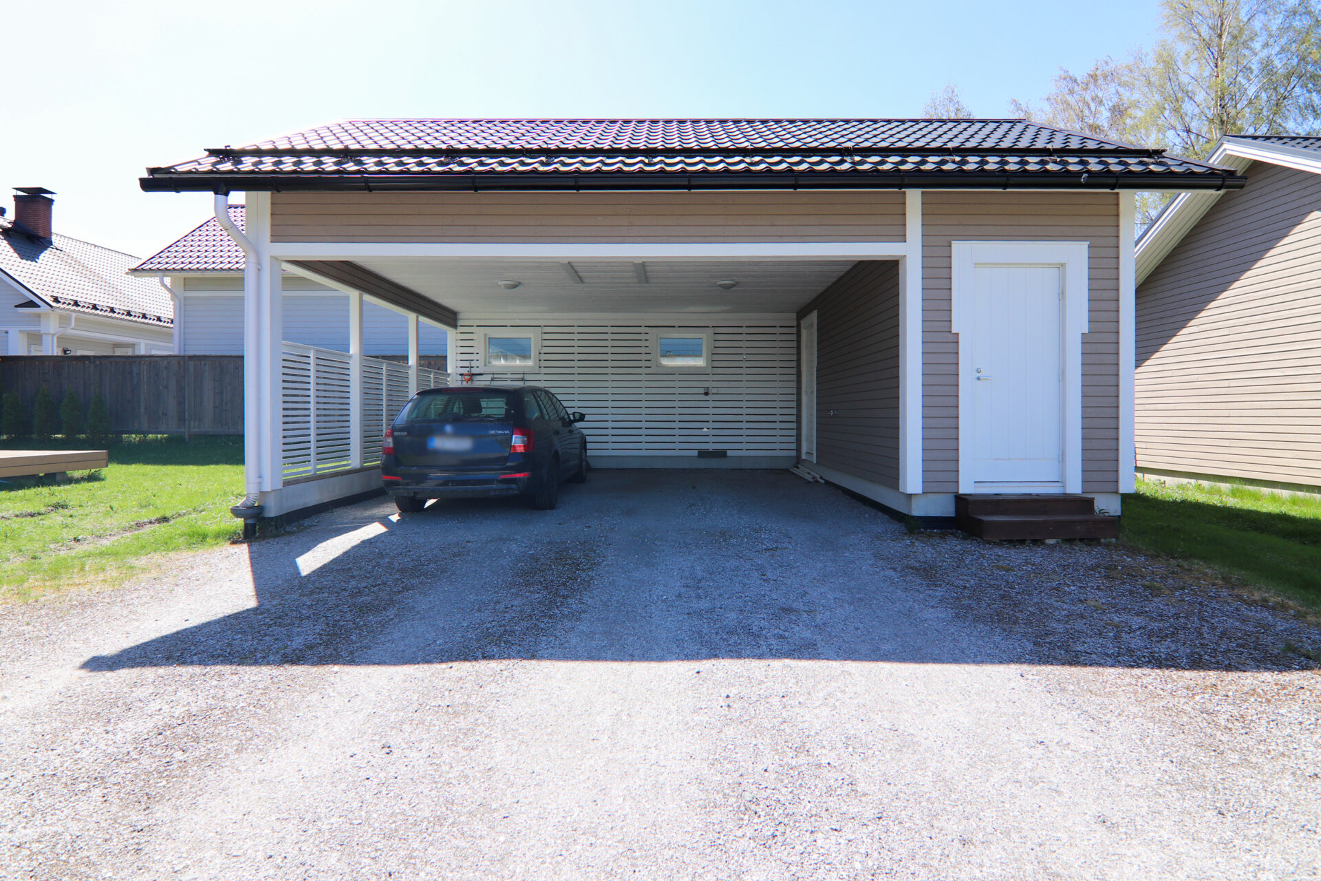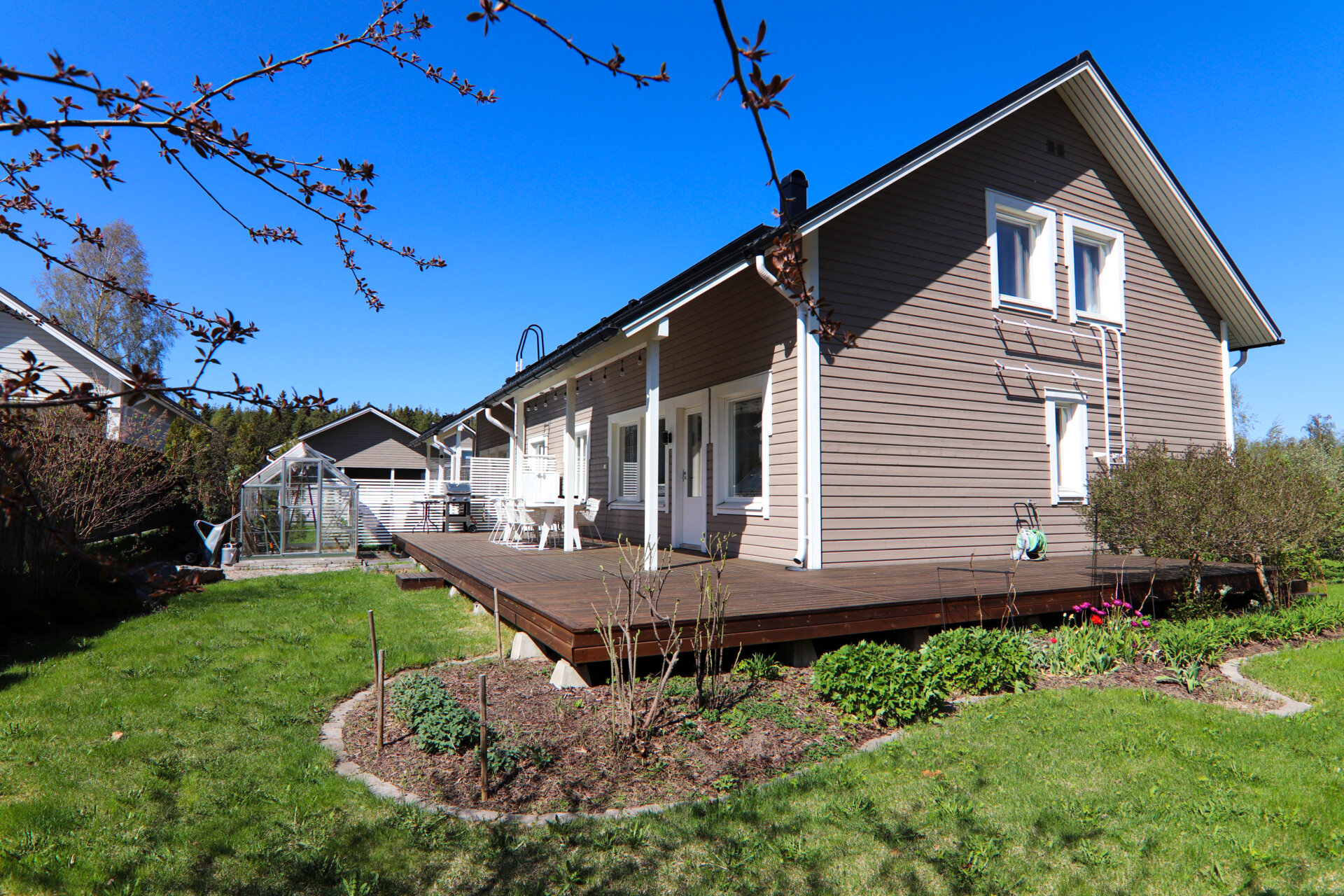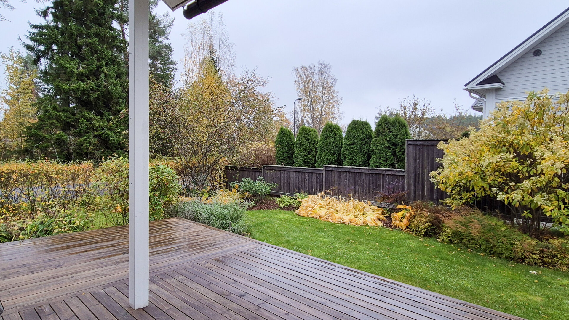 Pihalla on kaunis ja huolella suunniteltu Sundin puutarhan toteuttama puutarha, aurinkoinen noin 63 m² terassi sekä kasvihuone viljelyharrastajalle. Säilytystilaa on runsaasti kahdessa varastossa, joista toinen sijaitsee asunnon yhteydessä ja toinen autokatoksen yhteydessä.