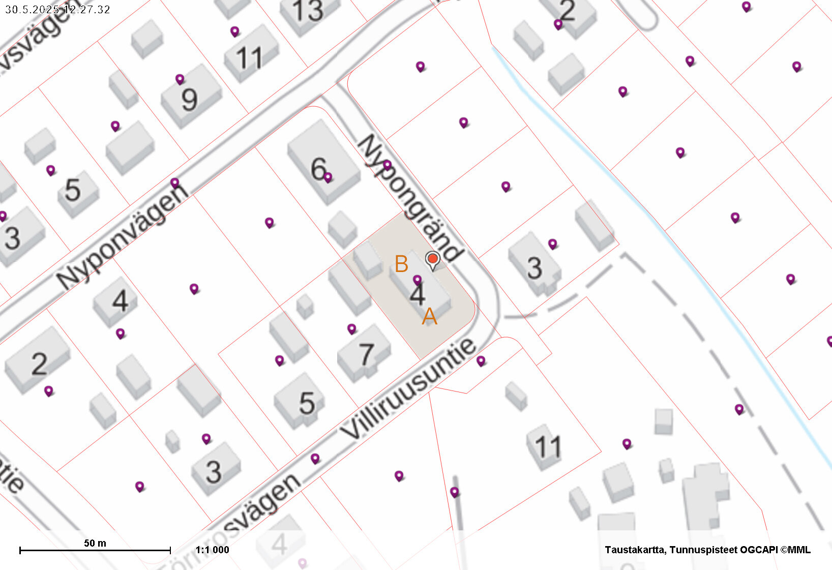 - Yhteisomisteinen tontti (4A, 4B). Tontti yhteensä 1.110 m2. Vuokran määra 4 A: 403,31 €/v.