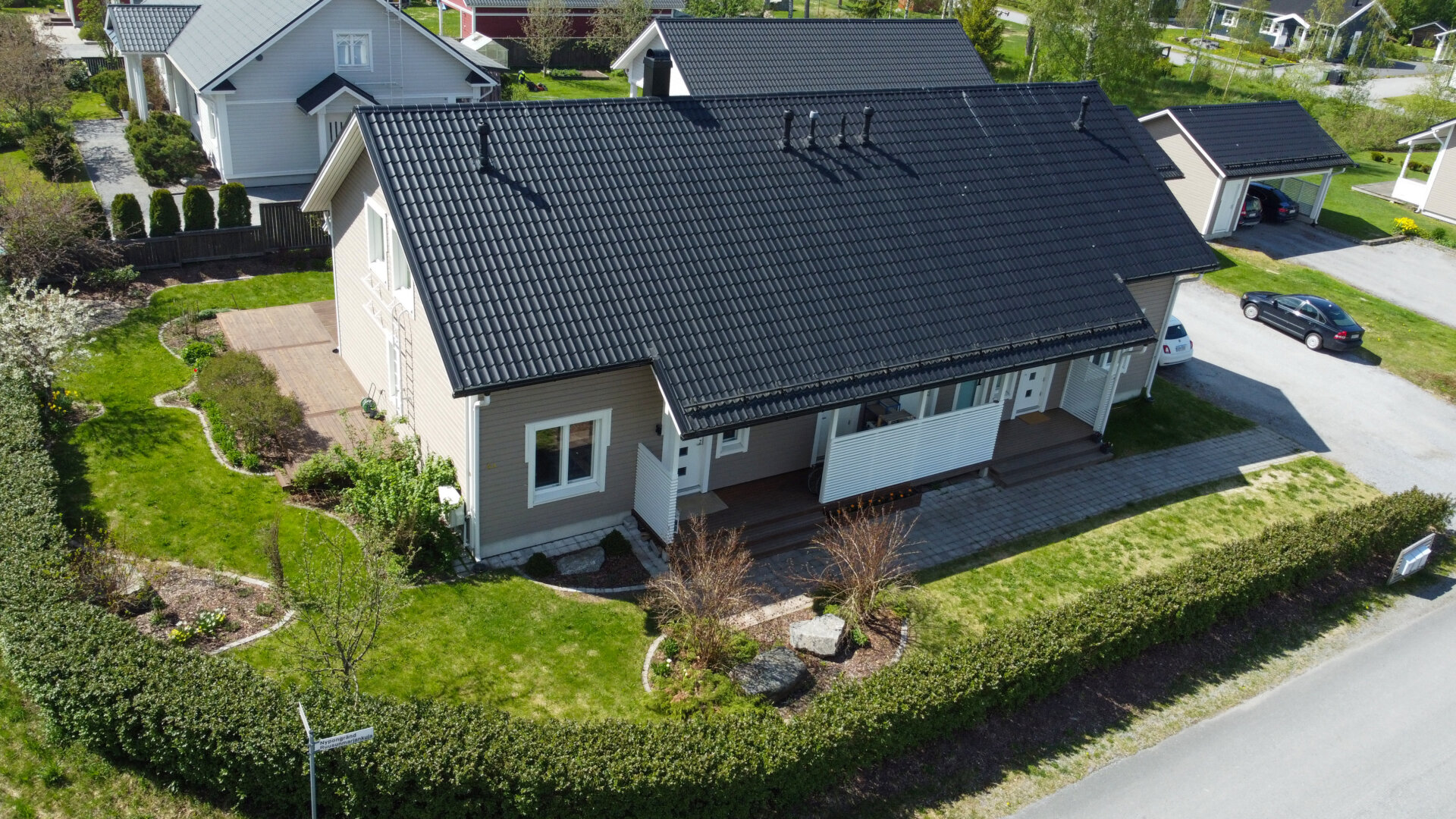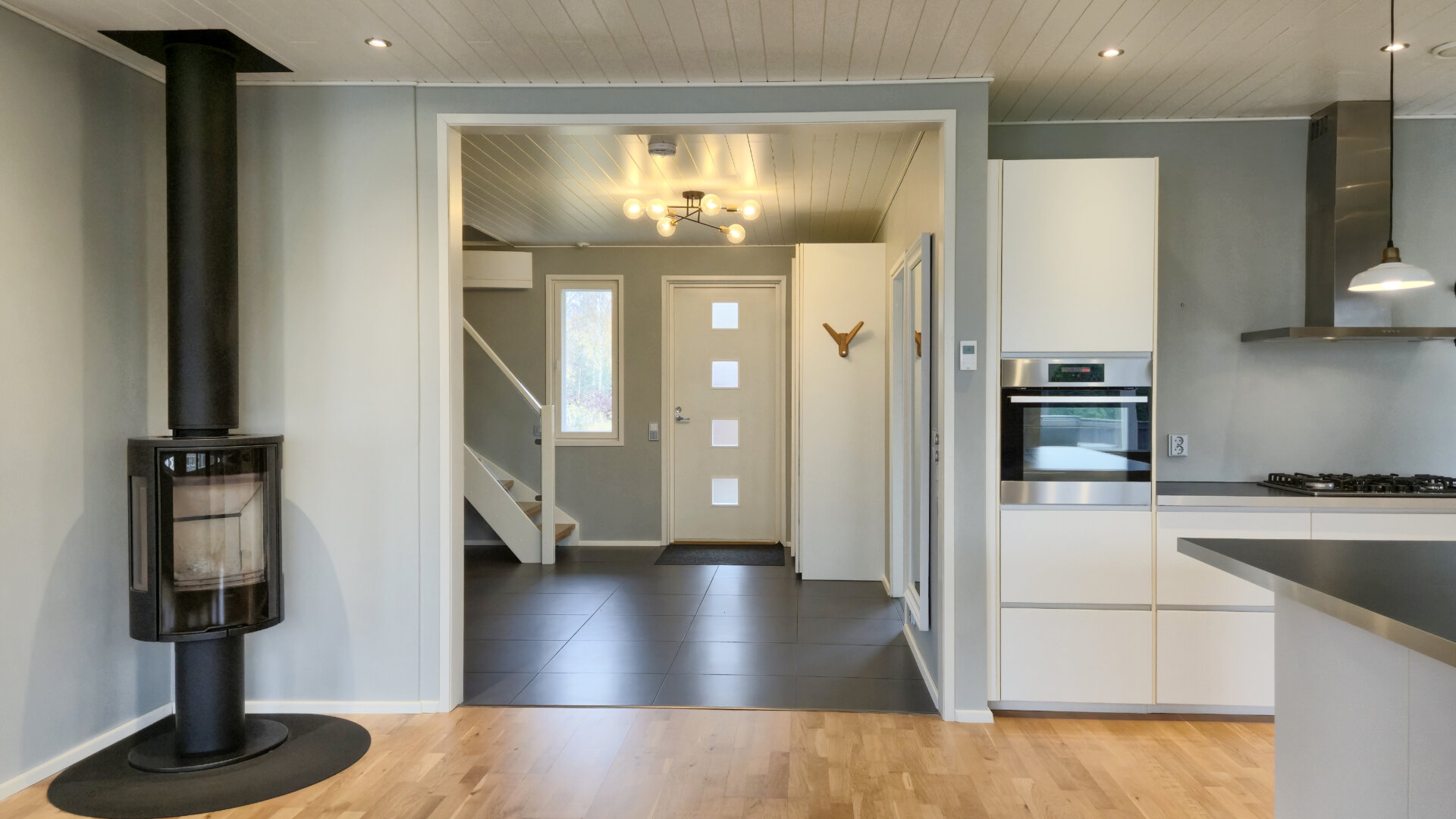 Den här bostaden kombinerar funktionalitet, rymd och stil på bästa sätt med sin öppna planlösning och rikliga ljusinsläpp. Bostaden värms effektivt upp med luft-vattenvärmepump och hela nedre våningen har vattenburen golvvärme, dessutom finns en vedspis i vardagsrummet samt kylning i bägge våningarna.