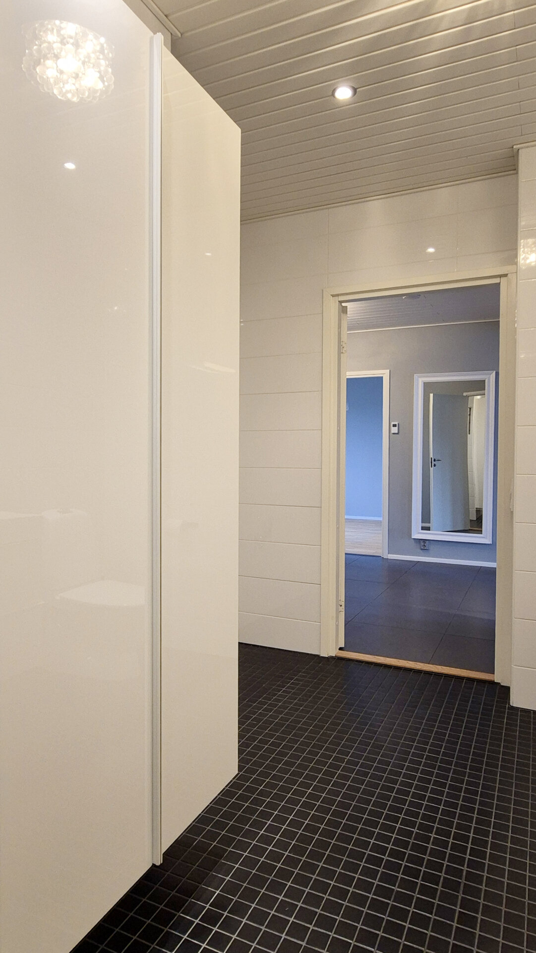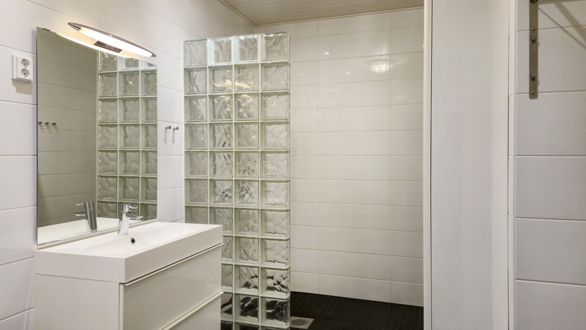 - Varusteet: Suihkuseinä, pesukoneliitäntä, lattialämmitys, wc-istuin, suihku, peili, kiinteät valaisimet, kylpyhuonekaapisto