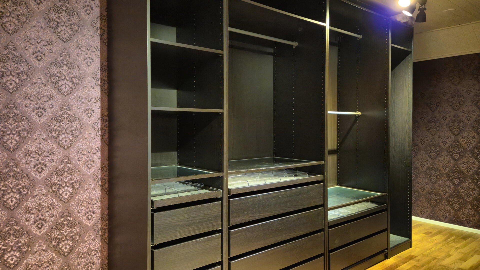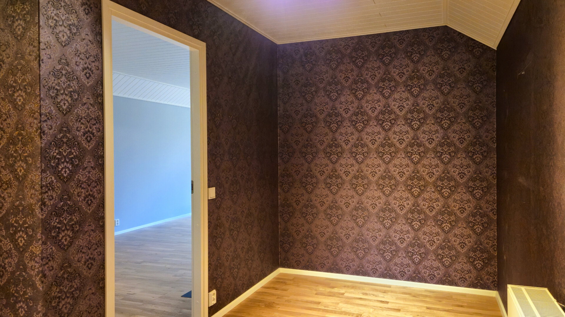 Även på övre våningen fortsätter temat med de öppna ytorna då hela våningen är ett enda stort sovrum, som vid behov enkelt kunde delas av till två separata rum om det skulle behövas. Sovrummets guldkorn är den stora walk-in garderoben. En lyxig och praktisk lösning med gott om plats för hela garderoben.