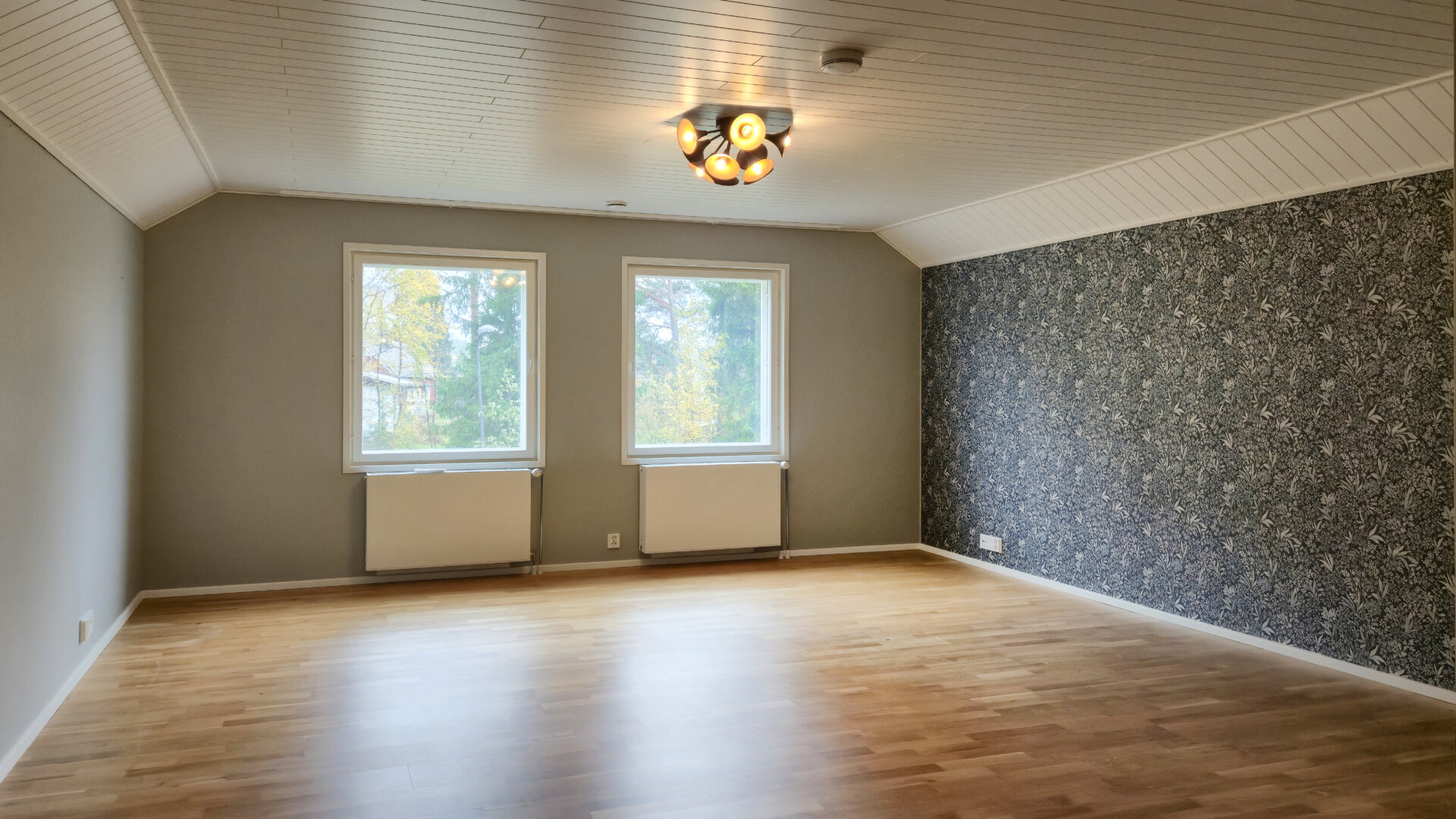 Yläkerrassa avoimuuden teema jatkuu, sillä koko kerros on yhtä suurta makuuhuonetta, joka on tarvittaessa helposti jaettavissa kahdeksi erilliseksi huoneeksi. Makuuhuoneen helmi on suuri vaatehuone ylellinen ja käytännöllinen ratkaisu, jossa on runsaasti säilytystilaa koko vaatekaapille.
