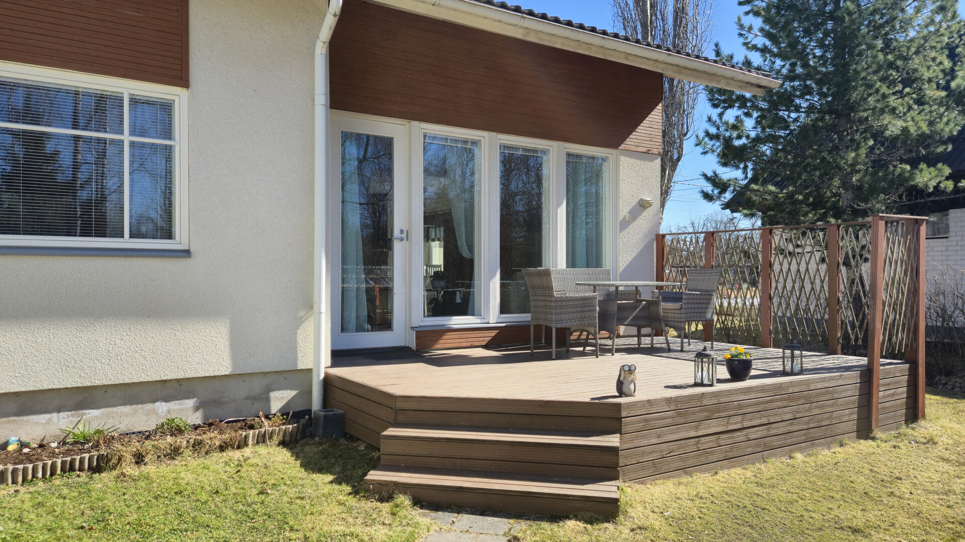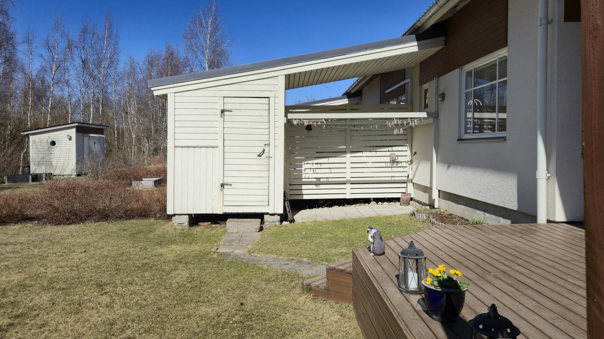 Aurinkoinen länteen suuntautuva piha-alue, jossa terassi ja varasto sekä hyvät mahdollisuudet istutuksille ja viljelylle. Asuntoon kuuluu myös lämmin 18 m²:n autotalli sekä varasto. Taloyhtiöllä on lisäksi yhteinen robottiruohonleikkuri.