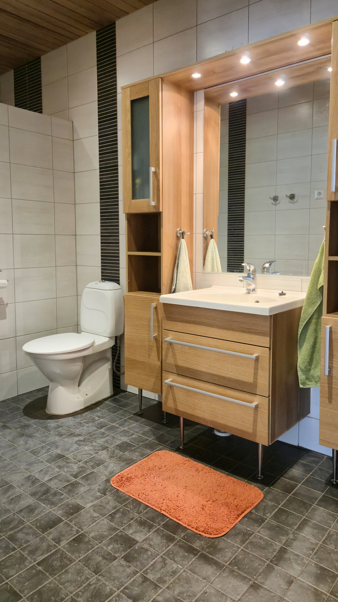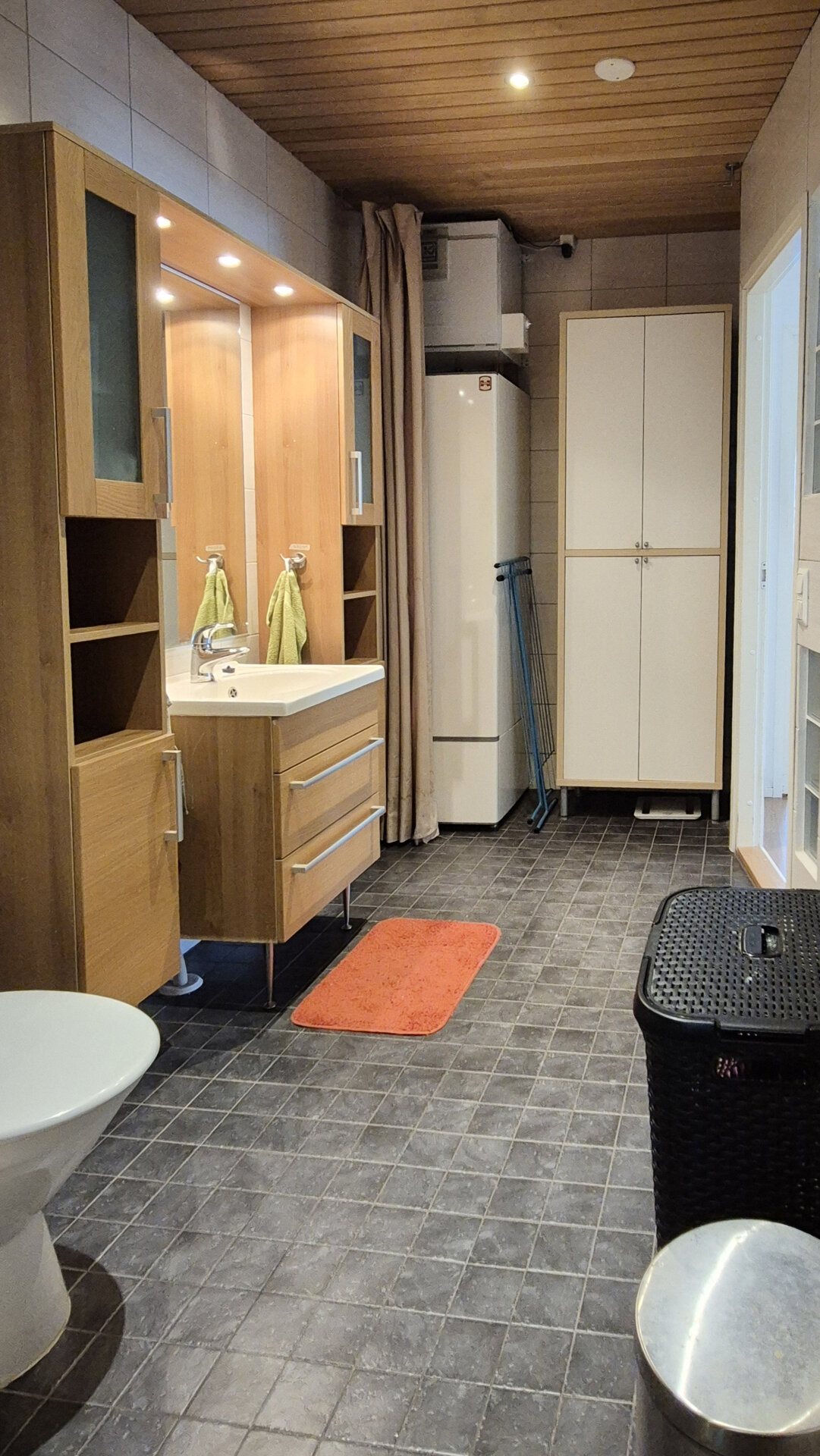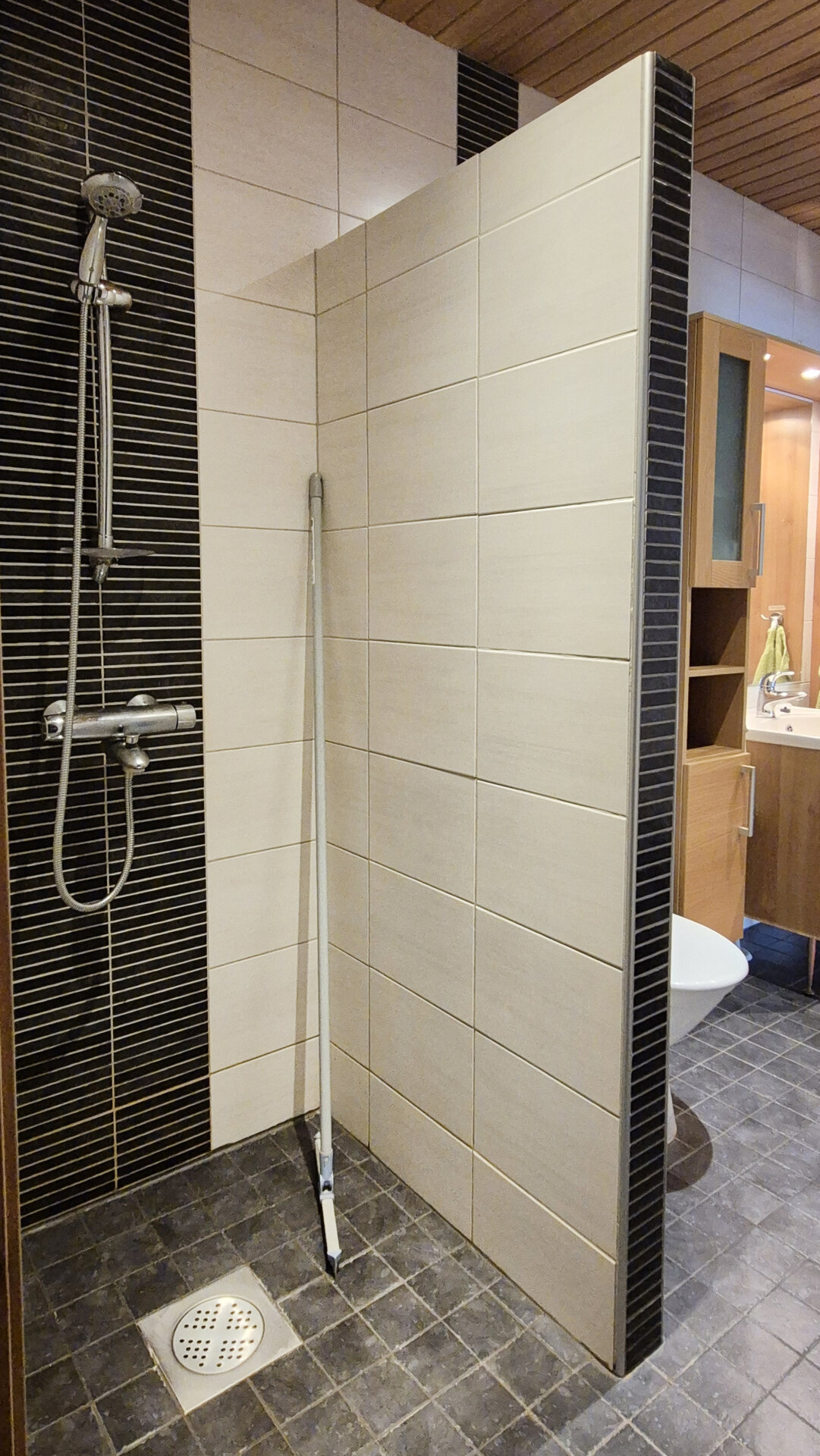 - Varusteet: Suihkuseinä, lattialämmitys, wc-istuin, suihku, peili, kiinteät valaisimet