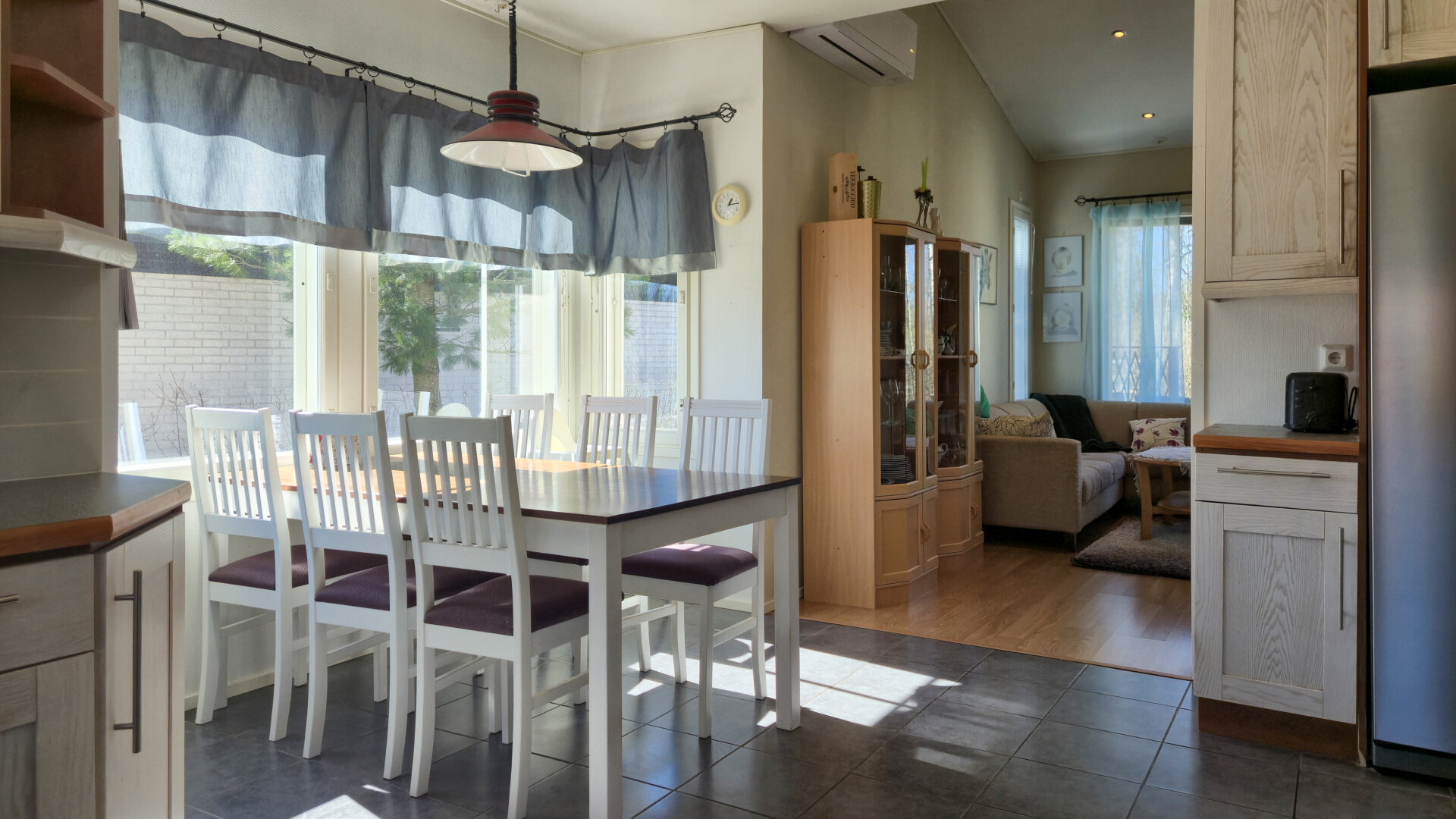 Det här radhuset med totalt tre bostäder är byggt 2006. Bostaden är 101,5 m2 och består av två sovrum, vardagsrum, ett rymligt kök, hjälpkök, badrum och bastu. Öppen planlösning med rikligt ljusinsläpp och förhöjt innertak i vardagsrummet, som ger en härlig känsla av rymd.
