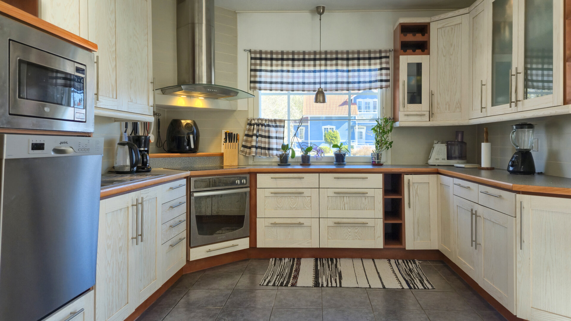 - Varusteet: Pakastin, pakastekaappi, Liesituuletin, mikroaaltouuni, astianpesukone, kiinteät valaisimet