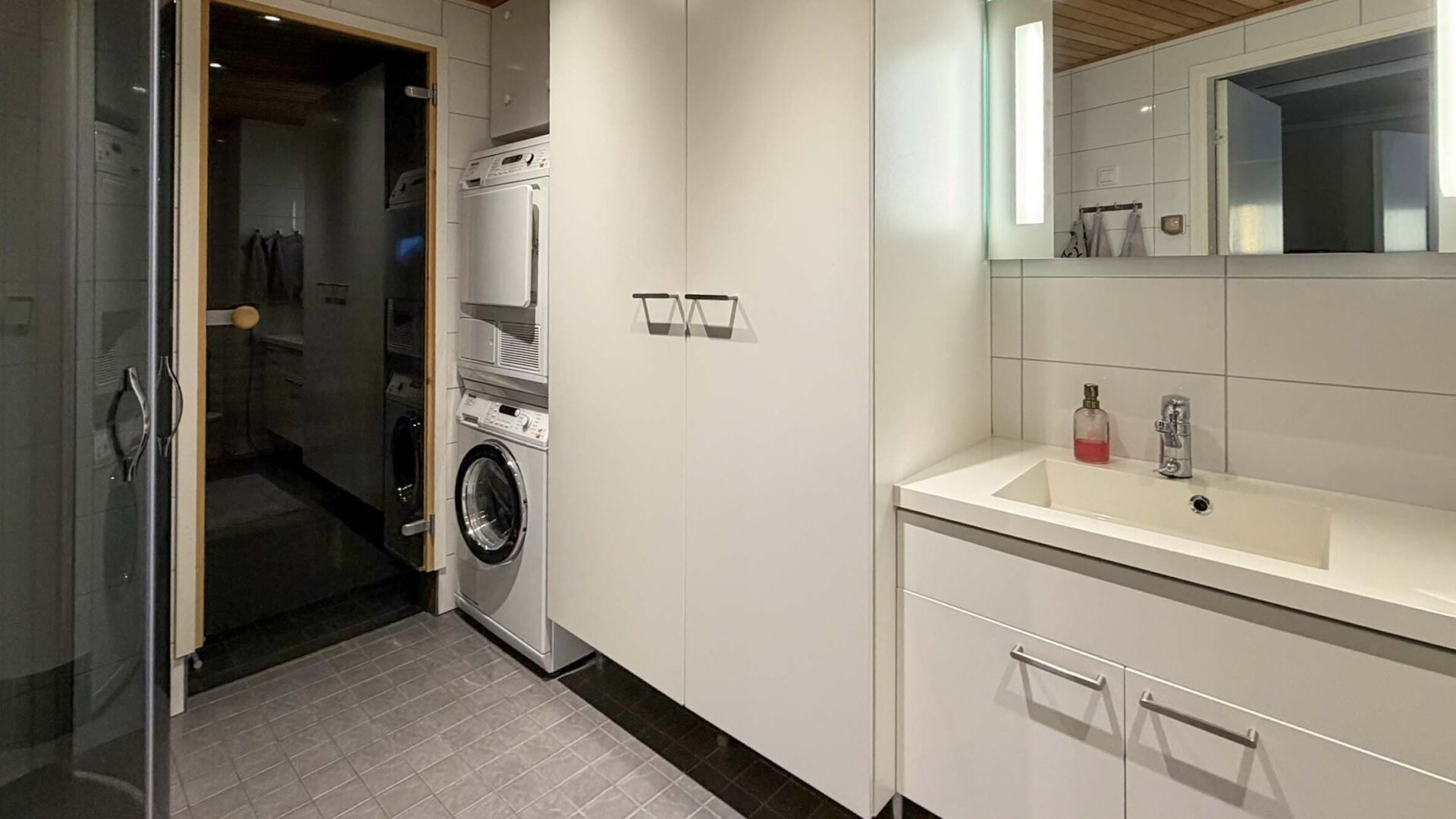 - Varusteet: Suihkuseinä, pesukoneliitäntä, wc-istuin, suihku, peilikaappi, peili, kiinteät valaisimet, kylpyhuonekaapisto