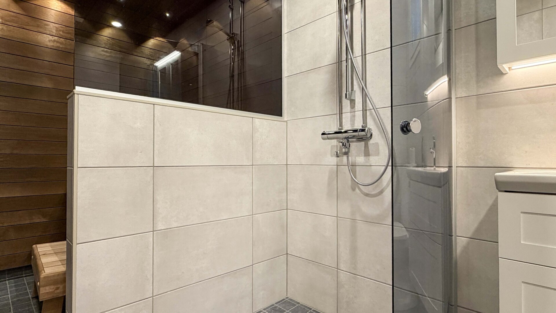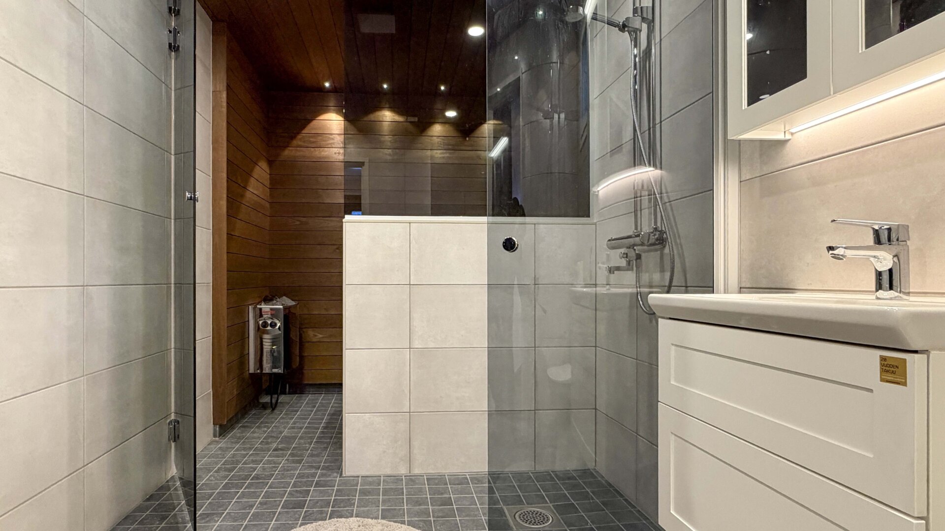 - Varusteet: Suihkuseinä, lattialämmitys, wc-istuin, suihku, peilikaappi