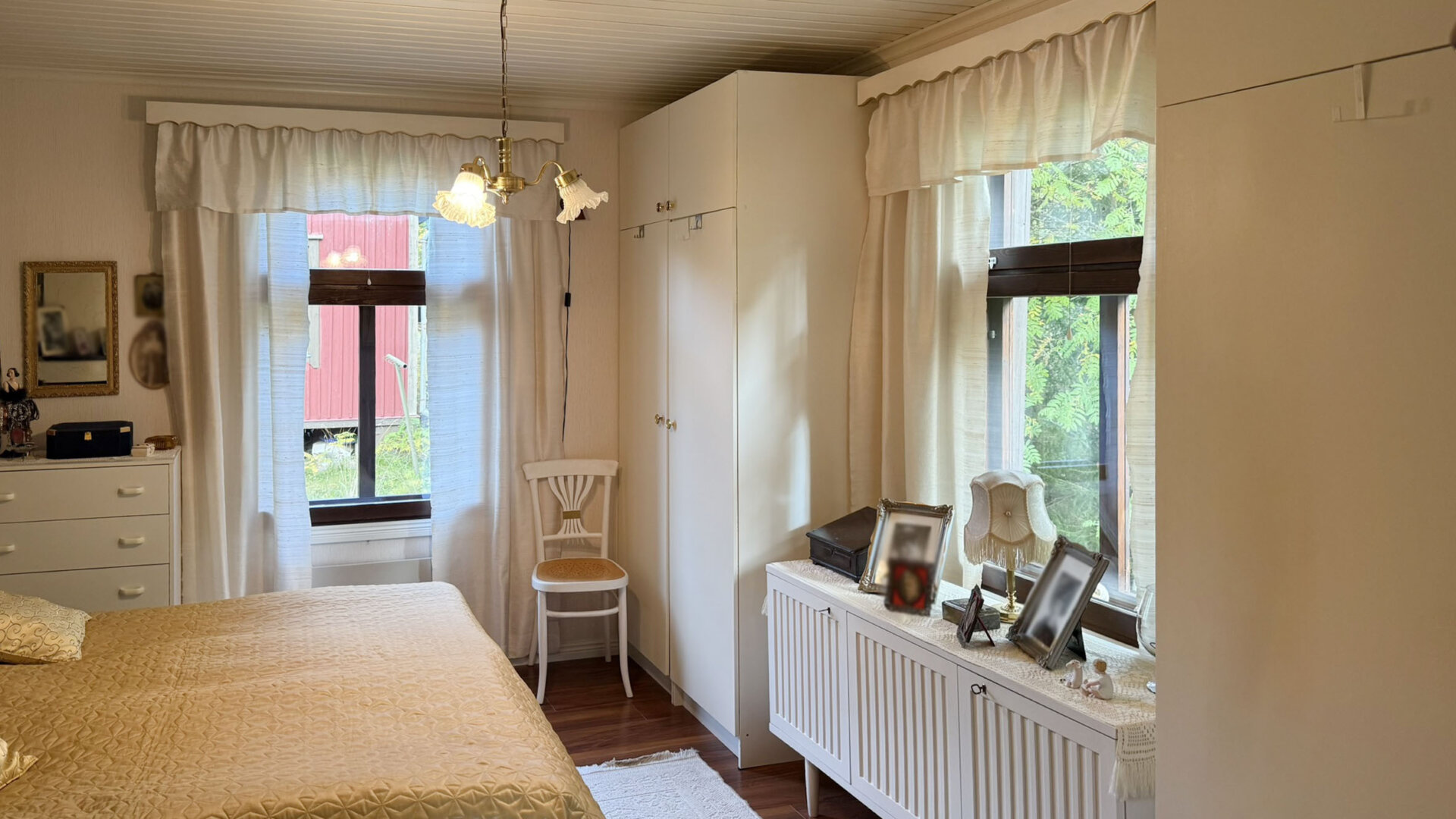 Talo koostuu keittiöstä, olohuoneesta, makuuhuoneesta, wc:stä ja kuistista. Yläkerrassa on kaksi makuuhuonetta, kylpyhuone/sauna ja wc sekä varastotilaa. Asuinpinta-ala on noin 117 m². Erillinen, eristetty kahden auton autotalli on rakennettu vuonna 1988, pinta-alaltaan noin 44/48 m².