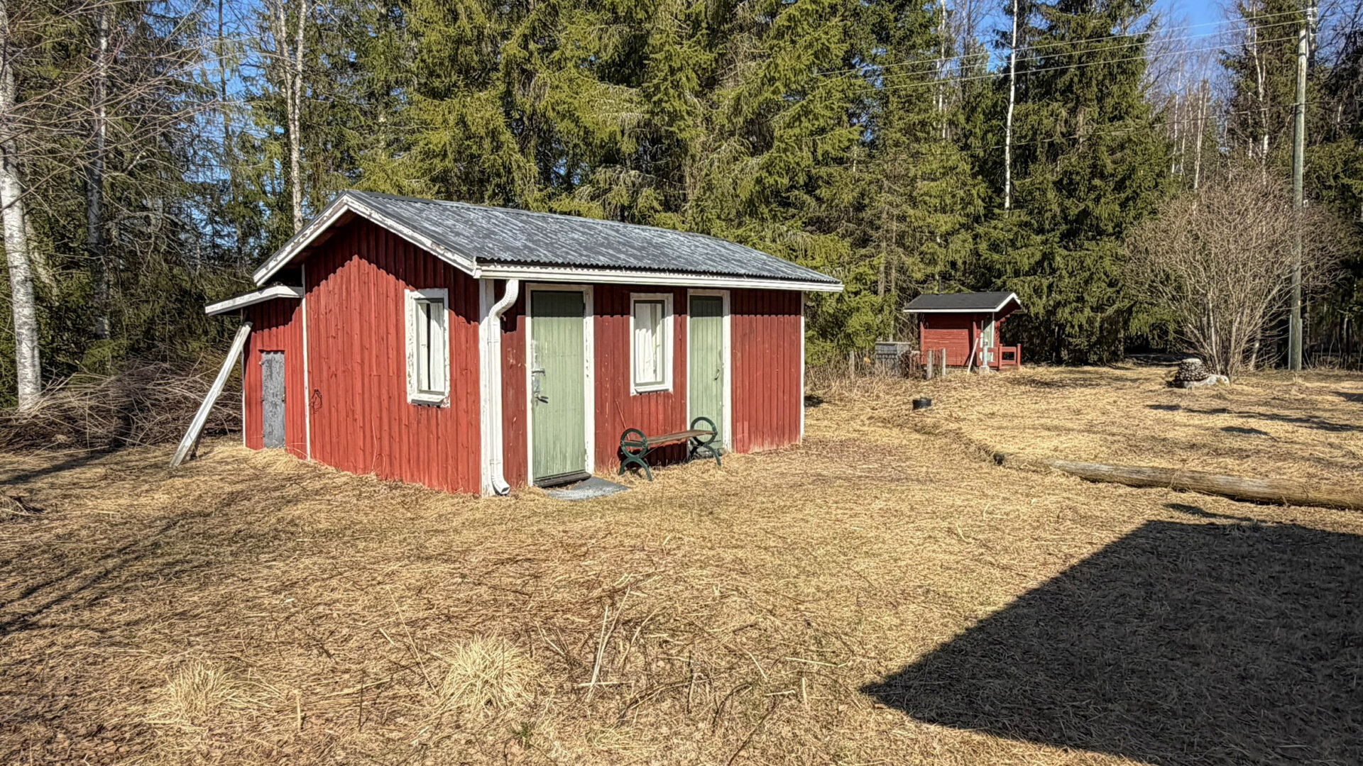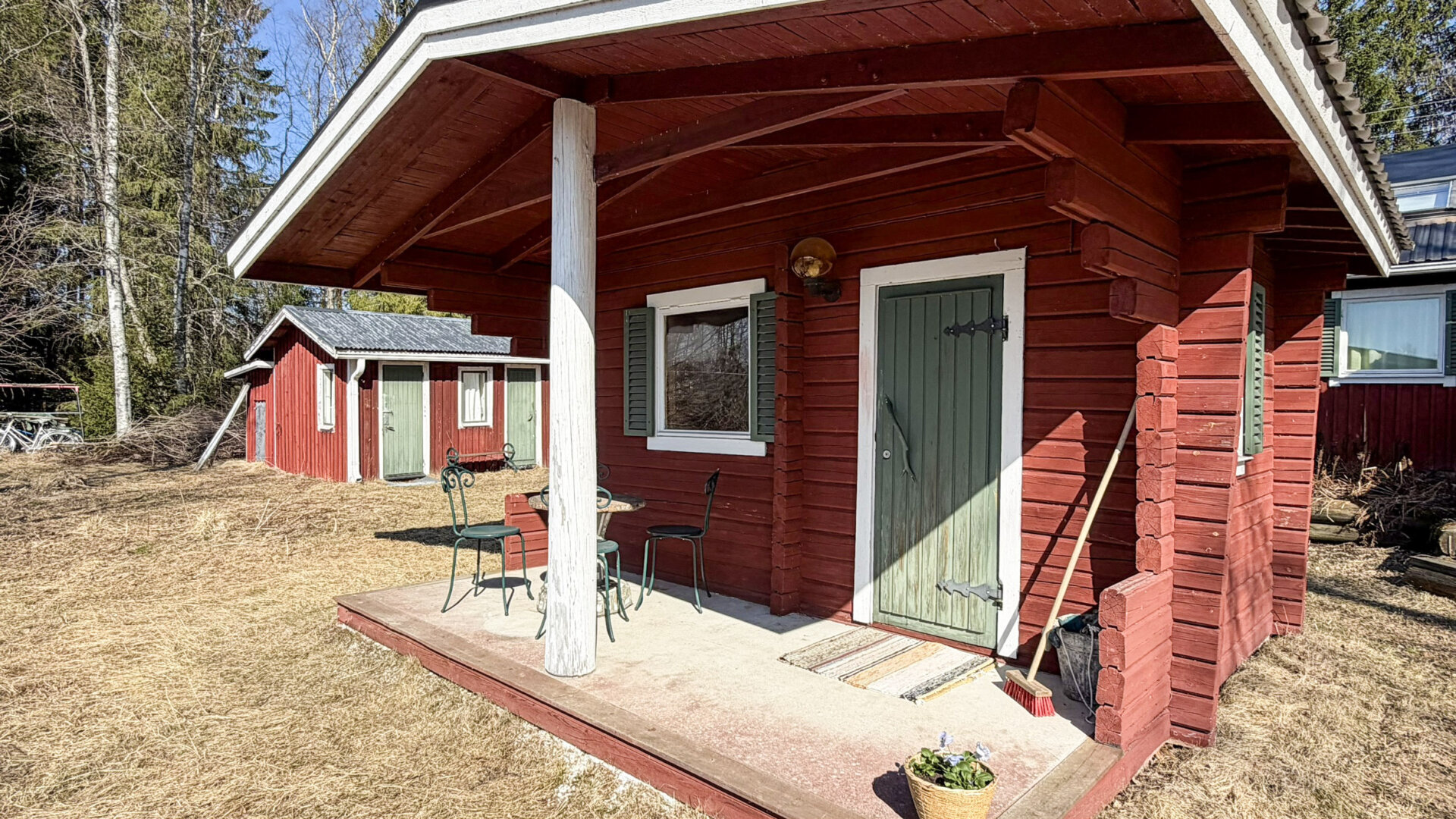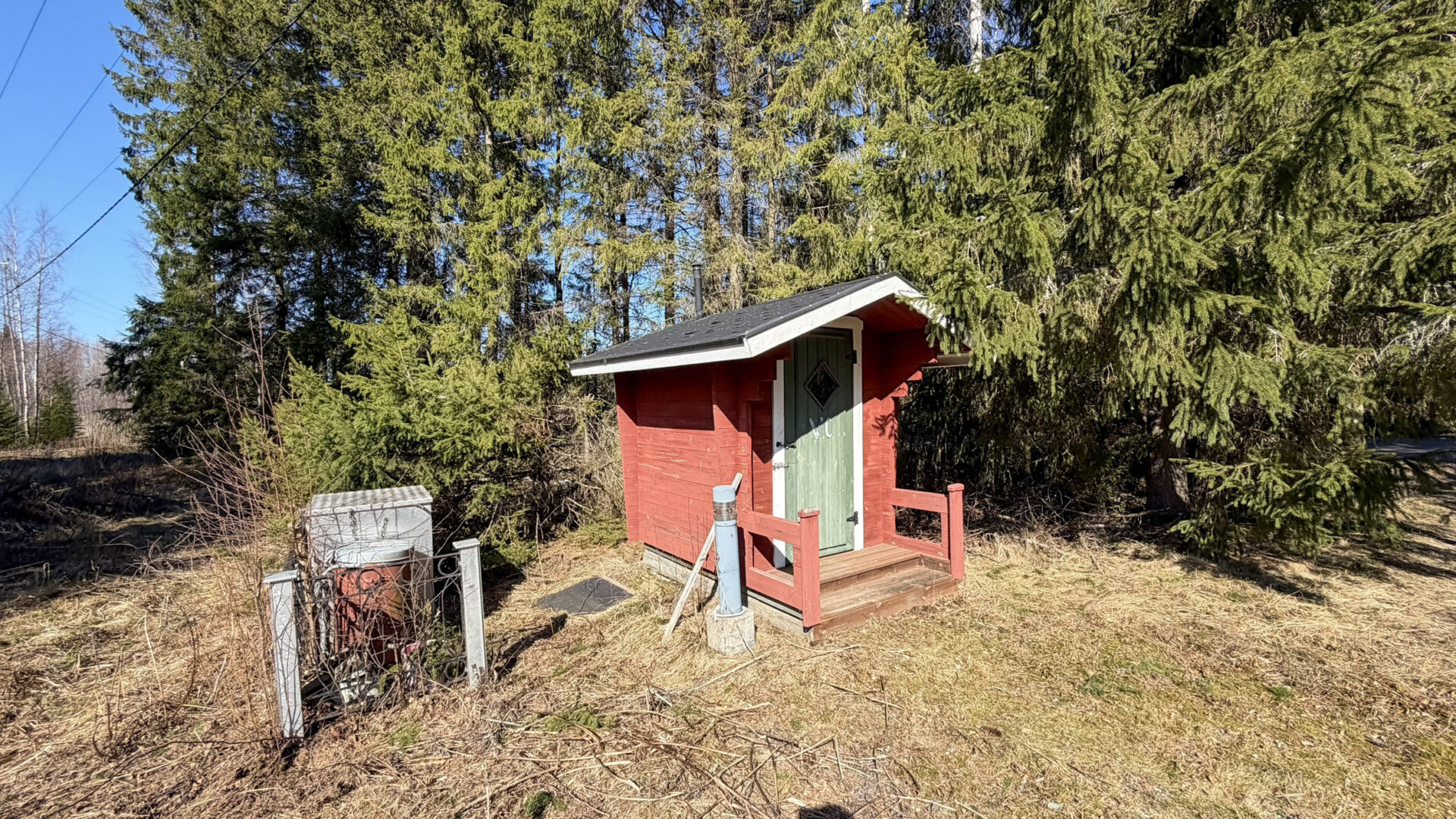 - Erillinen saunarakennus, jossa suihkuhuone. Pesukone ja pesukoneliitäntä varastorakennusessa.