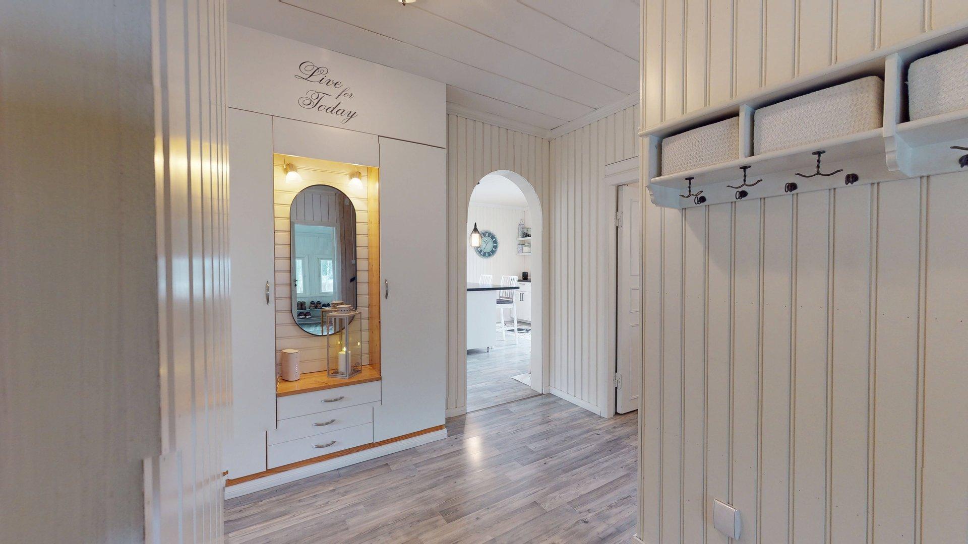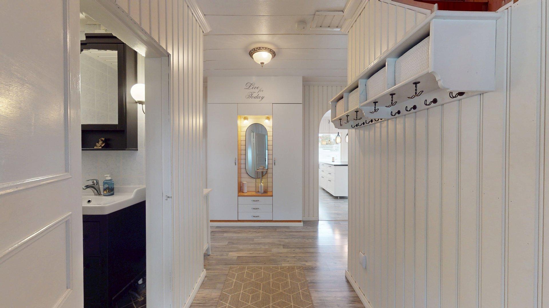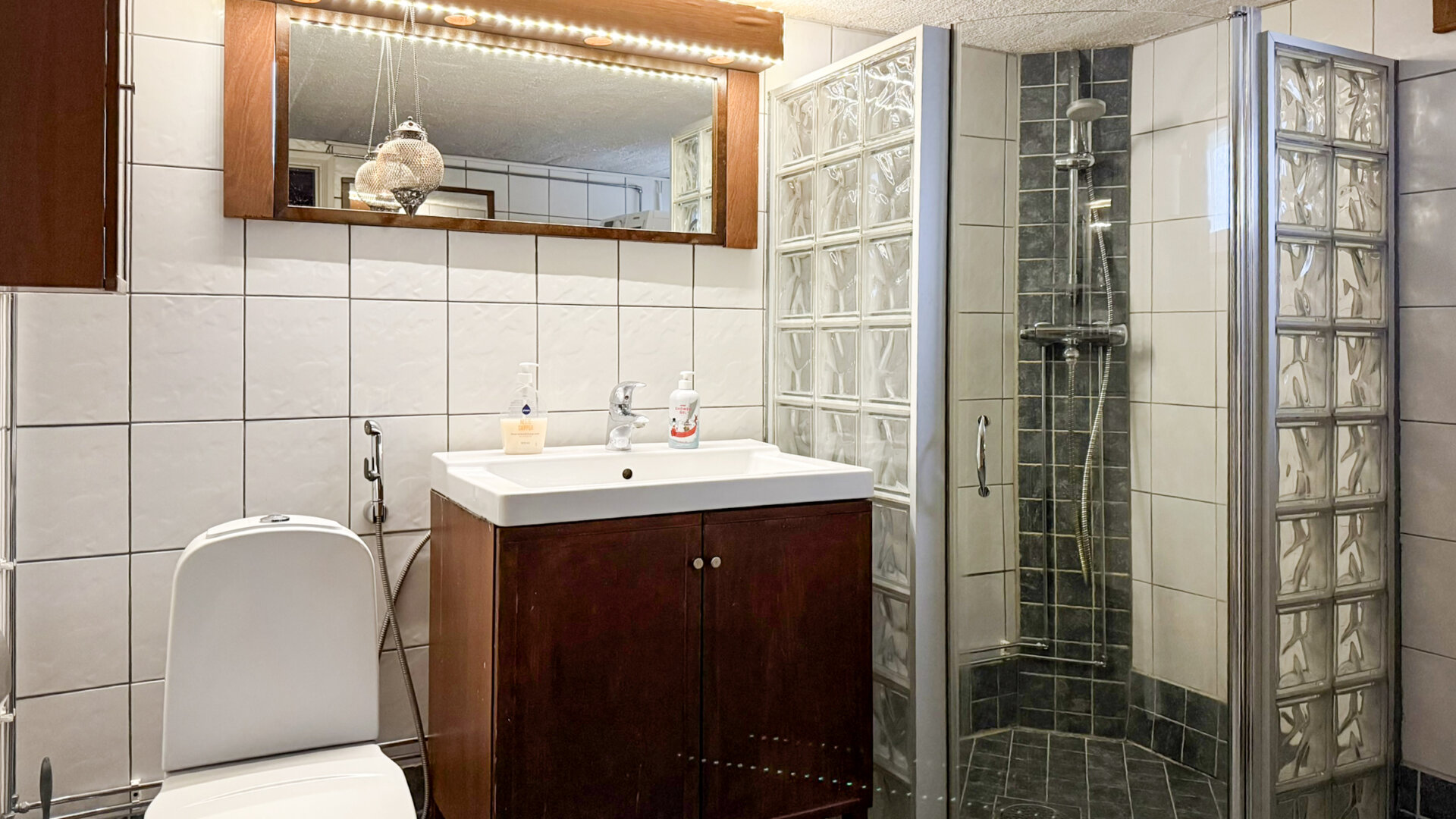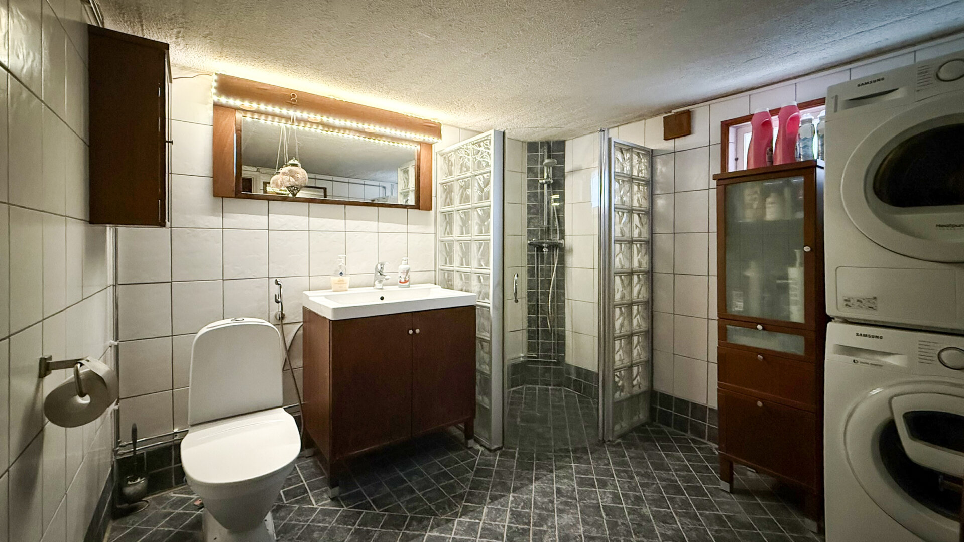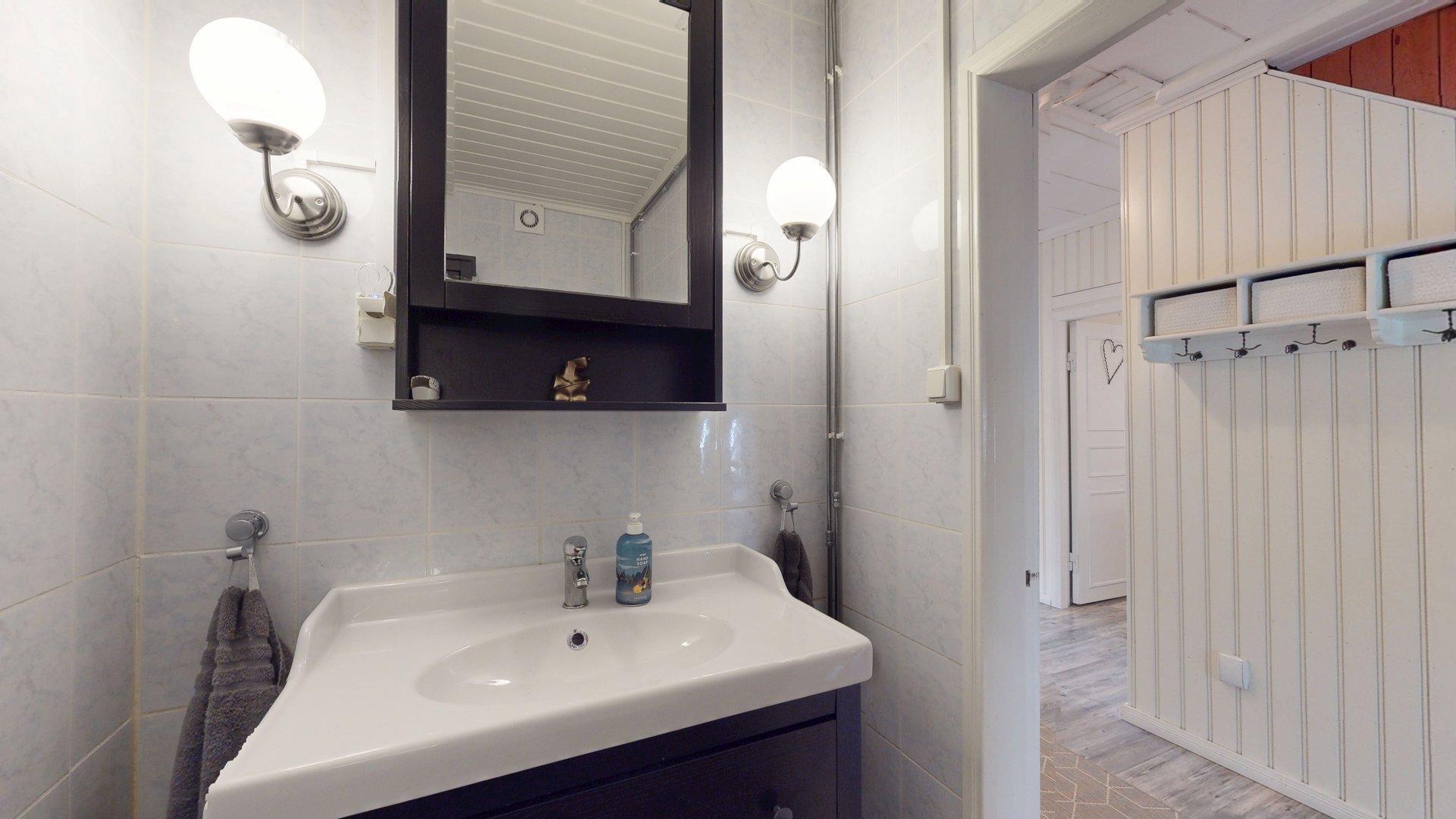 - Varusteet: Suihkuseinä, pesukoneliitäntä, lattialämmitys, wc-istuin, peilikaappi, peili, kiinteät valaisimet, kylpyhuonekaapisto
