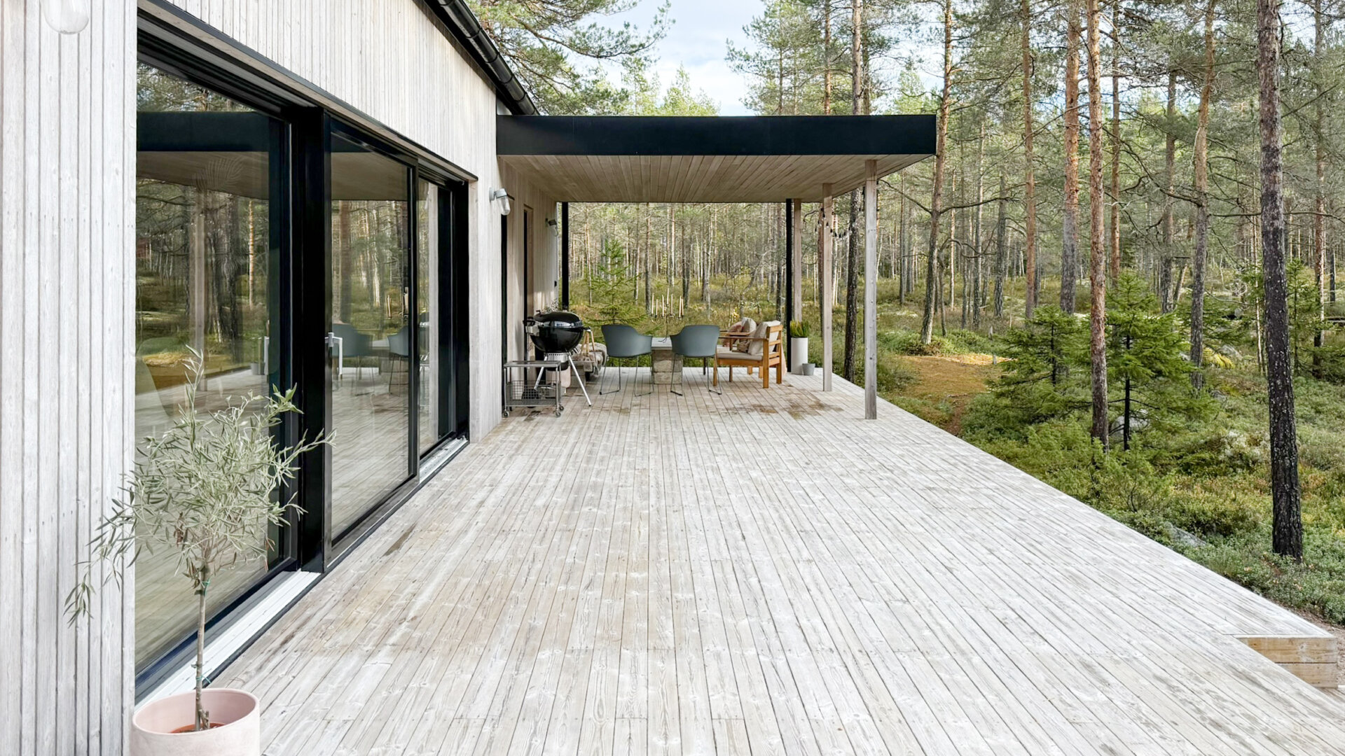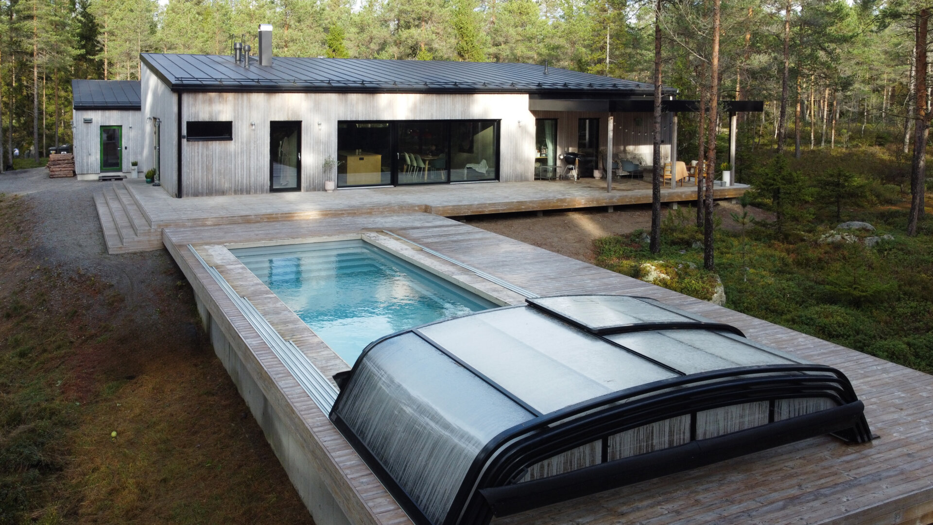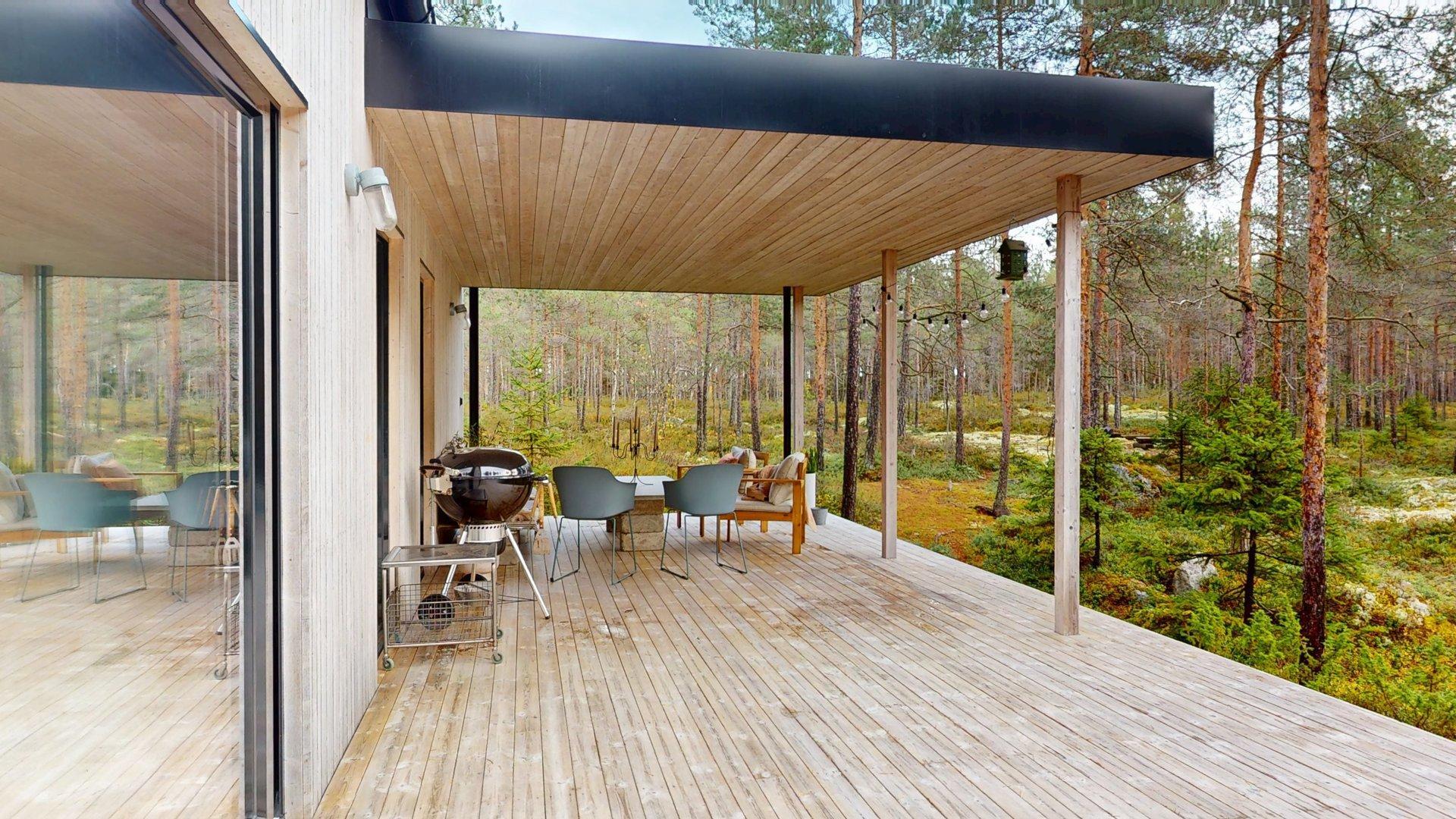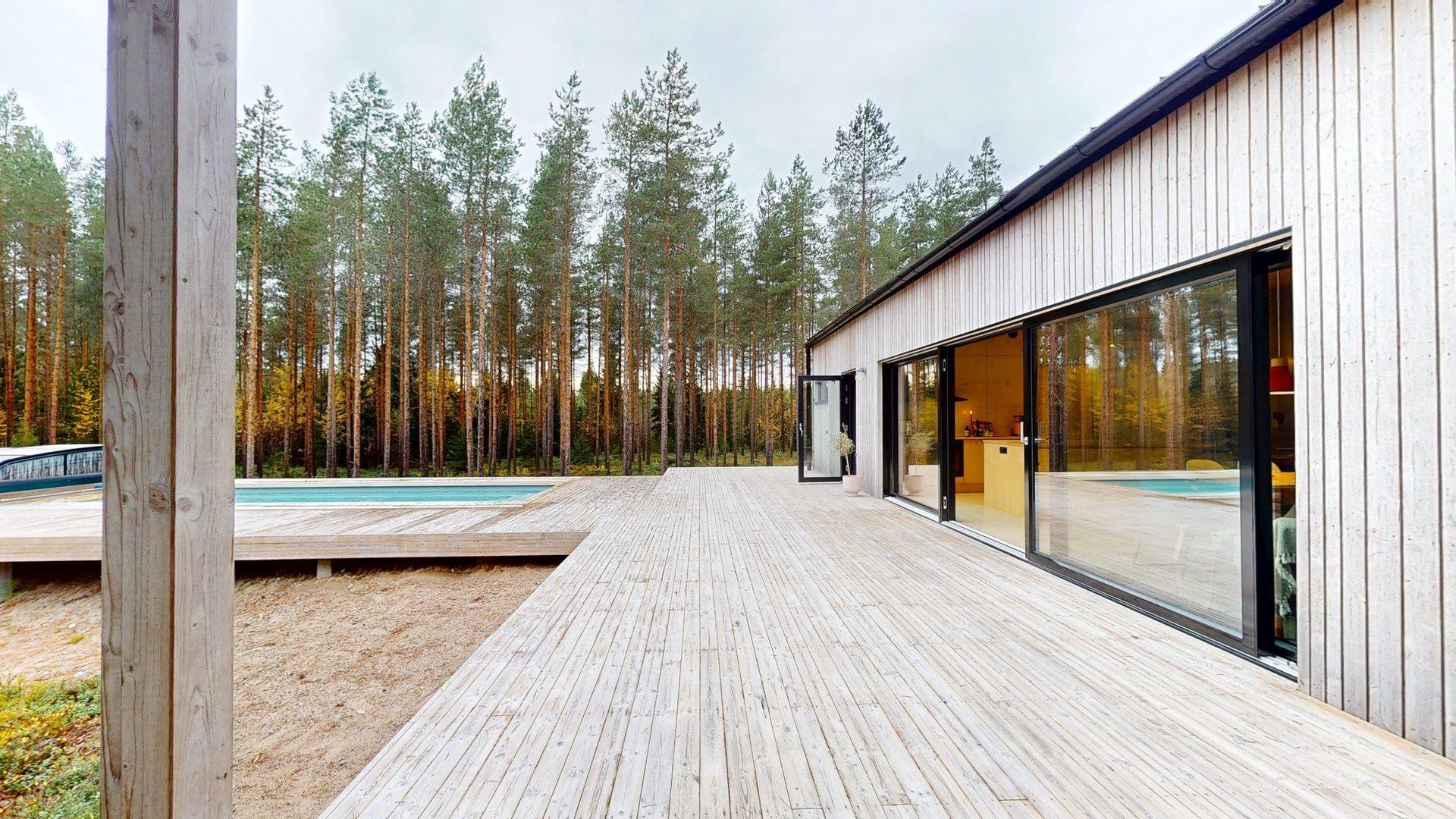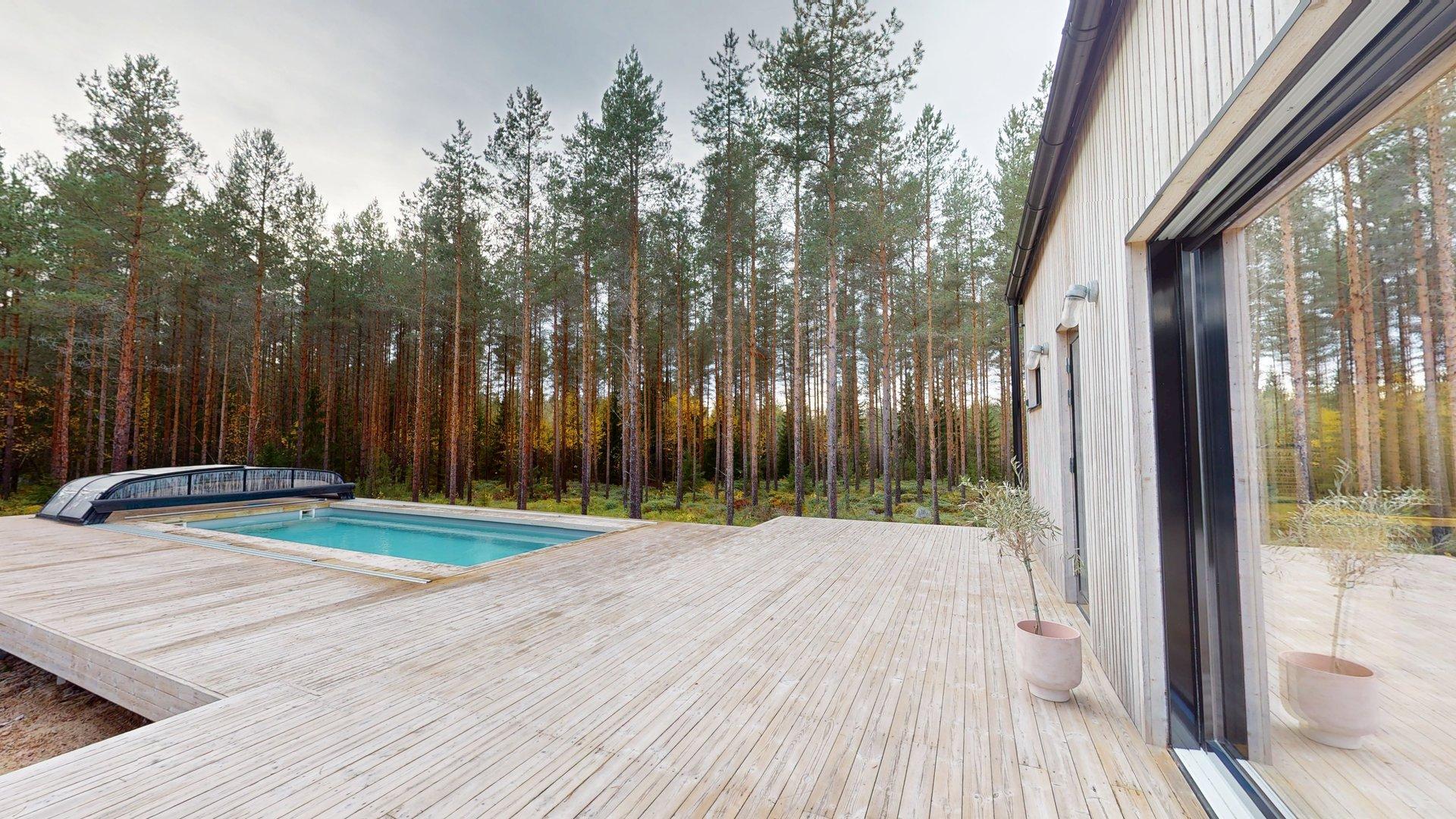 Mot söder breder ett stort terrassdäck ut sig, med gott om plats för umgänge, sol och avkoppling. Direkt från bastun når man den 8,5 x 3,5 meter stora simbassängen, perfekt för både morgondopp och sommardagar med familj och vänner.