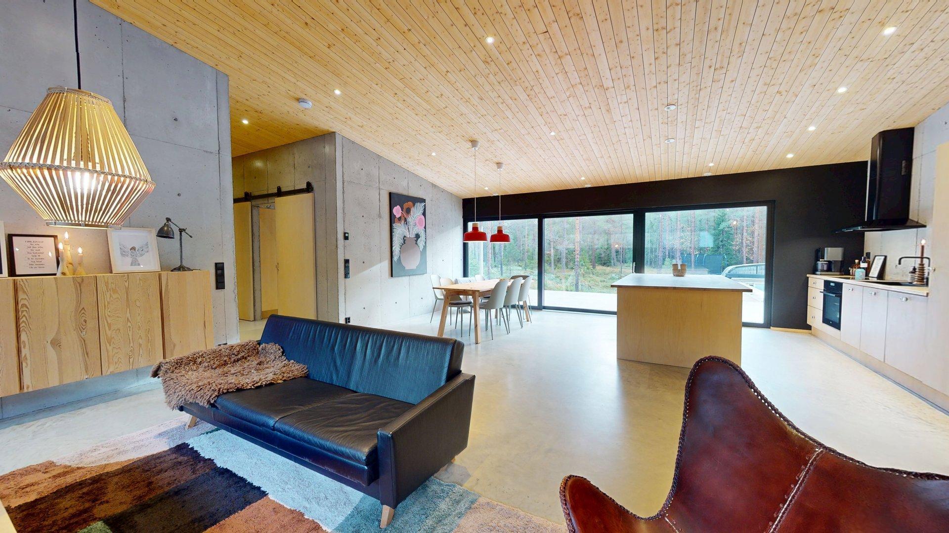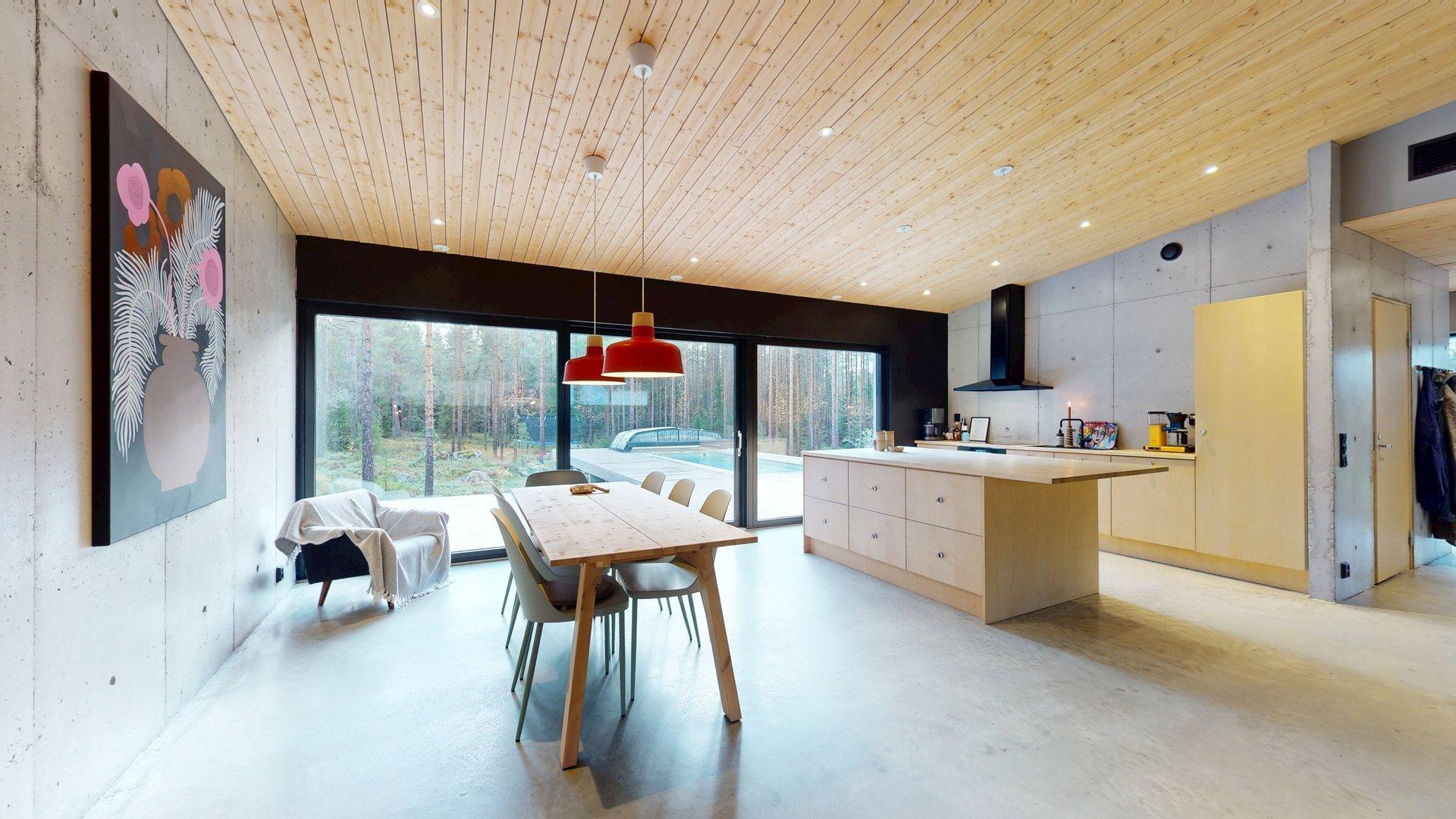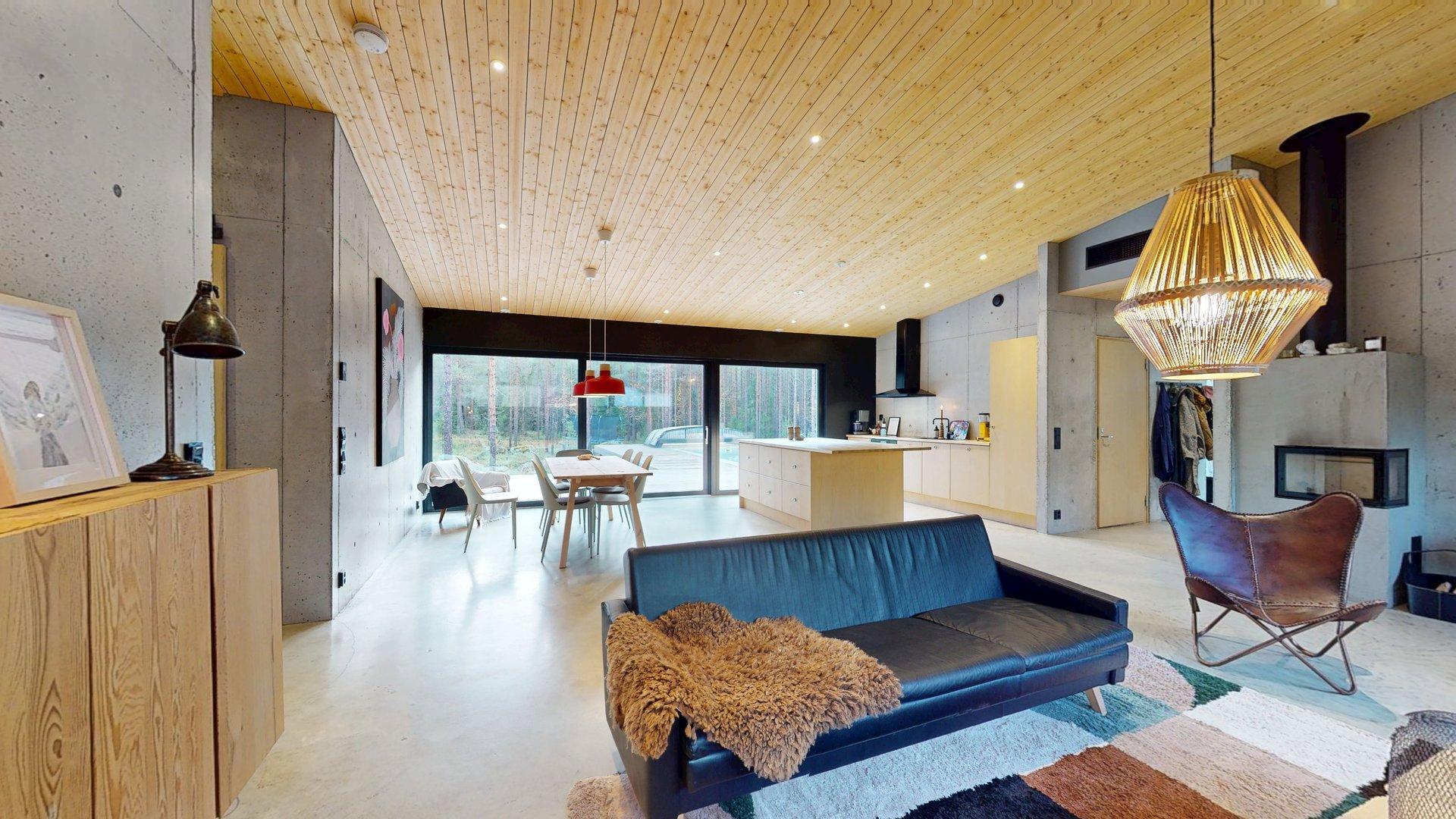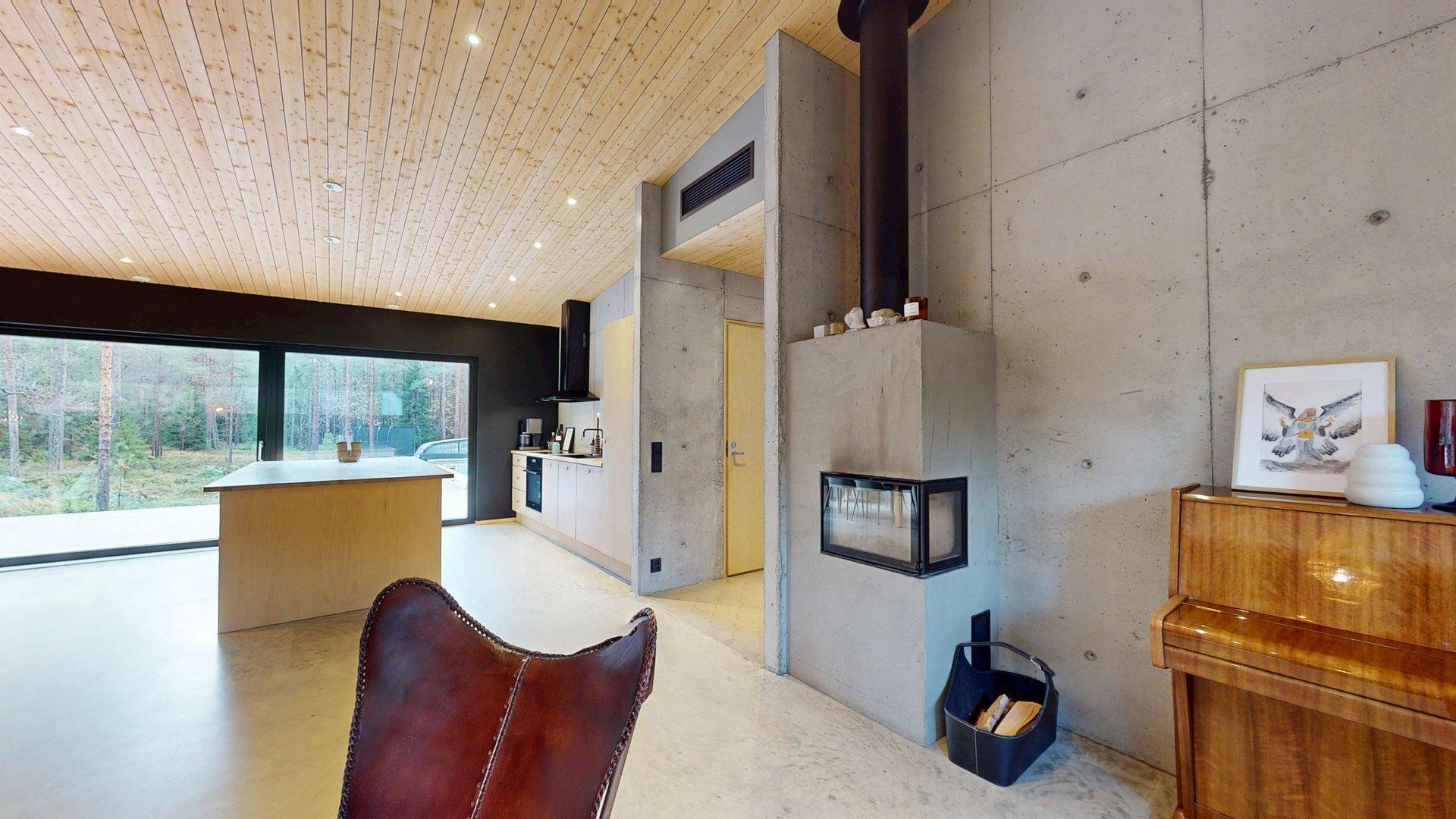 Sisätiloissa kohtaat hiotut betonilattiat ja betoniseinät tyylikäs, kestävä ja rauhallinen tunnelma, joka kestää aikaa. Suuret etelään suuntautuvat ikkunat tarjoavat näkymän luonnon vuodenaikojen vaihteluun.