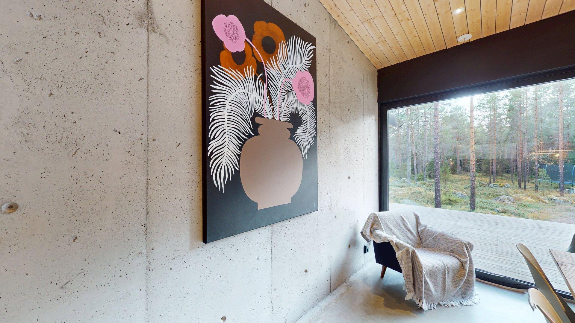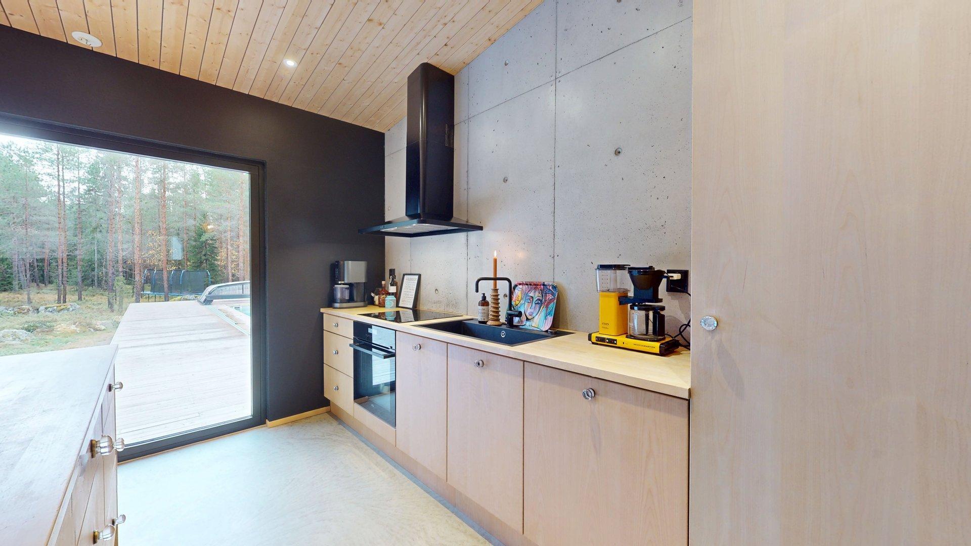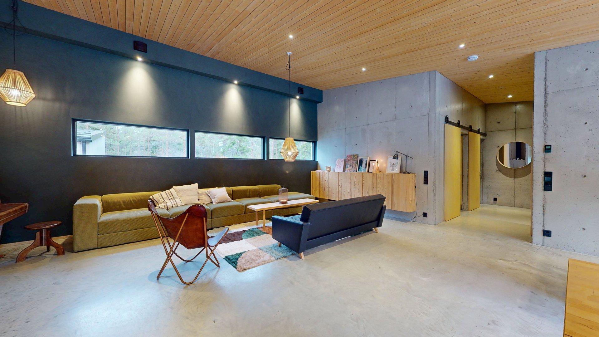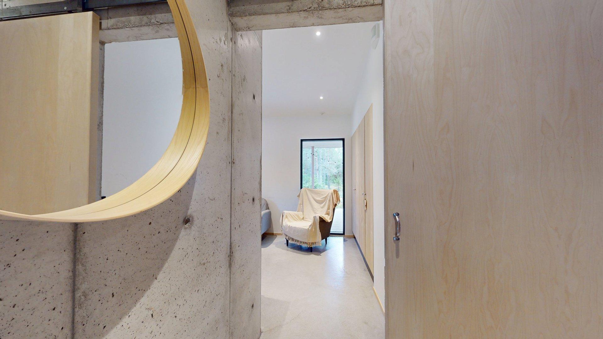 Sisätiloissa kohtaat hiotut betonilattiat ja betoniseinät tyylikäs, kestävä ja rauhallinen tunnelma, joka kestää aikaa. Suuret etelään suuntautuvat ikkunat tarjoavat näkymän luonnon vuodenaikojen vaihteluun.