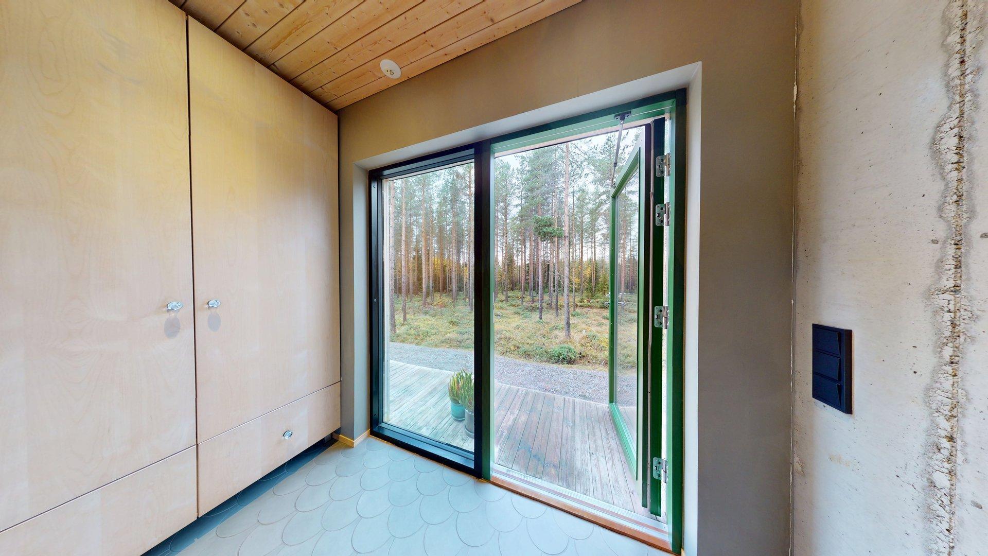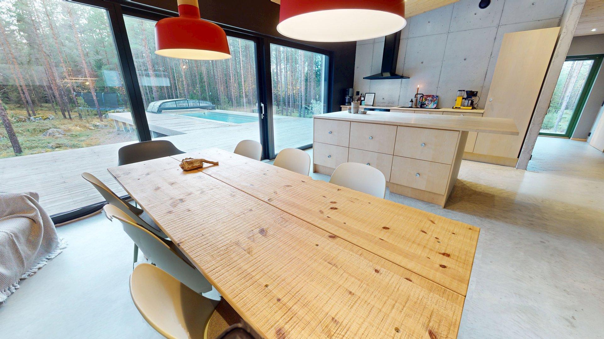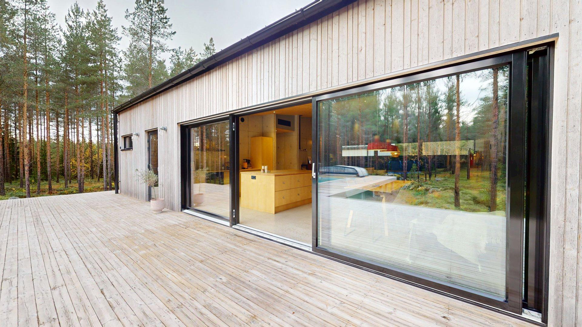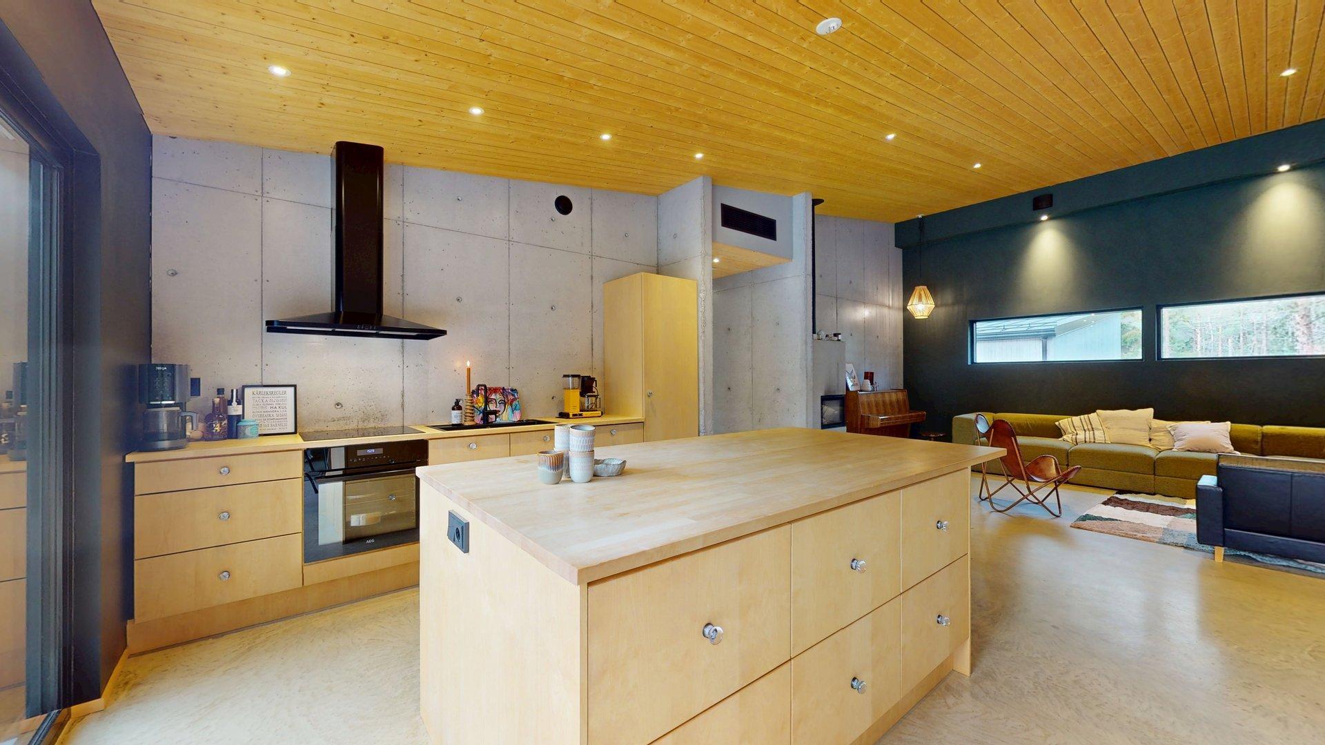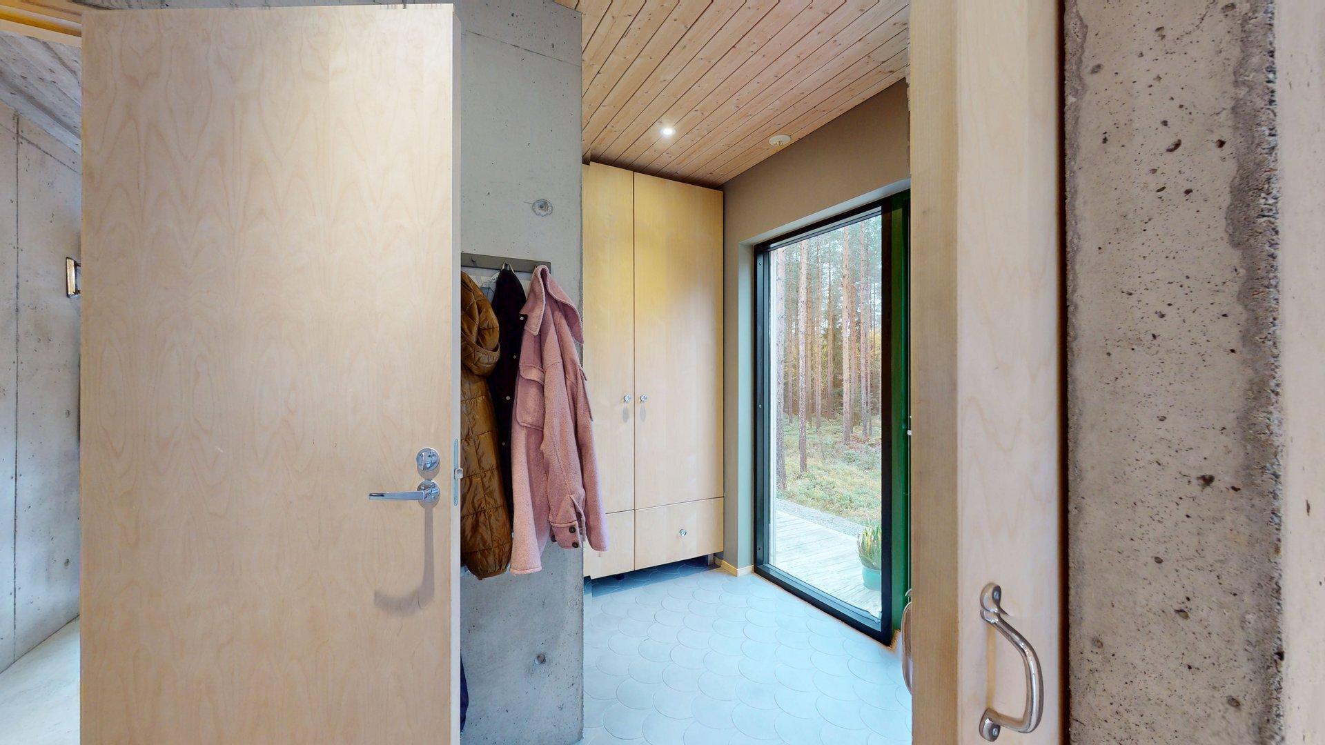 Sisätiloissa kohtaat hiotut betonilattiat ja betoniseinät tyylikäs, kestävä ja rauhallinen tunnelma, joka kestää aikaa. Suuret etelään suuntautuvat ikkunat tarjoavat näkymän luonnon vuodenaikojen vaihteluun.