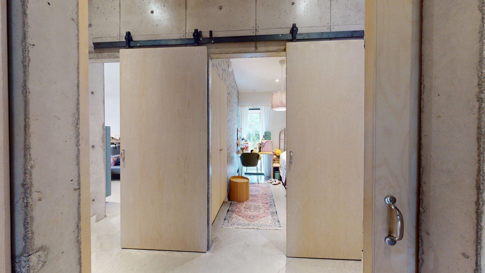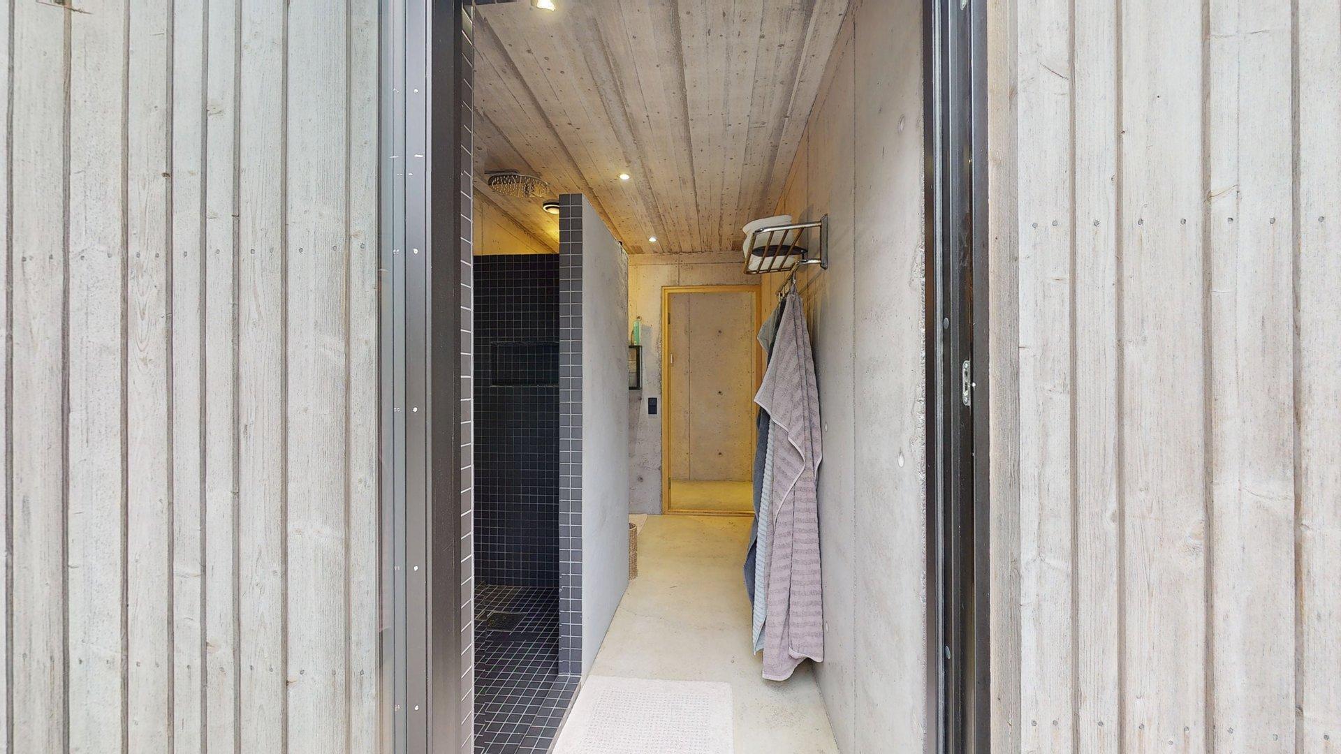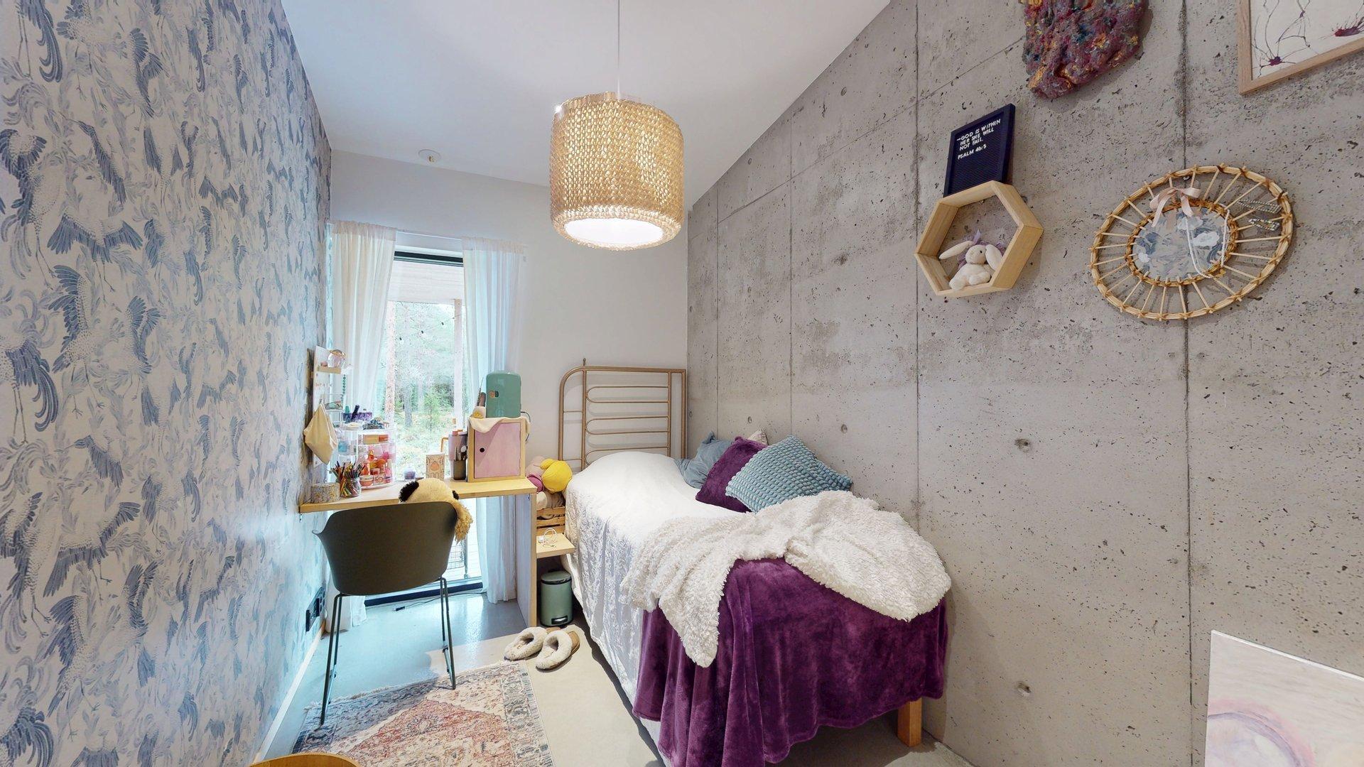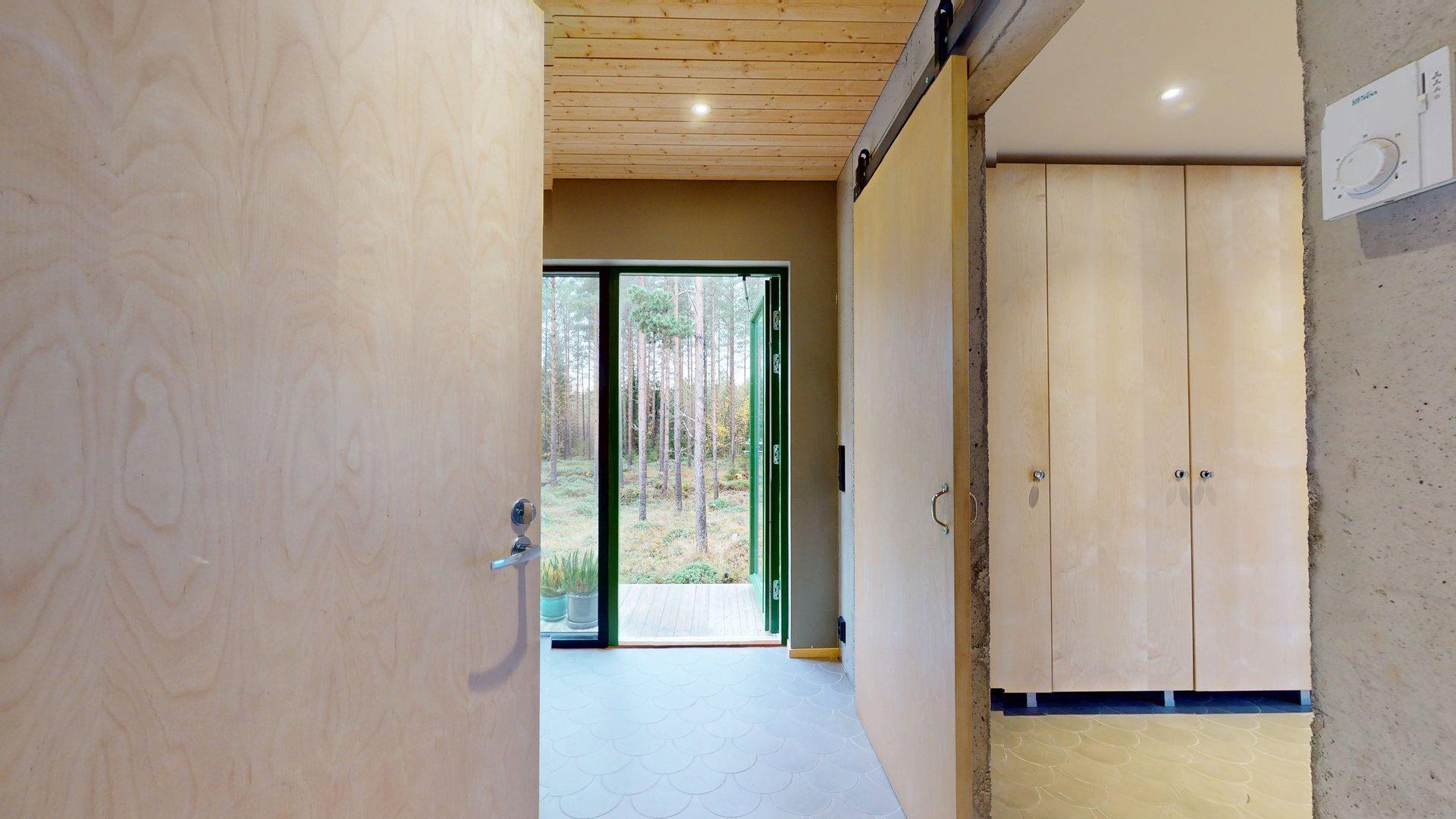 Sisätiloissa kohtaat hiotut betonilattiat ja betoniseinät tyylikäs, kestävä ja rauhallinen tunnelma, joka kestää aikaa. Suuret etelään suuntautuvat ikkunat tarjoavat näkymän luonnon vuodenaikojen vaihteluun.