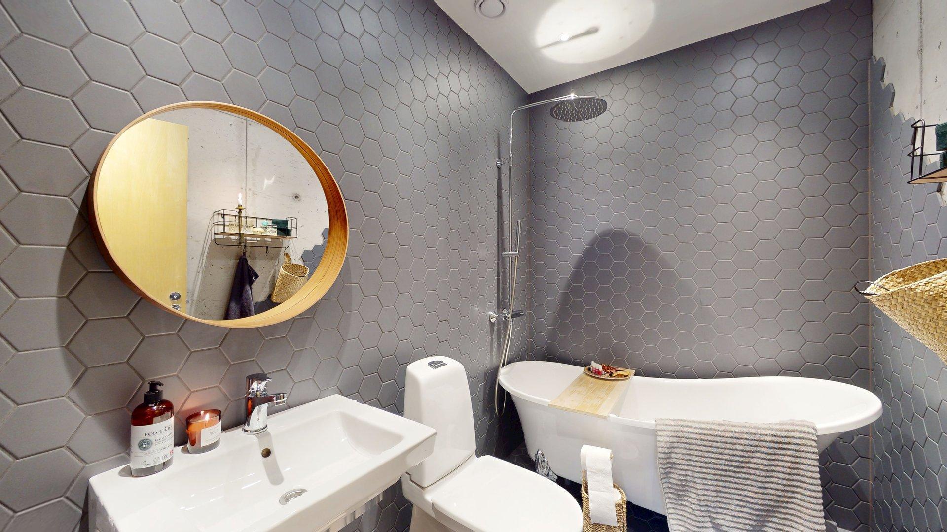 - Varusteet: Kylpyamme, lattialämmitys, wc-istuin, suihku, peilikaappi, peili, kiinteät valaisimet