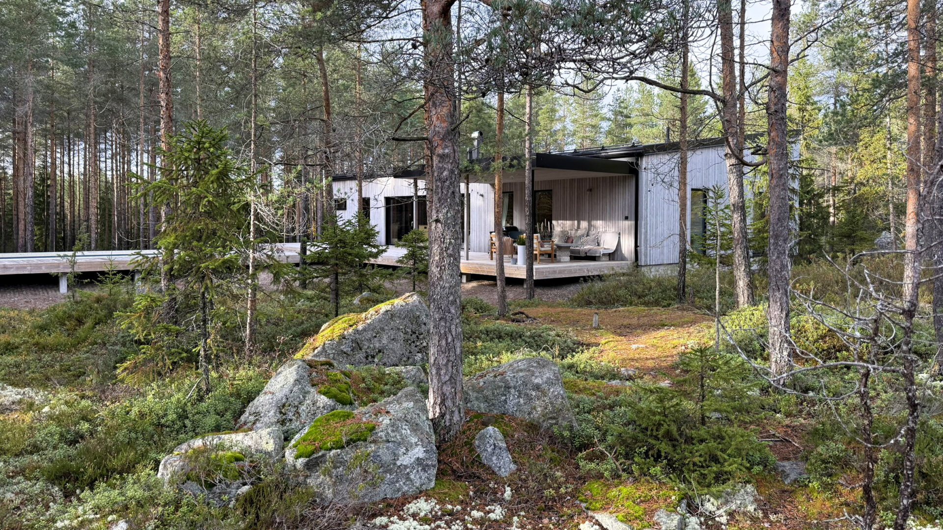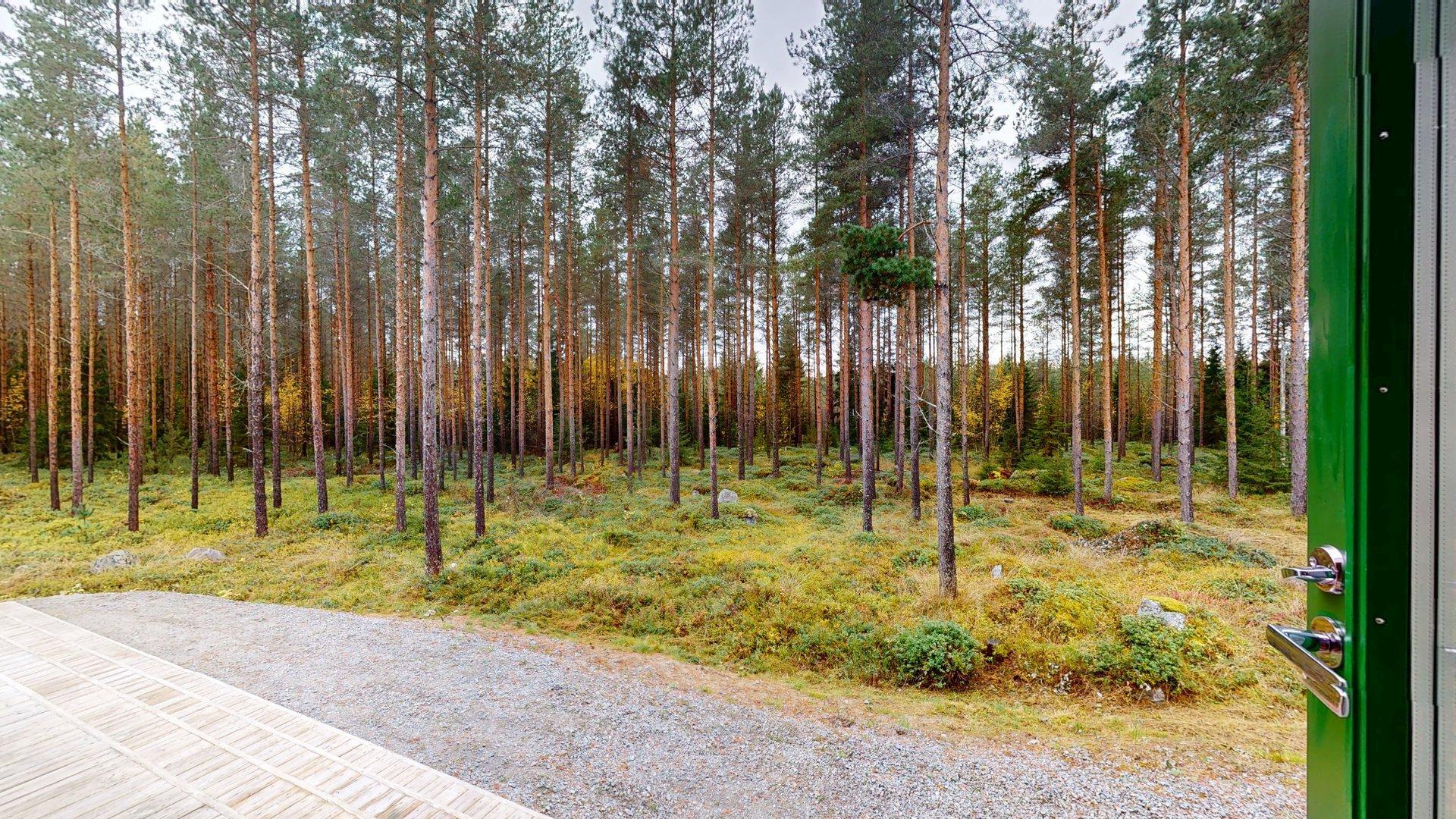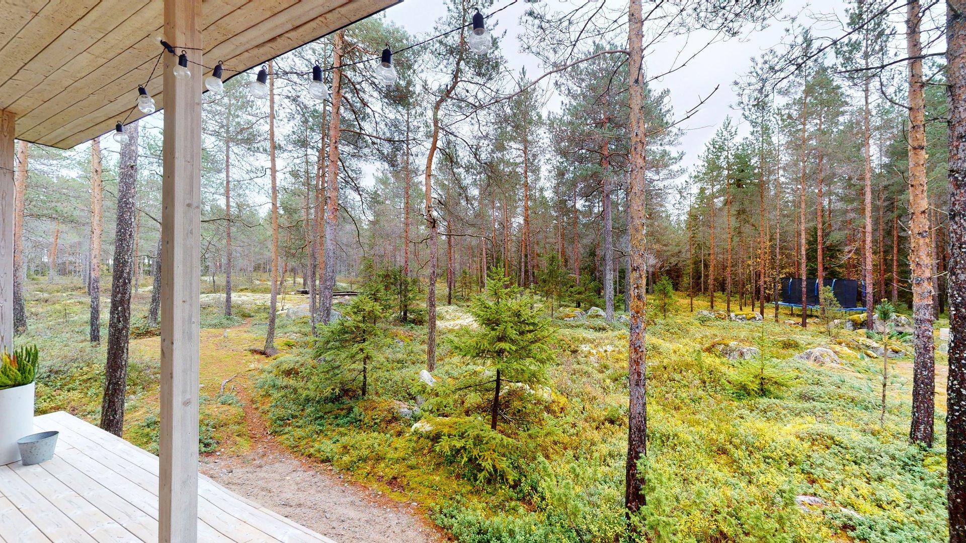 Tomten är en naturlig pärla på 5 600 m², med berg i dagen, tallar och blåbärs- och lingonris runt knuten. Här får man verkligen känslan av att bo i naturen utan att ge avkall på modern komfort.