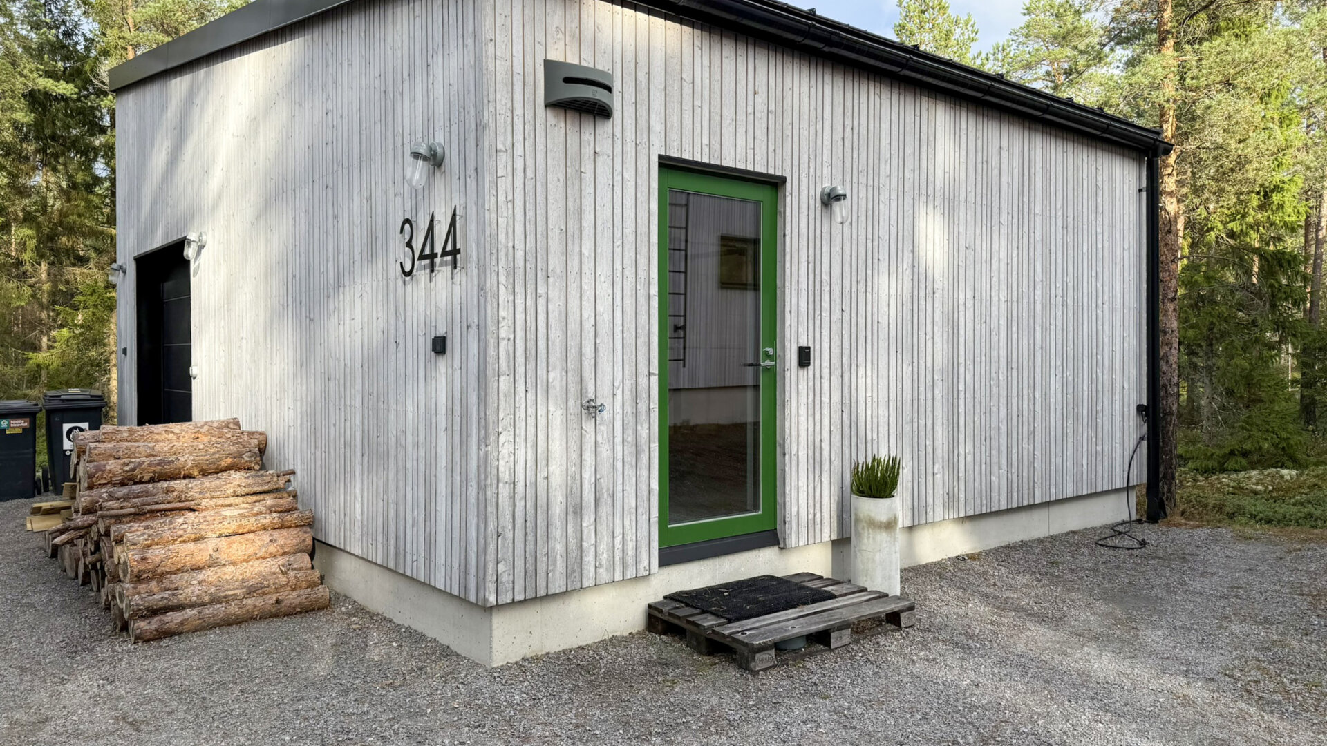 På tomten finns även en separat garagebyggnad på totalt 48 m² med garage (24 m²) och hemmagym (24 m²), där även all husteknik är samlad.