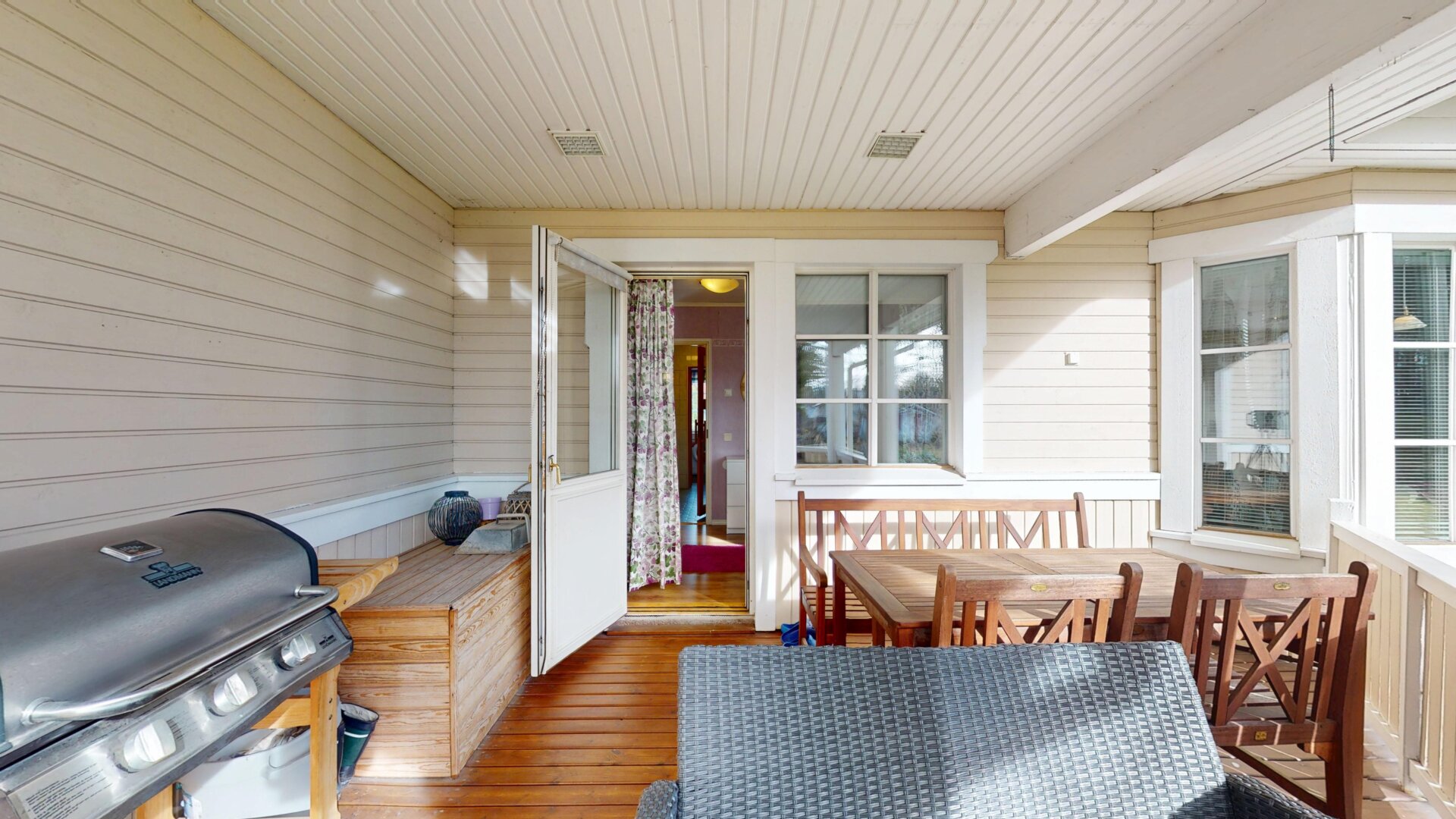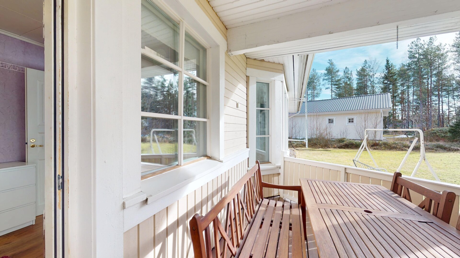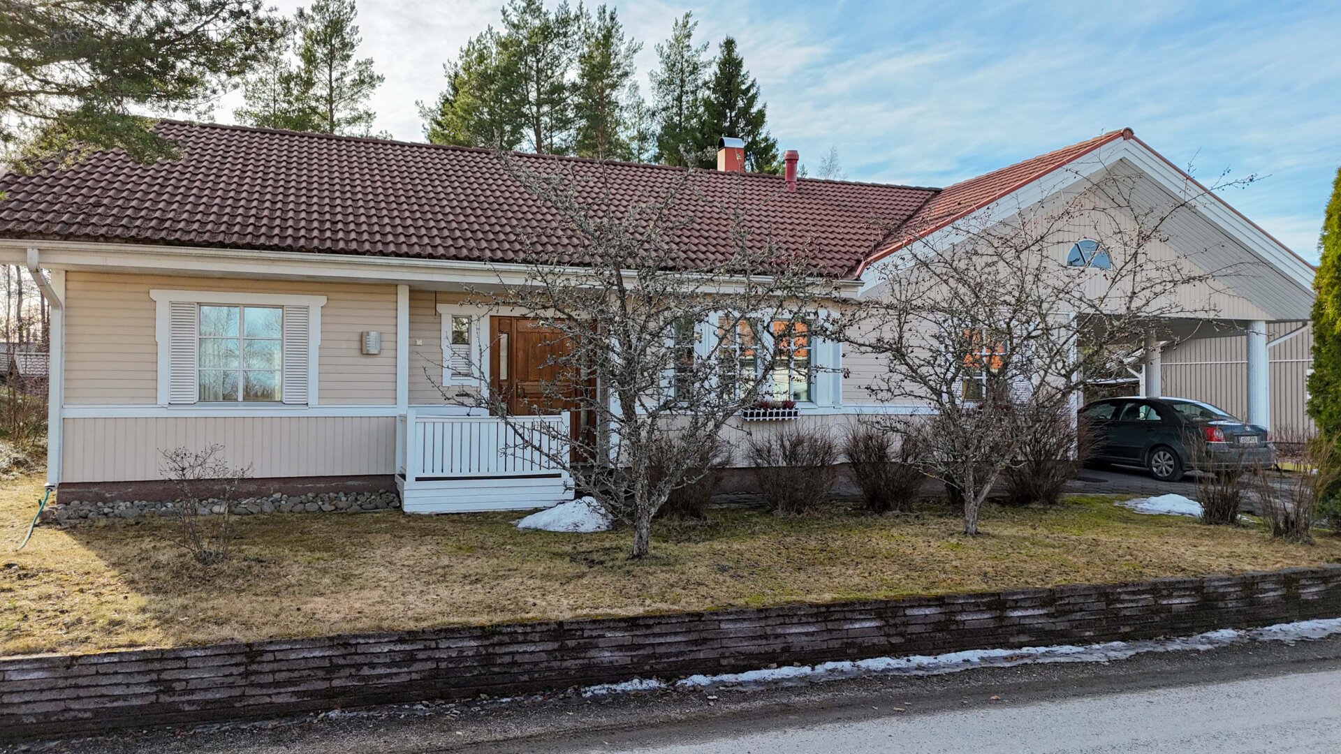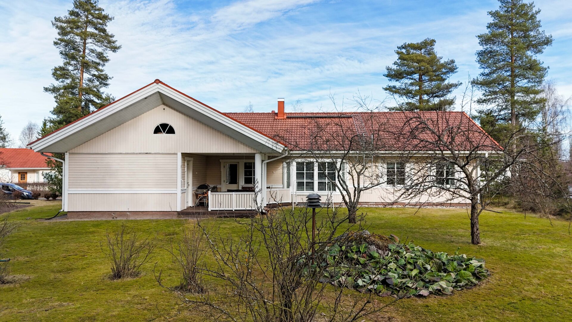 Tämä tehokkaasti suunniteltu Jeo-elementtitalo on rakennettu vuosina 1994/95 ja tarjoaa 120 m²:n hyvin suunnitellun asuinpinta-alan, johon sisältyy 4 makuuhuonetta, olohuone korotetulla sisäkatolla tuomassa valoa ja avaruutta, tilava keittiö ja sen vieressä kodinhoitohuone sekä kylpyhuone ja sauna. Saunan jälkeen voi vilvoitella katetulla terassilla, joka avautuu suojaiselle takapihalle. Lisäksi autokatos, noin 27 m²:n lämmin autotalli sekä noin 10 m²:n varastohuone.