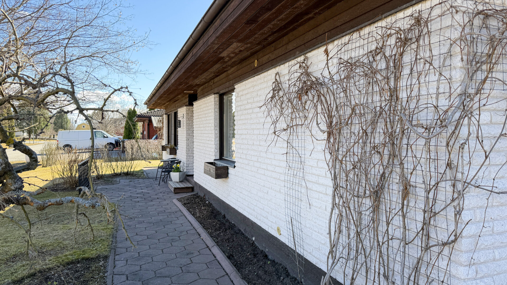 Den egna tomten om 1 327 m² är välskött och smakfullt anlagd med planteringar och stensättningar. Ett trivsamt och välvårdat hus i ett omtyckt område med goda vardagsförbindelser.