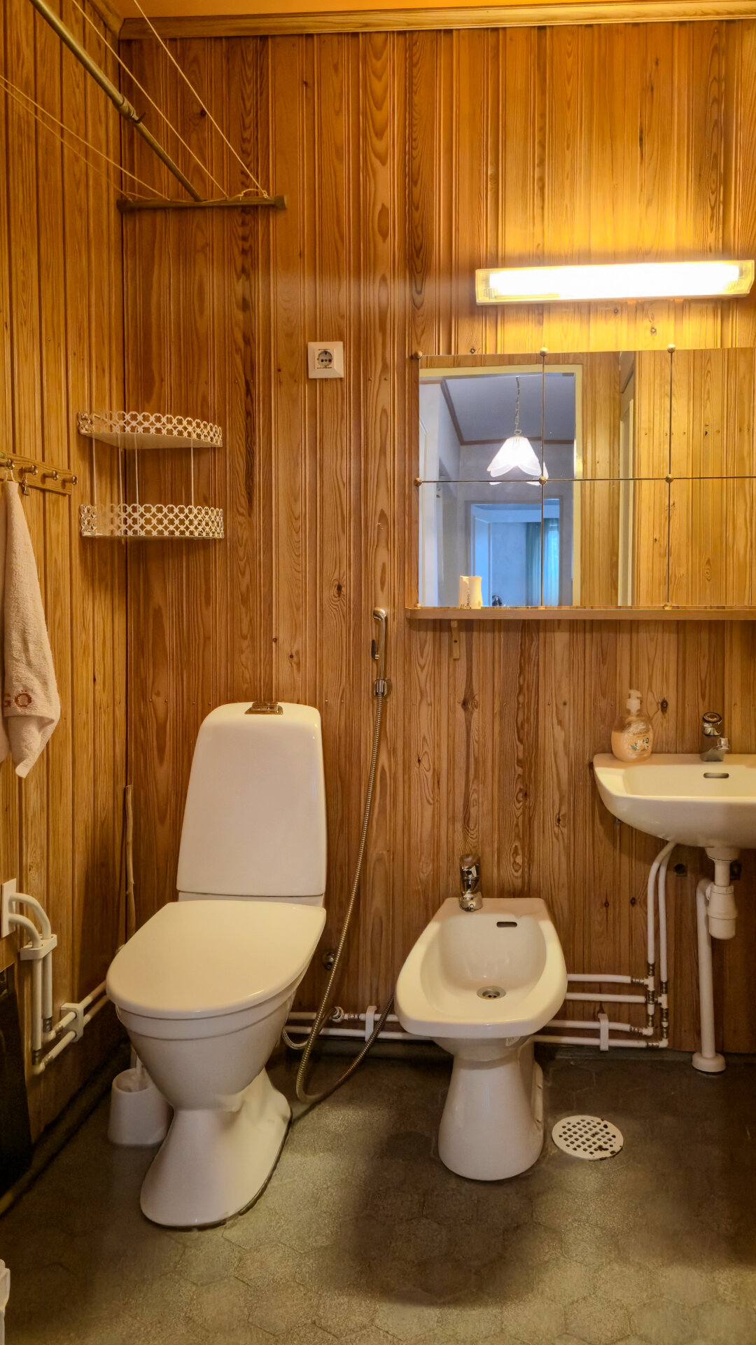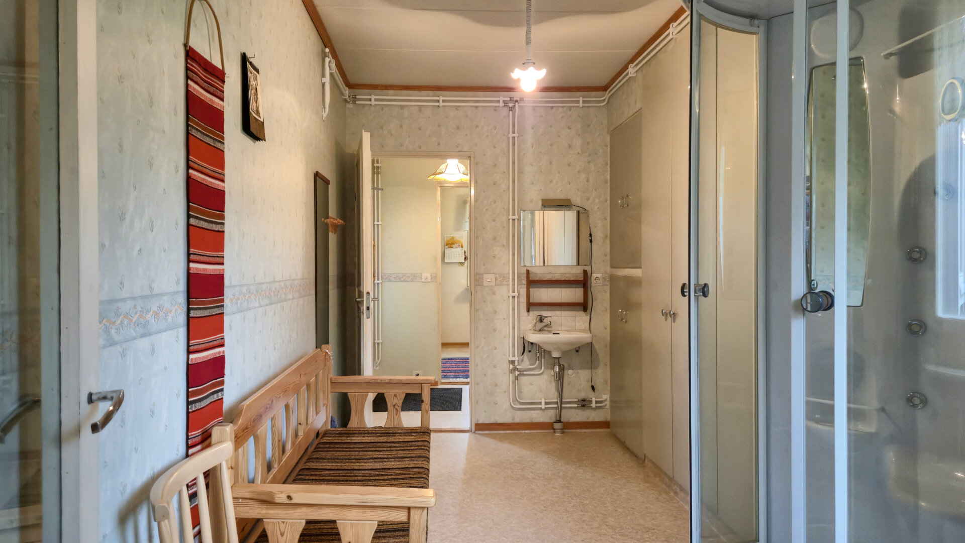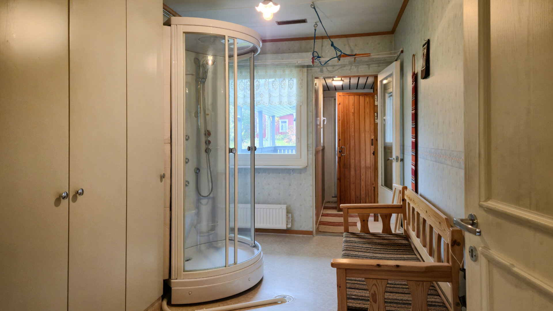 - Varusteet: Suihkukaappi, pesukoneliitäntä, lattialämmitys, suihku, peili, kiinteät valaisimet