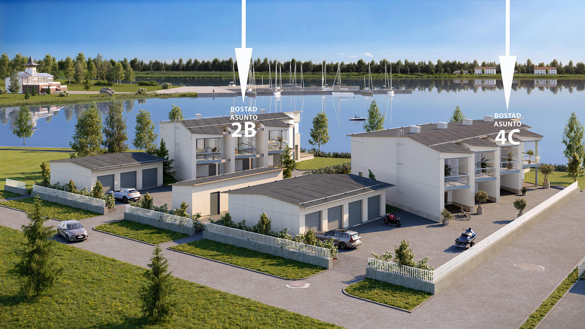 2 B ja 4 C, jotka käsittävät 3 huonetta + tupakeittiö + 2 kph/wc, sauna, 102 m² + tilava lasitettu terassi ja etelään suuntautuva parveke, jossa lasikaide. Asunnon pohjoispuolella on suuri lasitettu terassi, jossa on viihtyisä ulkotila ja ilta-aurinko. Asunnon vieressä on autopaikka moottorilämmittimellä sekä erillinen tilava autotalli ja varasto. Hyvin suunnitellut, modernit asunnot, joissa panostettu asumismukavuuteen ja korkeatasoiseen sisustukseen.