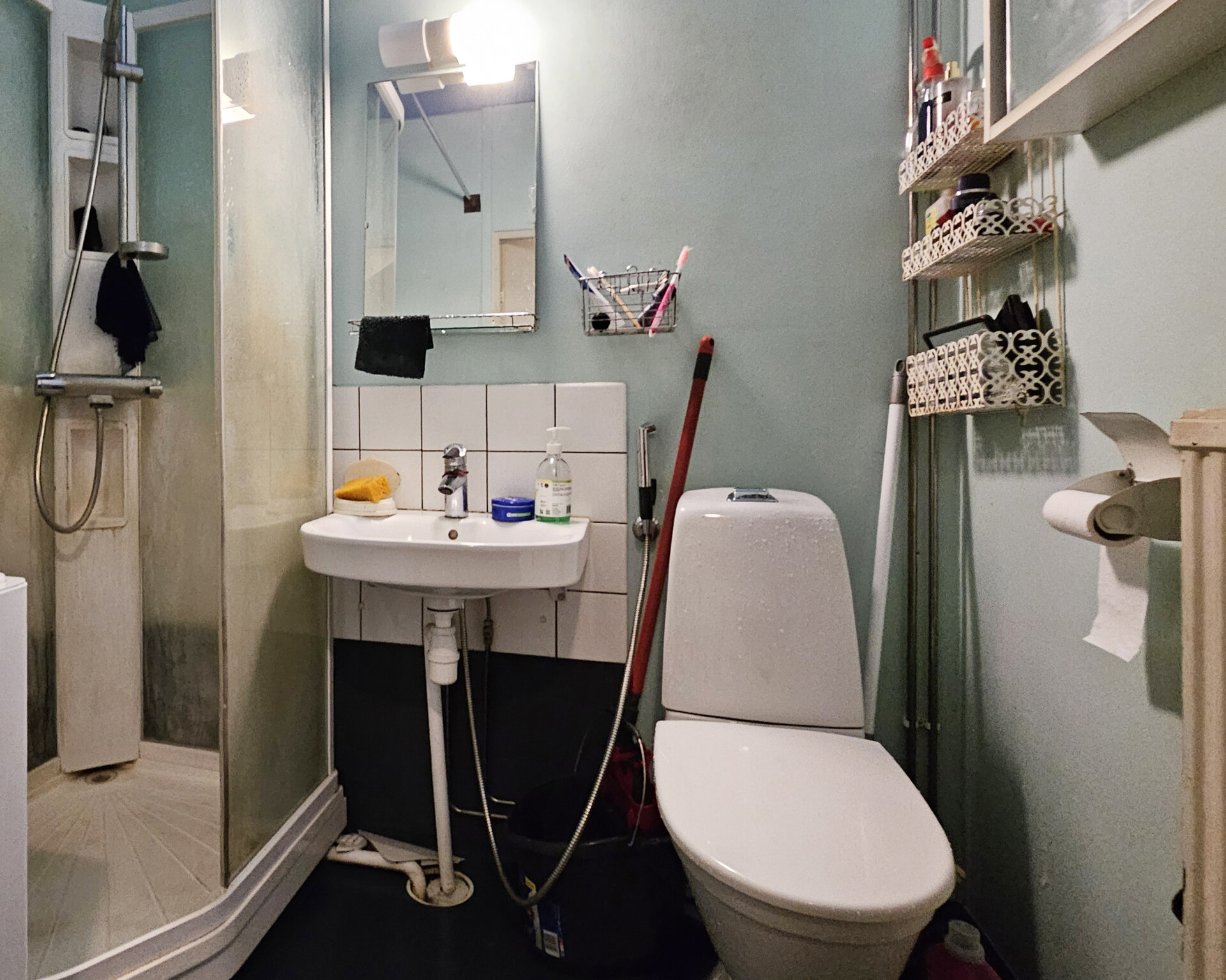 - Utrustning: Duschskåp, tvättmaskinsanslutning, wc, spegel