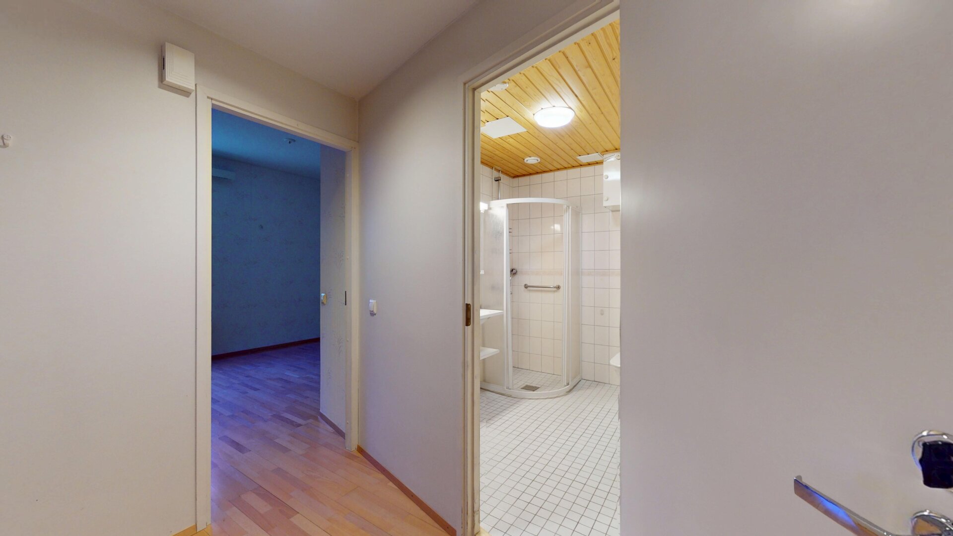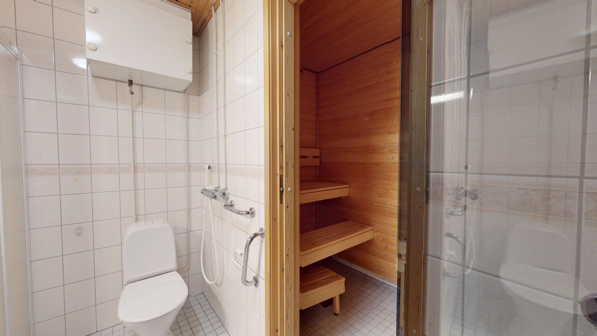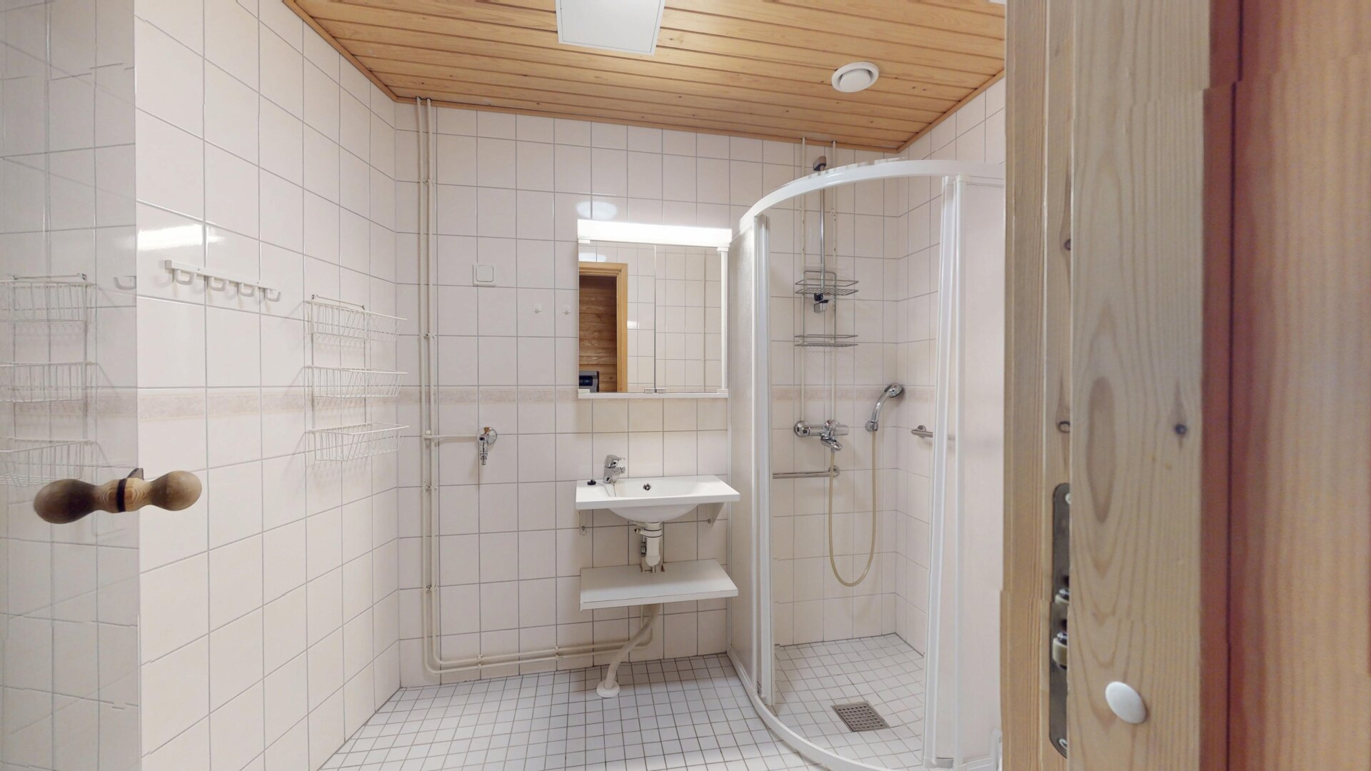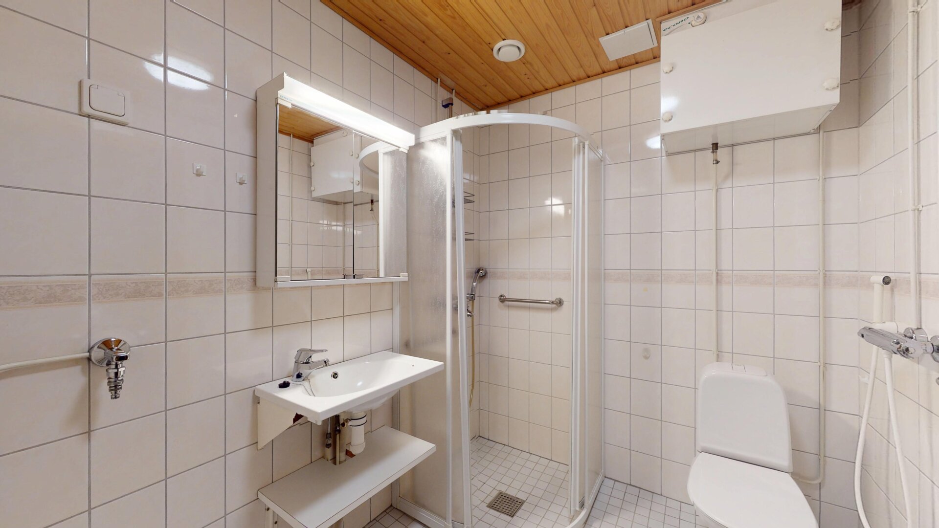 - Utrustning: Duschvägg, tvättmaskinsanslutning, wc, dusch, spegelskåp