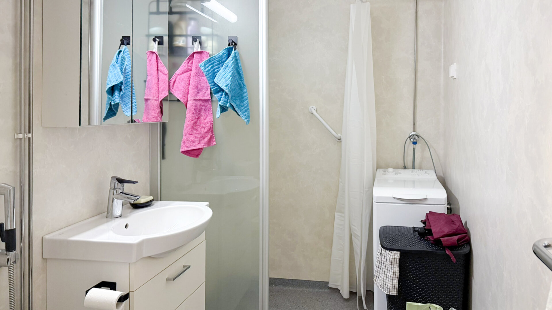 - Utrustning: Duschvägg, tvättmaskinsanslutning, wc, spegelskåp