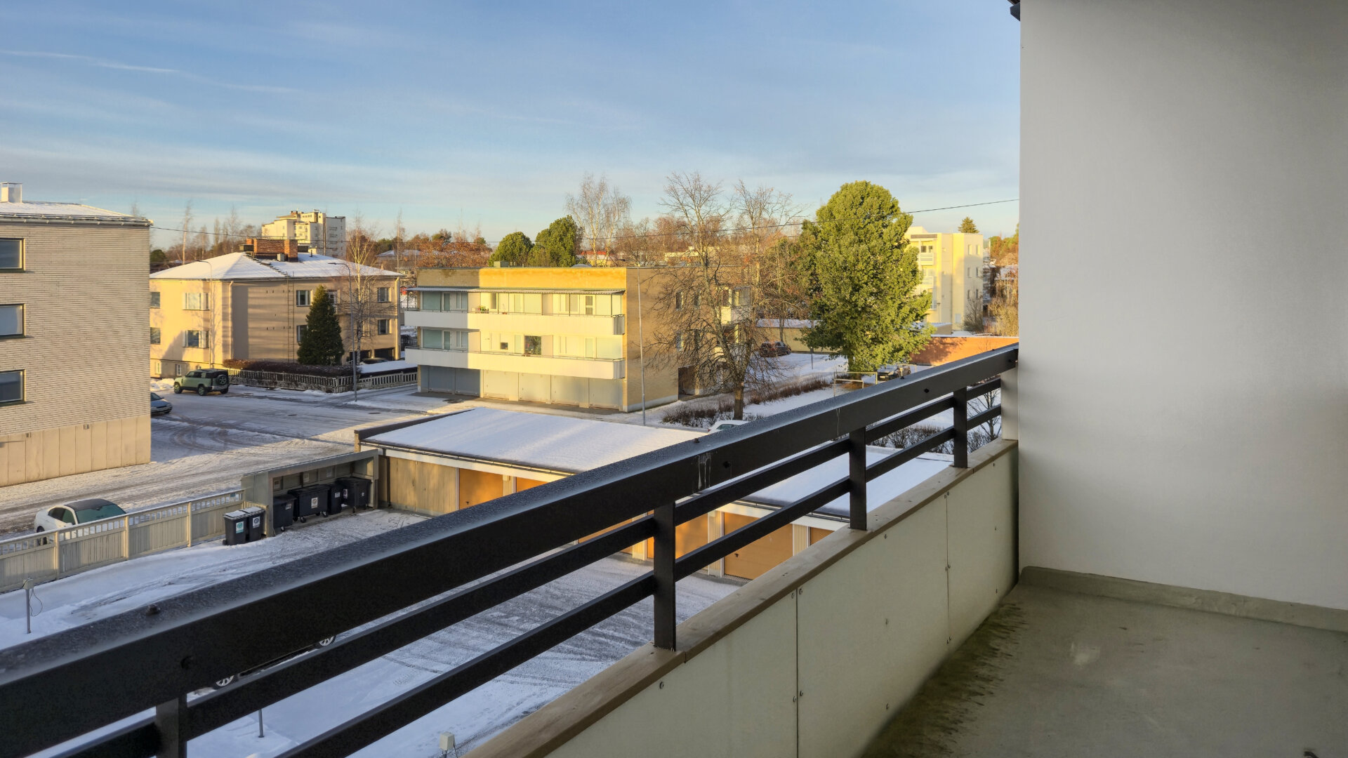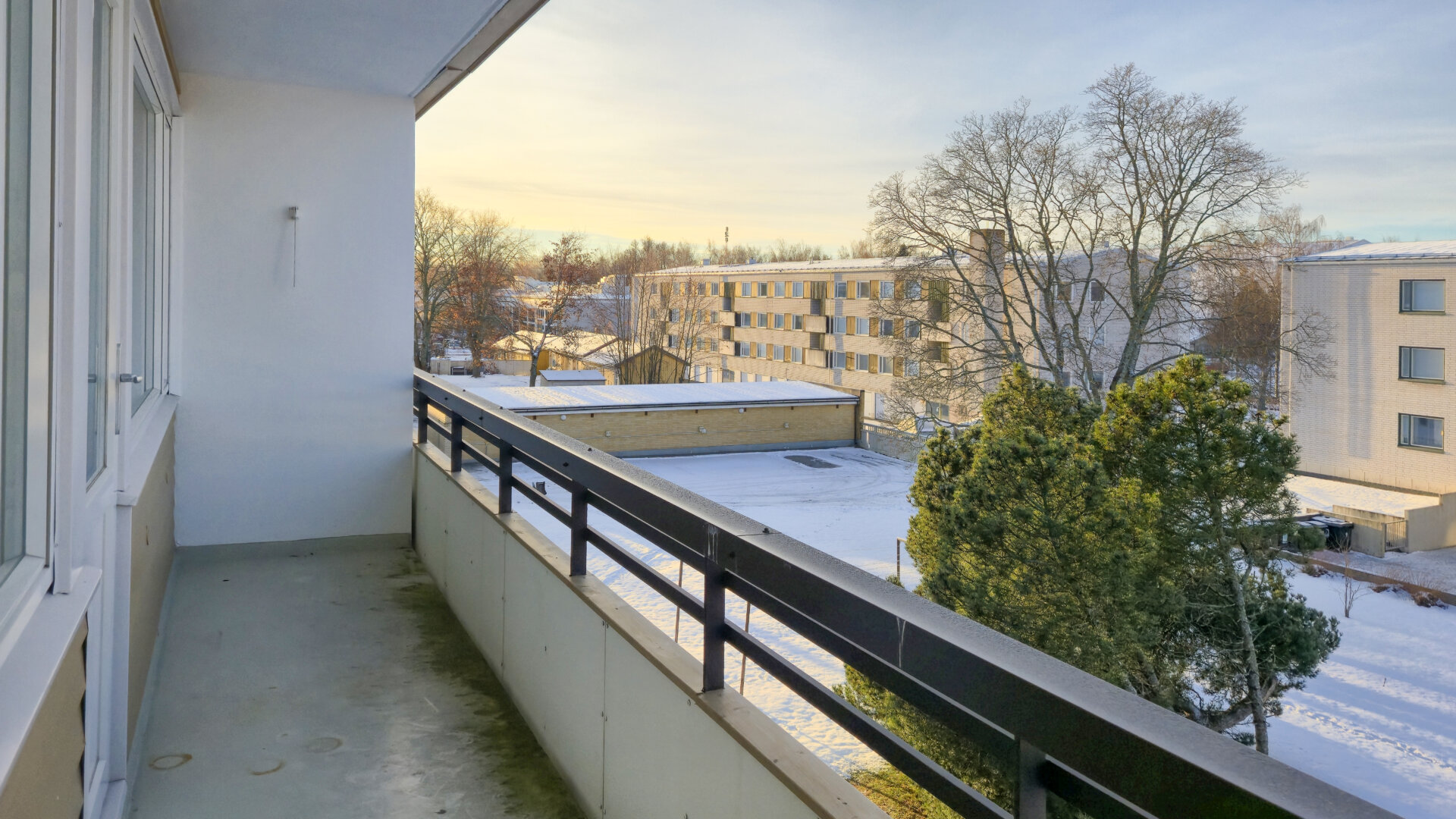 Lägenheten är belägen i tredje våningen och har en stor balkong med västläge mot innergården.