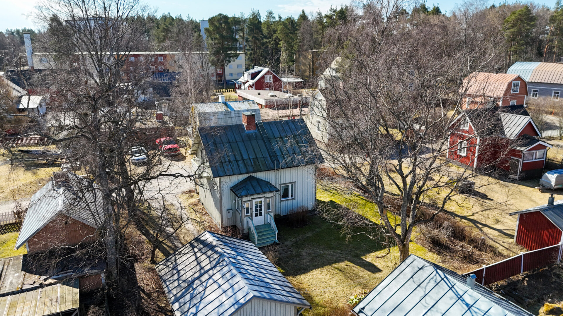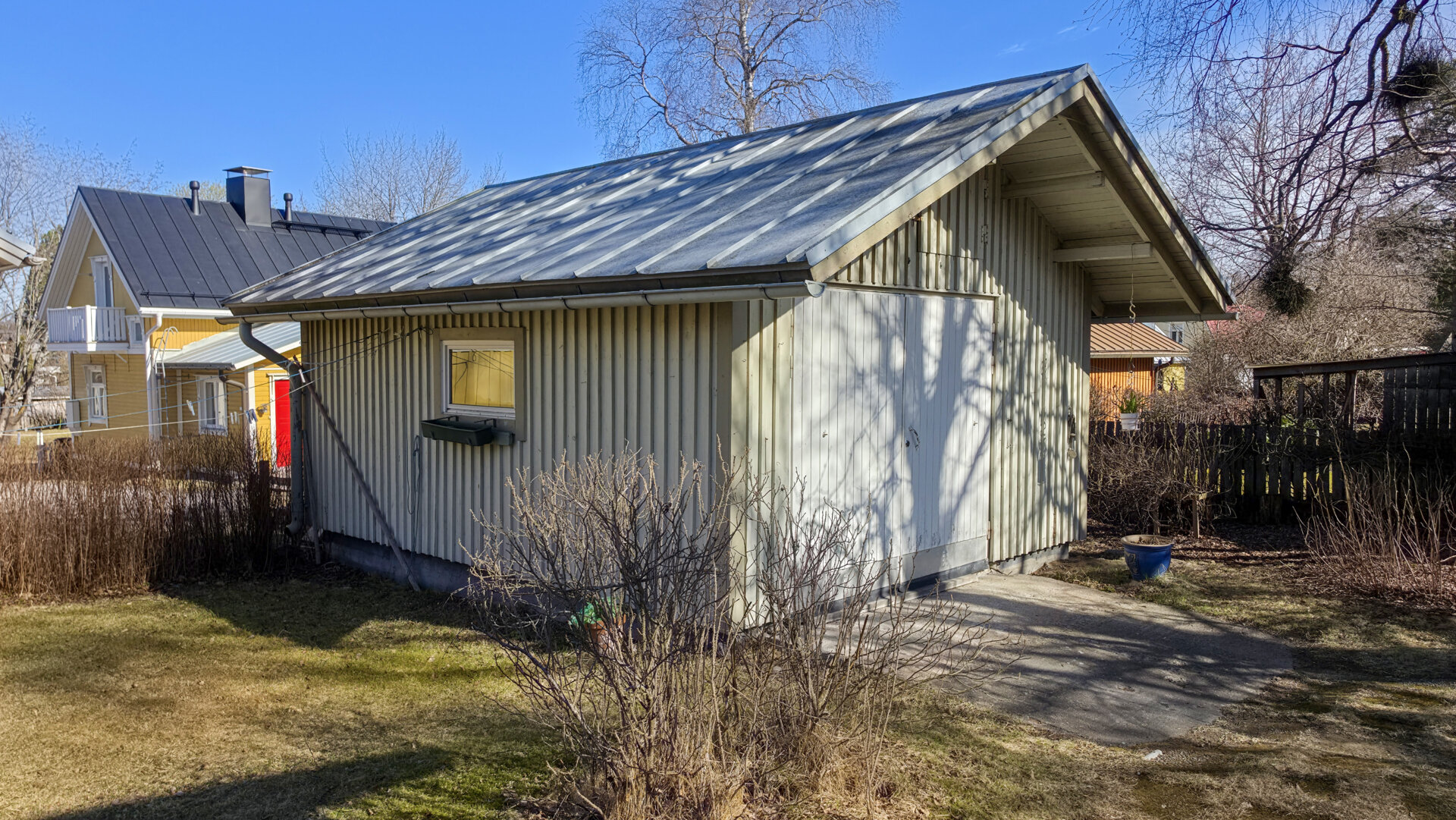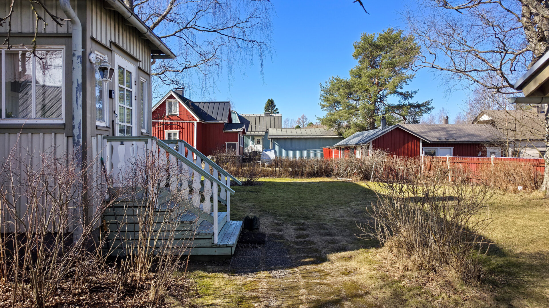 Planlösningen omfattar 3 rum och kök samt badrum/bastu, två wc och hall, totalt ca 70/85 m² på egen fin tomt med separat garage/förrådsbyggnad.