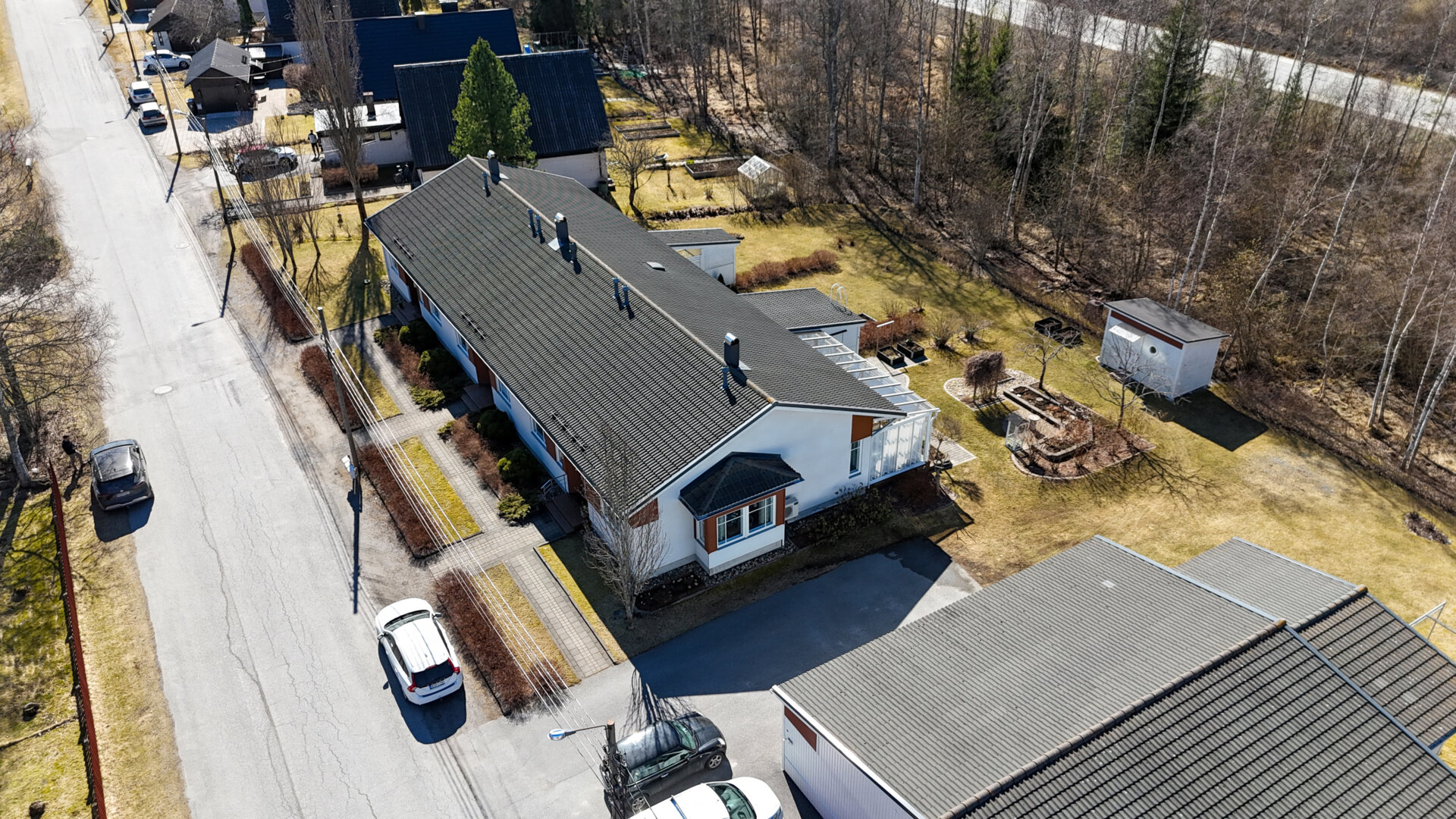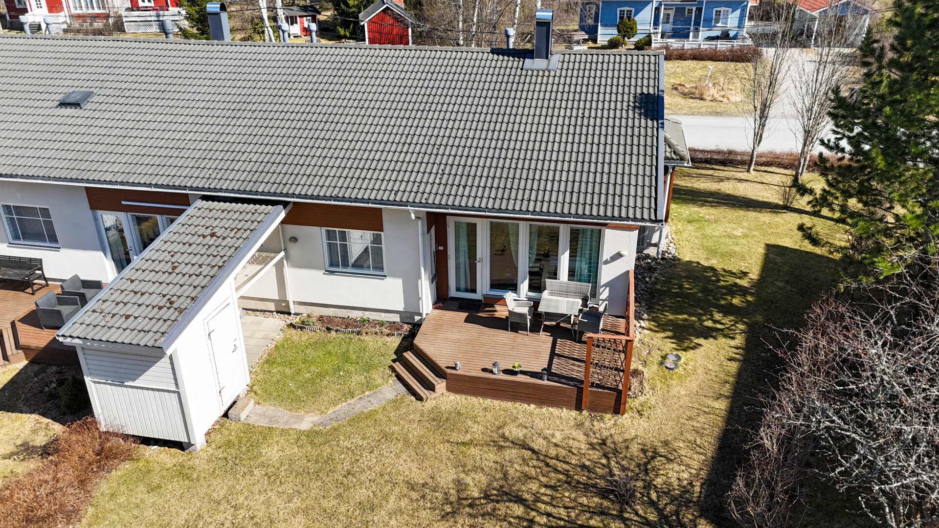 Solig gårdsplan mot väster med terrass och förråd samt goda möjligheter för planteringar och odlingar. Till bostaden hör även ett varmt garage om 18 m2 och ett förrådsfack. Husbolaget har även en gemensam robotgräsklippare.