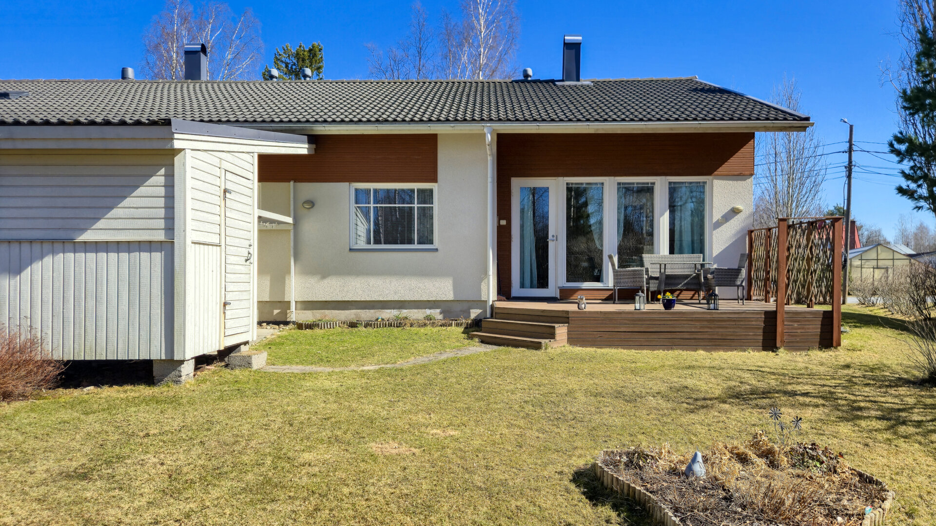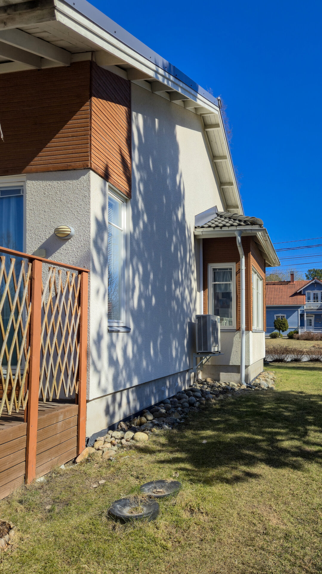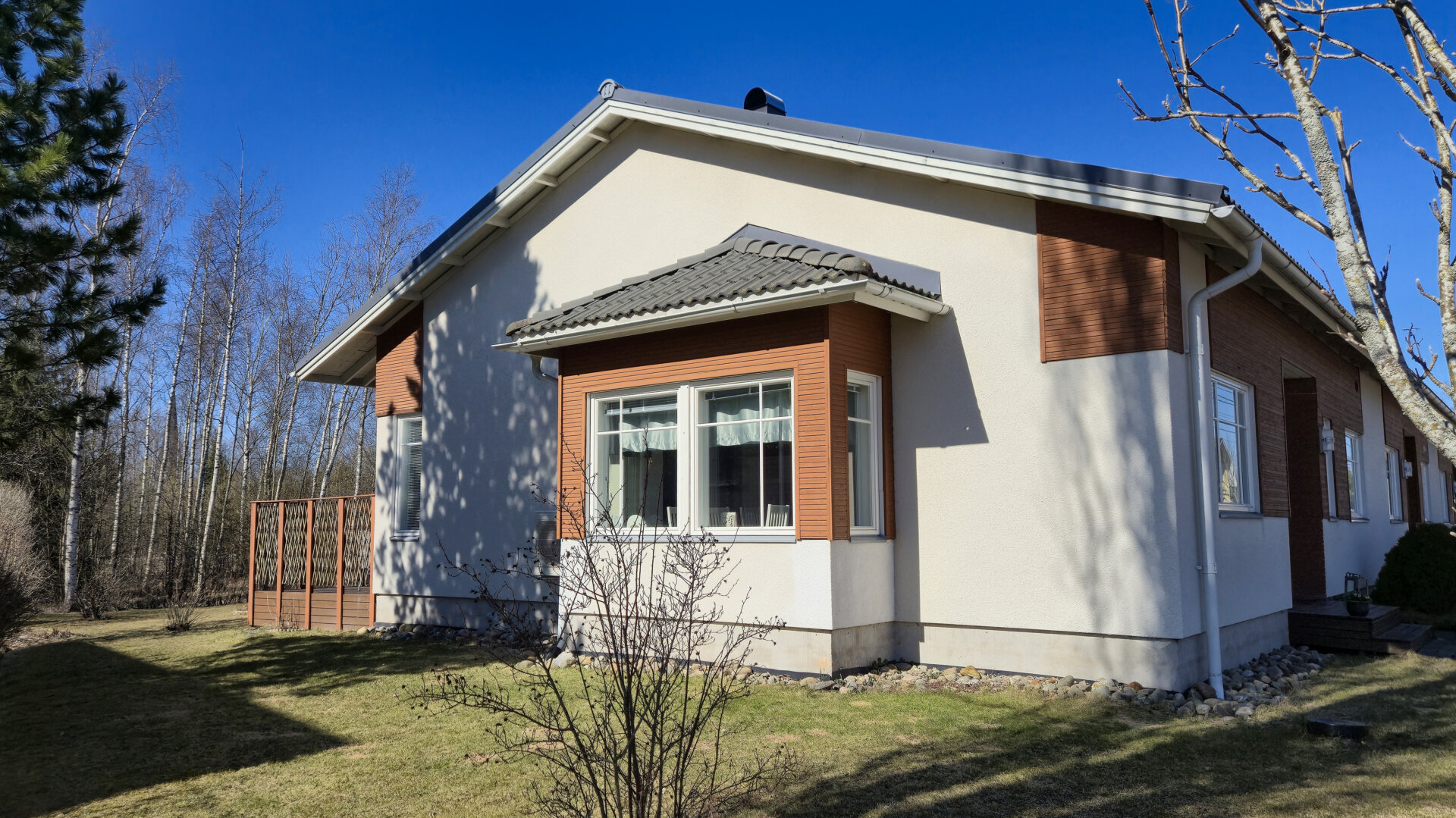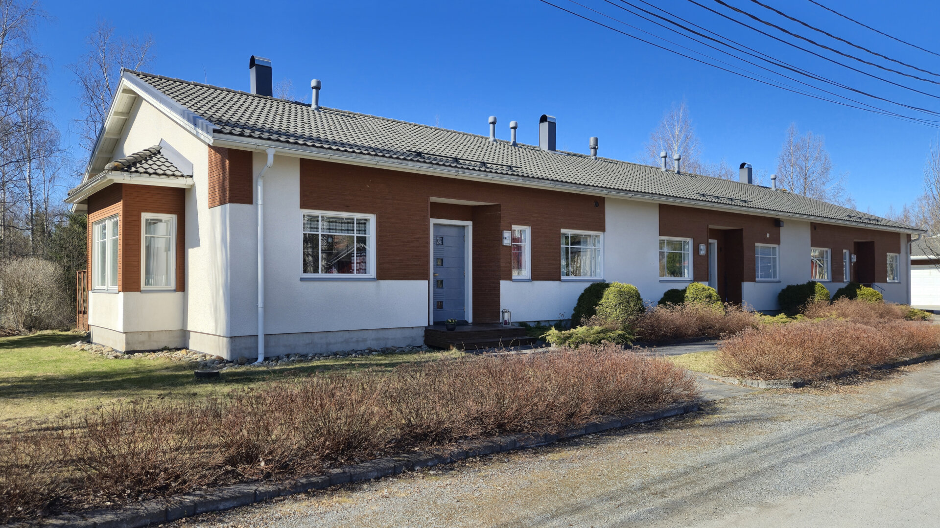 Det här radhuset med totalt tre bostäder är byggt 2006. Bostaden är 101,5 m2 och består av två sovrum, vardagsrum, ett rymligt kök, hjälpkök, badrum och bastu. Öppen planlösning med rikligt ljusinsläpp och förhöjt innertak i vardagsrummet, som ger en härlig känsla av rymd.