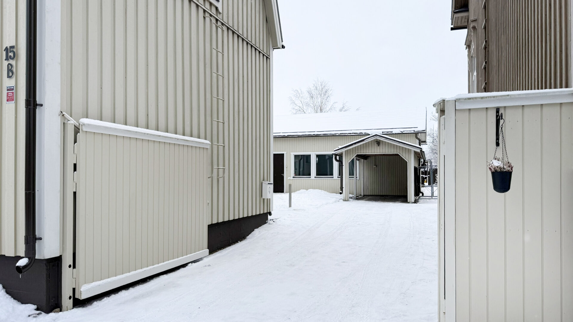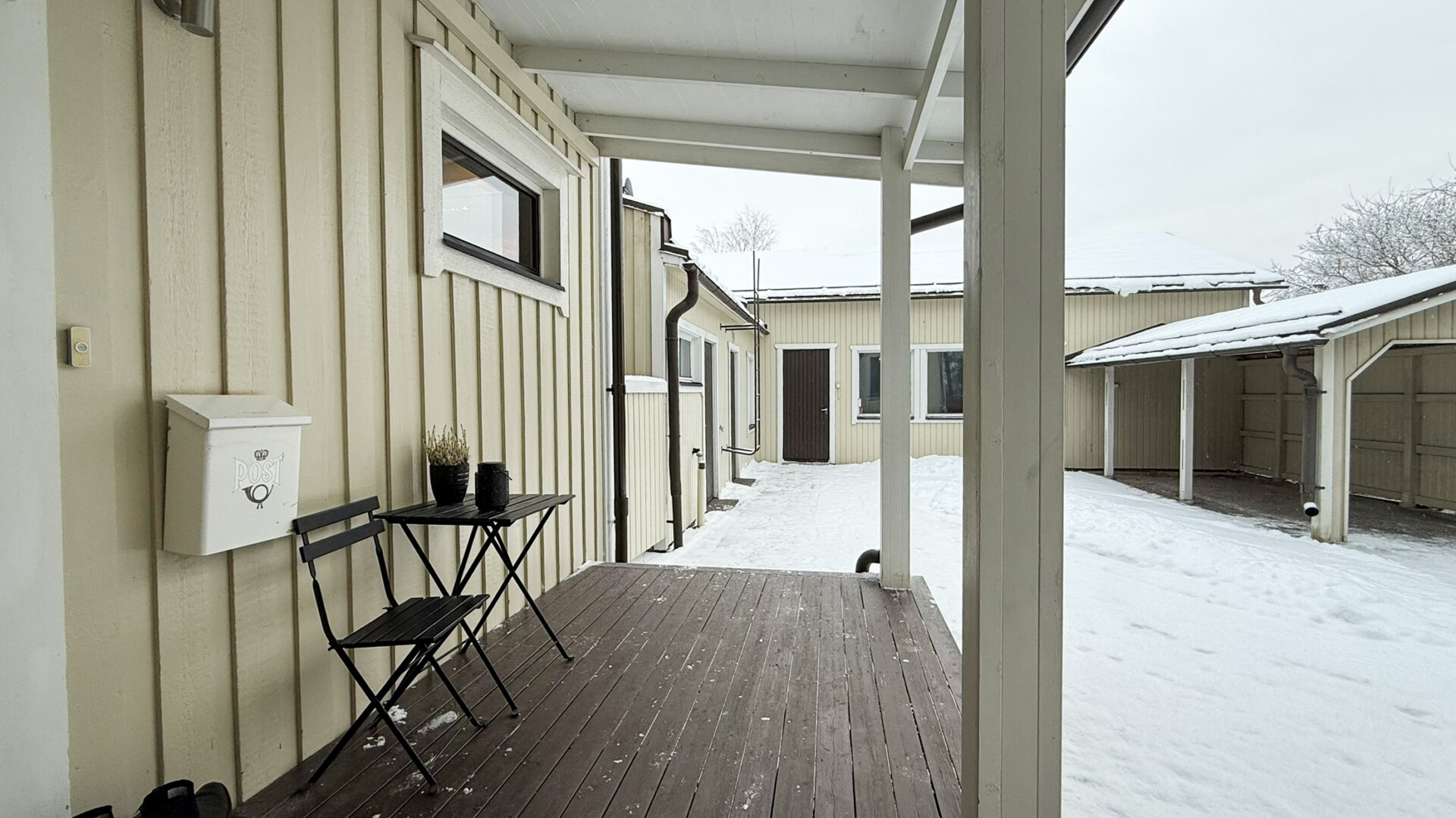 Den egna, insynsskyddade tomten på 469 m² är både lättskött och trivsam, och på innergården finns ett praktiskt biltak.