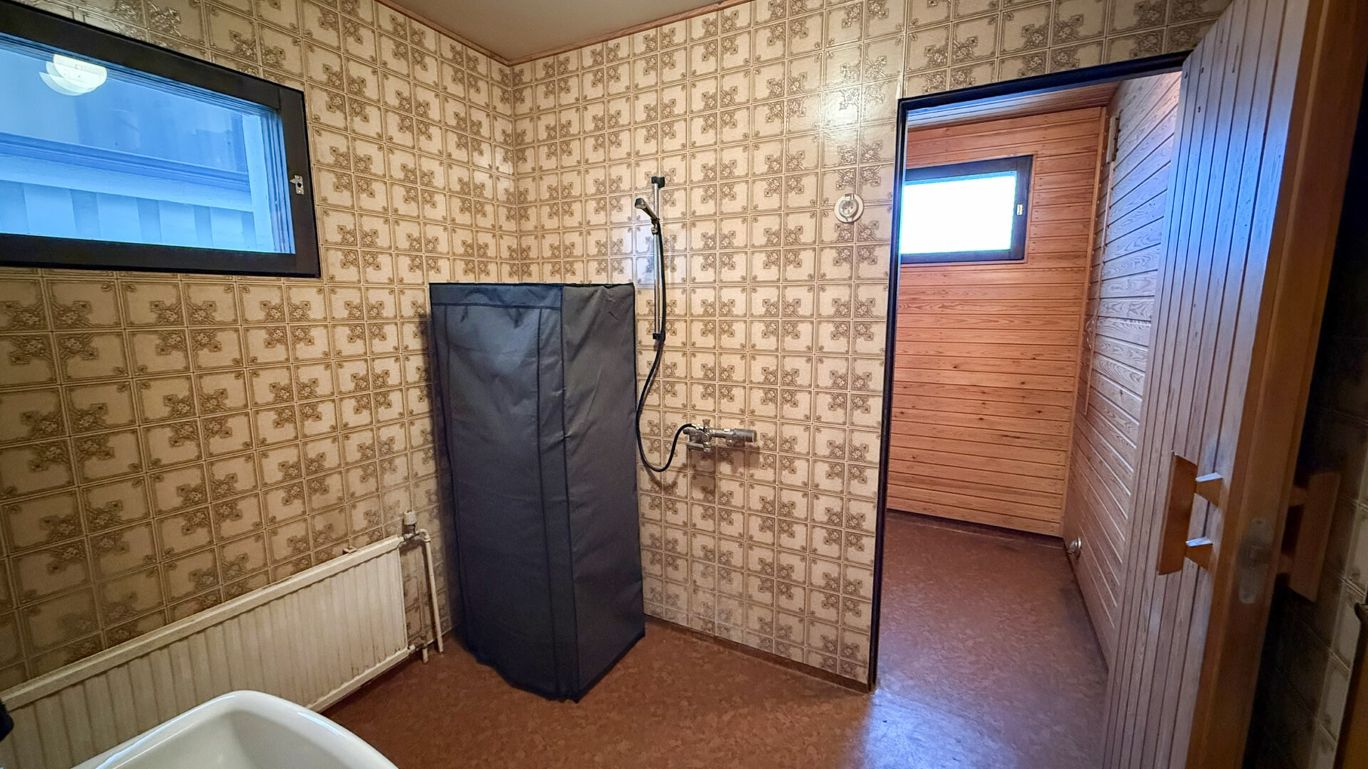 - Bastu (panel/plastmatta) och tvättrum (plastmatta) finns i den separata ekonomibyggnaden.
