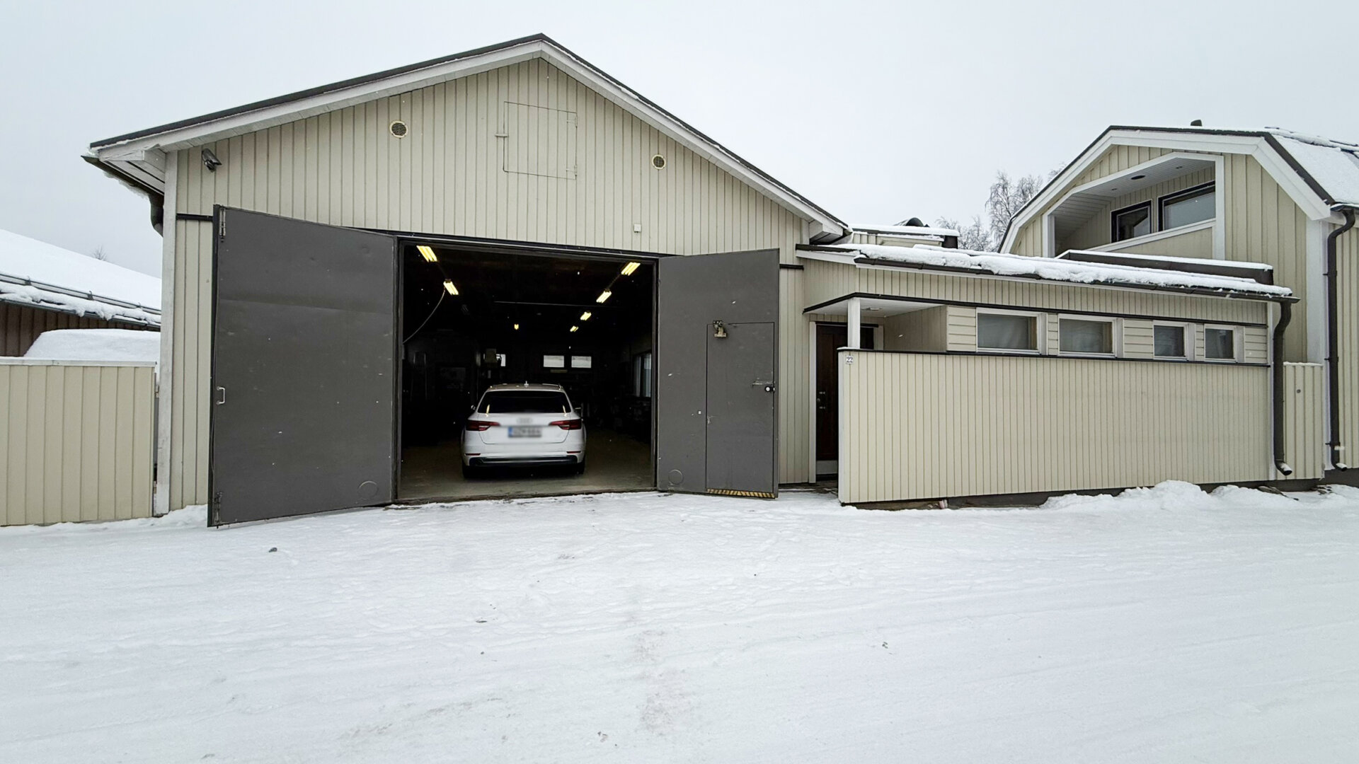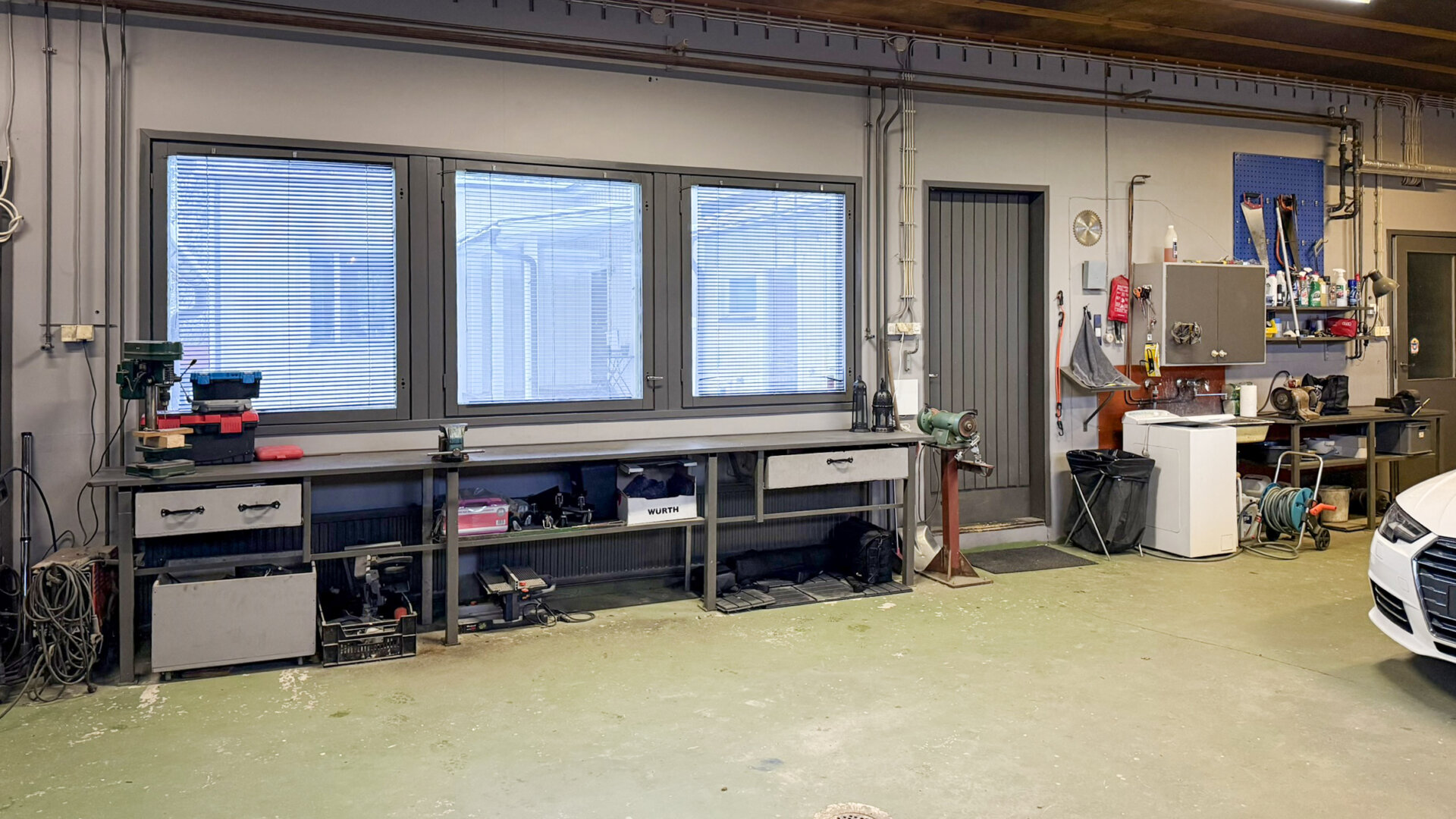 Den tidigare verkstadsbyggnaden, uppförd 1975/76, är isolerad och uppvärmd och erbjuder utmärkta möjligheter för mångsidig verksamhet. Här finns verkstad/garage på ca 90 m², två kontorsrum och wc i direkt anslutning till garagedelen. Med separat ingång finns dessutom omklädningsrum, tvättrum, bastu och ett tidigare pannrum. Totalyta ca 125/135 m².