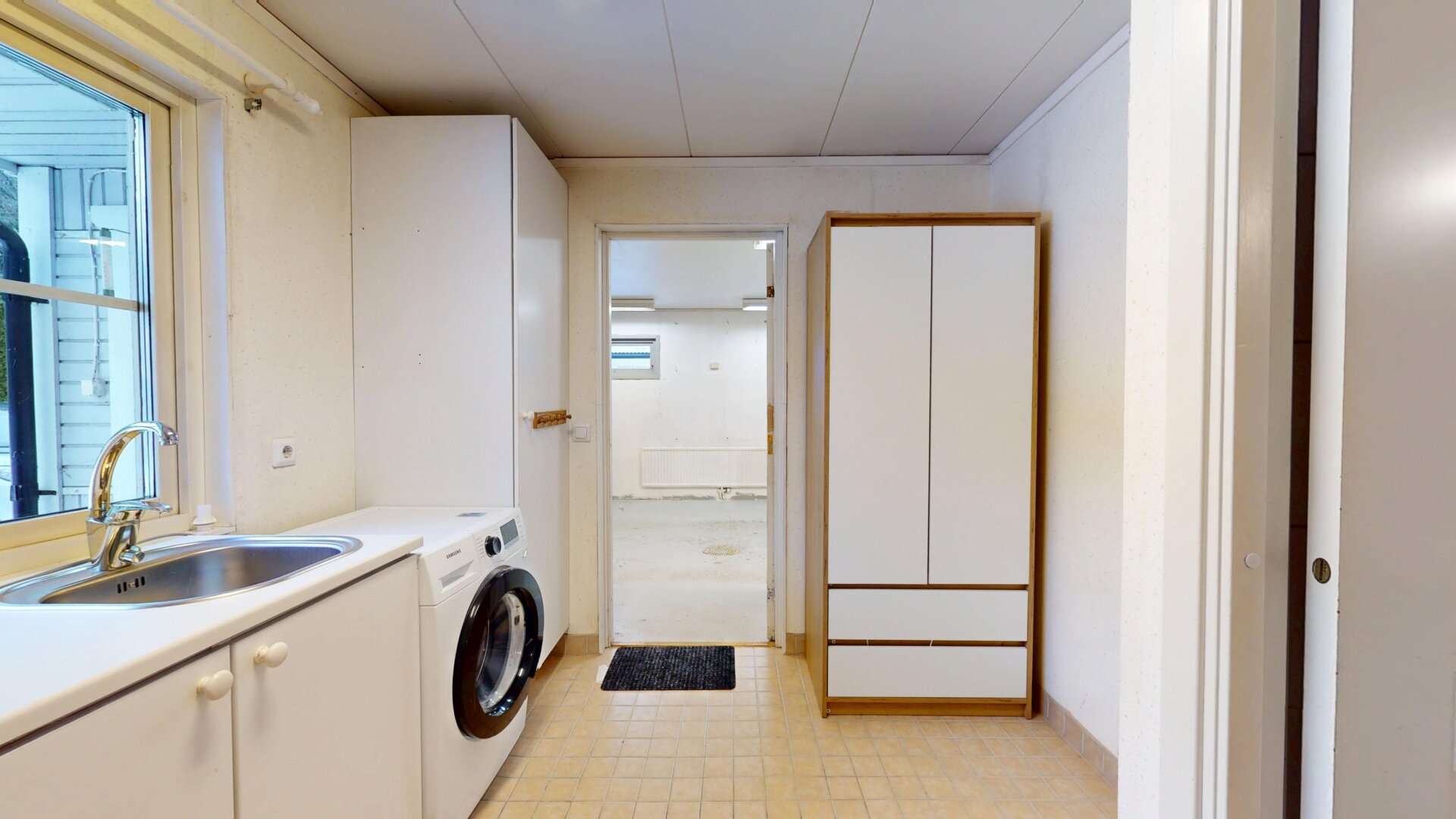 - Utrustning: Tvättmaskin, tvättmaskinsanslutning, golvvärme, bänk