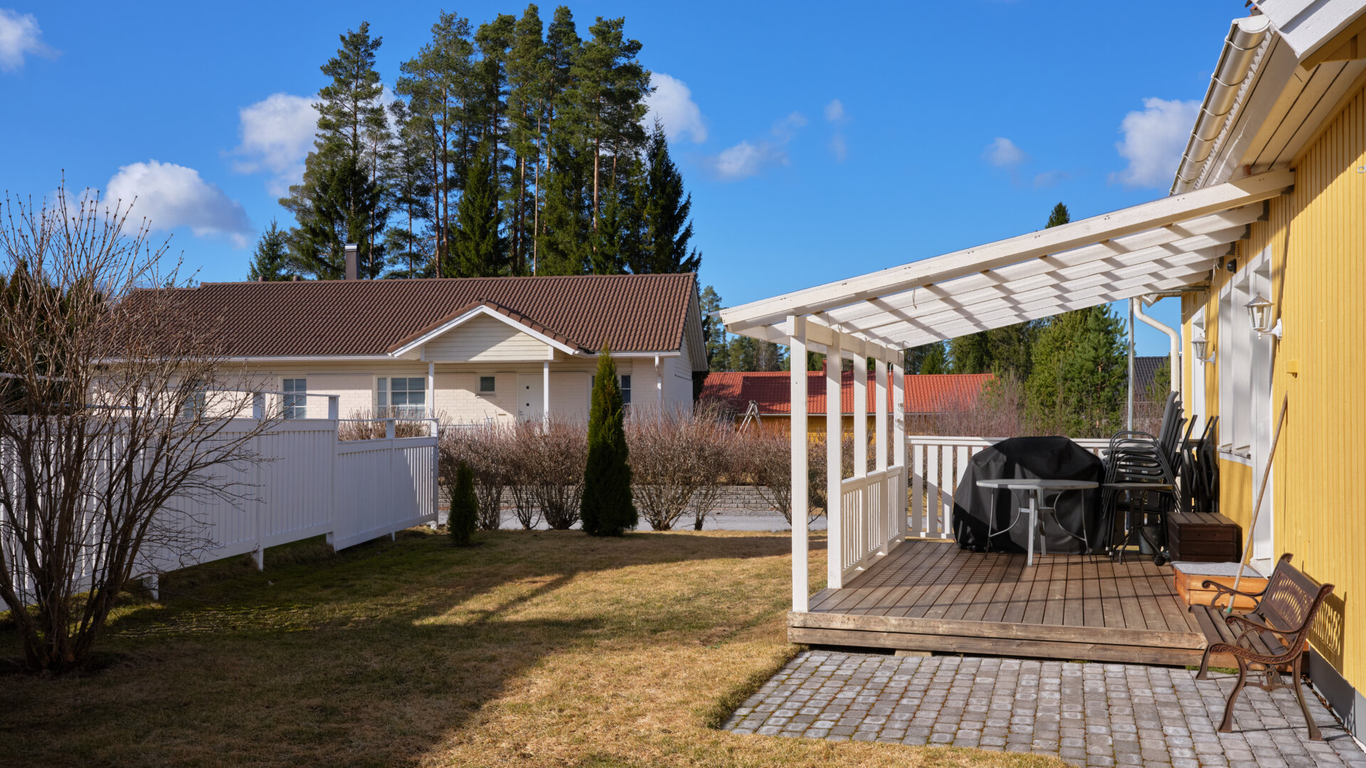 På den fina tomten finns asfalterad infart samt separat garage om ca 36 m² som ger goda förvarings- och parkeringsmöjligheter.
