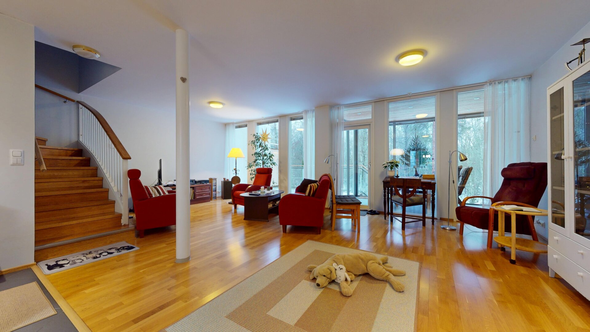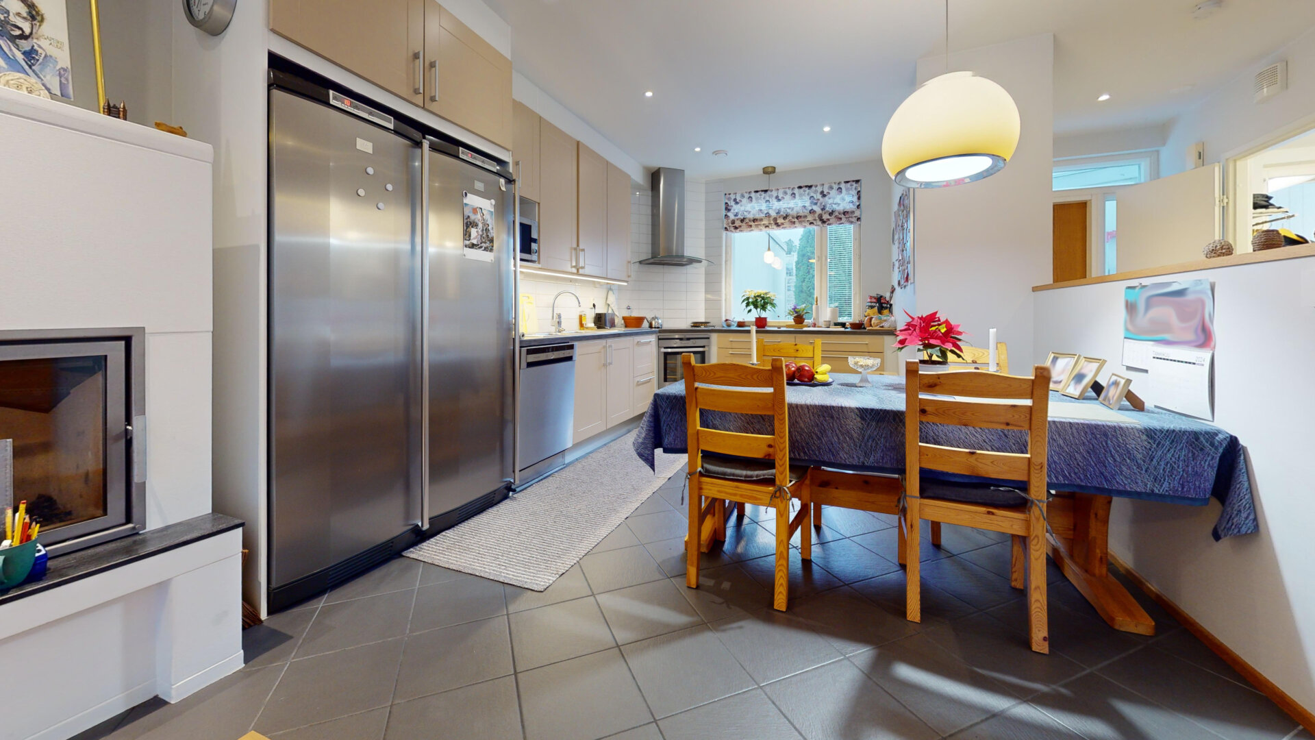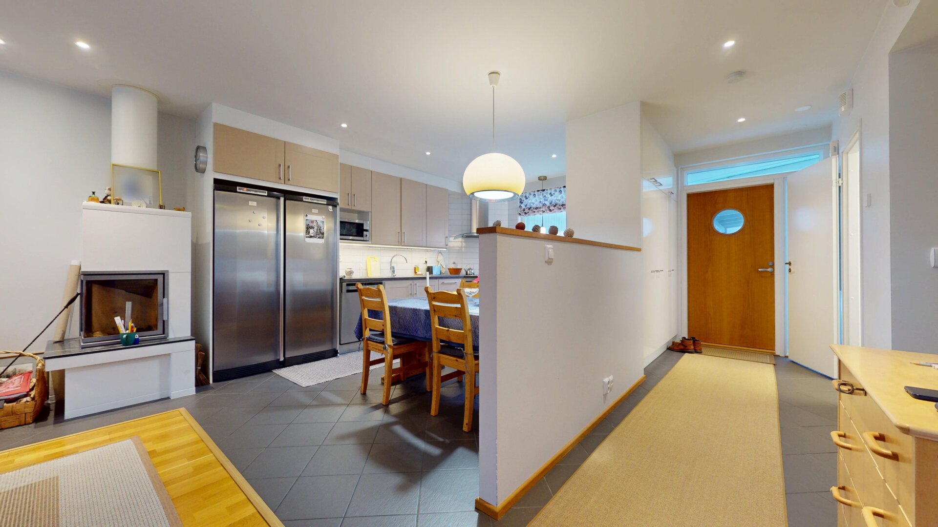 Bostaden erbjuder ljus och öppen planlösning fördelat på 135 m² med 4 rum och kök, badrum/wc/bastu, separat wc och hjälpkök med golvvärme i hela bostaden samt varmt garage om 19 m².