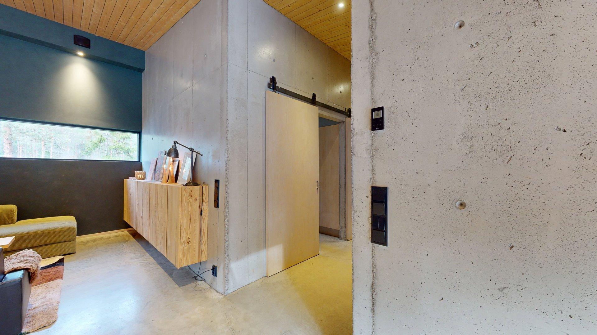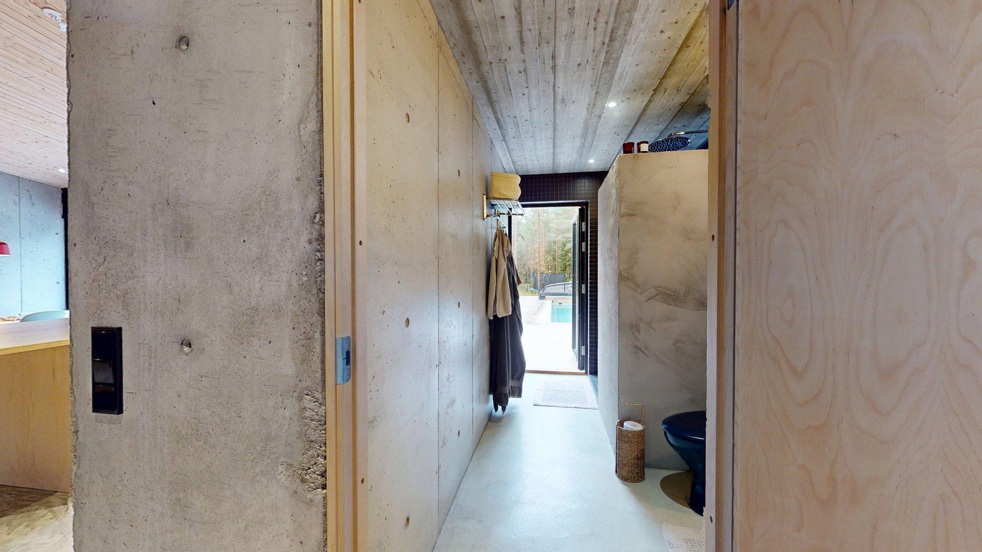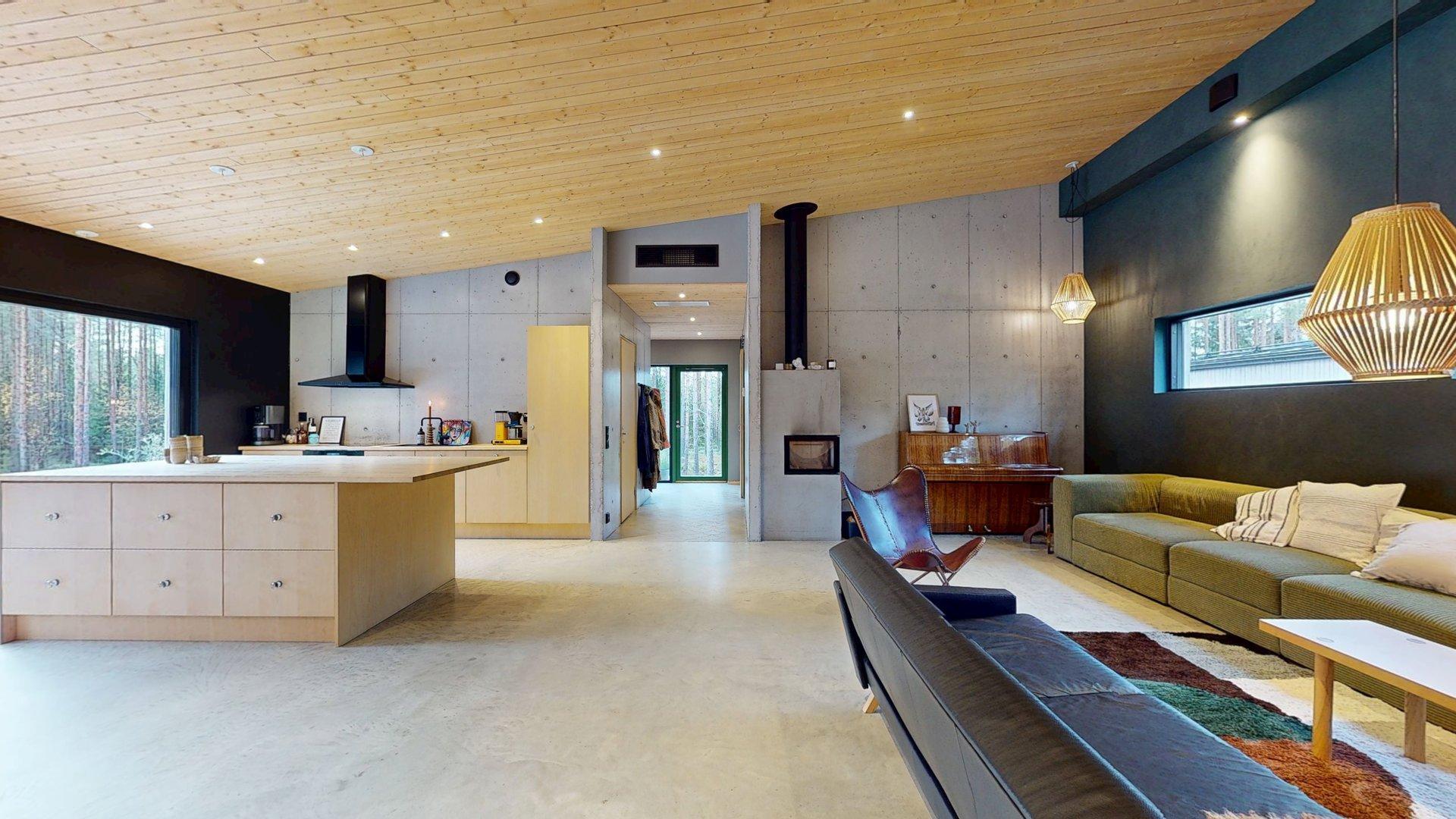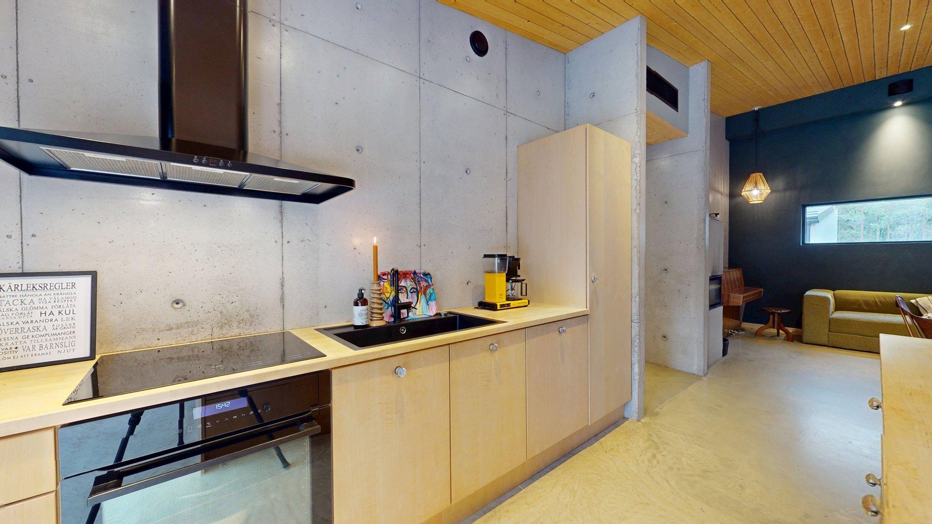 Huset är byggt i ett plan och rymmer fyra sovrum, ett luftigt stugkök med öppen planlösning, två badrum varav ett med bastu, samt ett praktiskt grovkök. Boytan är 139 m² (158 m² totalyta). Inomhus möts du av slipade betonggolv och väggar en stilren, hållbar och lugn känsla som håller över tid, stora fönster som mot söder och med utsikt som bjuder på naturens årstidsväxlingar.